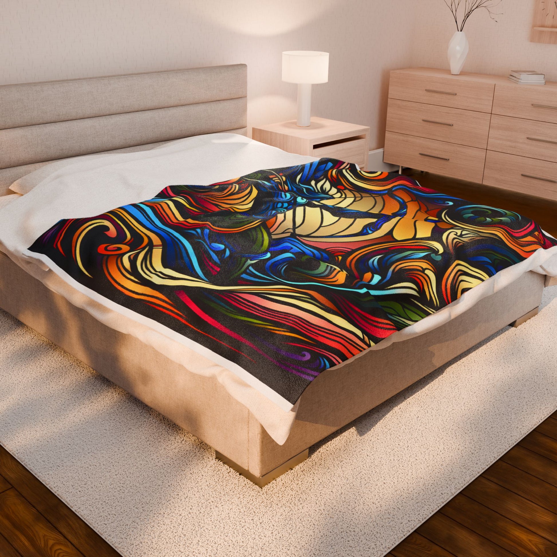 A vibrant, swirling tapestry of color and form, depicting an archer poised mid-action. The image blends dynamic movement and intricate lines, reminiscent of stained glass, capturing a mythical essence in a whirl of blues, reds, and yellows, set against a radiant backdrop. Create a cozy and warm atmosphere at home with this plush velveteen blanket. It is soft to touch and perfect for any home. Customize with a one-sided print to add your personal touch or create a gift for your friends and family. Available in three sizes: 30x40", 50x60", 60x80".