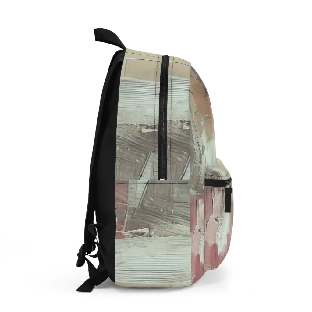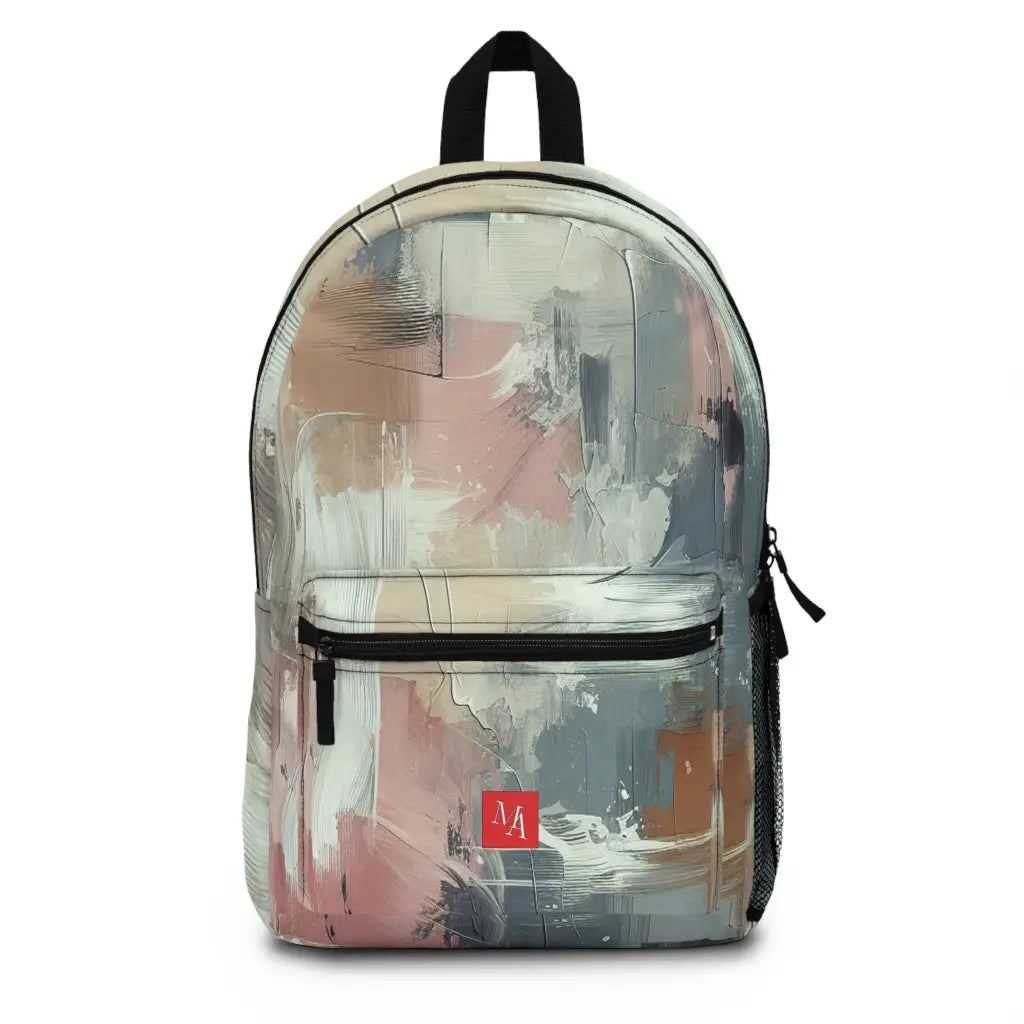 This abstract artwork features dynamic brushstrokes blending soft pastels and muted earth tones, creating an intricate texture. Its layered composition, with fluid lines and rough patches, evokes a sense of movement and depth, transforming chaos into harmonious beauty. Introducing the ultimate backpack for fashion-forward adventurers! Our backpack boasts a striking textile design that will make a statement wherever you go. With its durable construction and spacious compartments, it is perfect for carrying all your essentials. Get ready to turn heads and stay organized with our backpack. #textiledesign #backpack #fashionforward #adventure #durable #spacious #statementpiece #organized #essentials #travel #explore