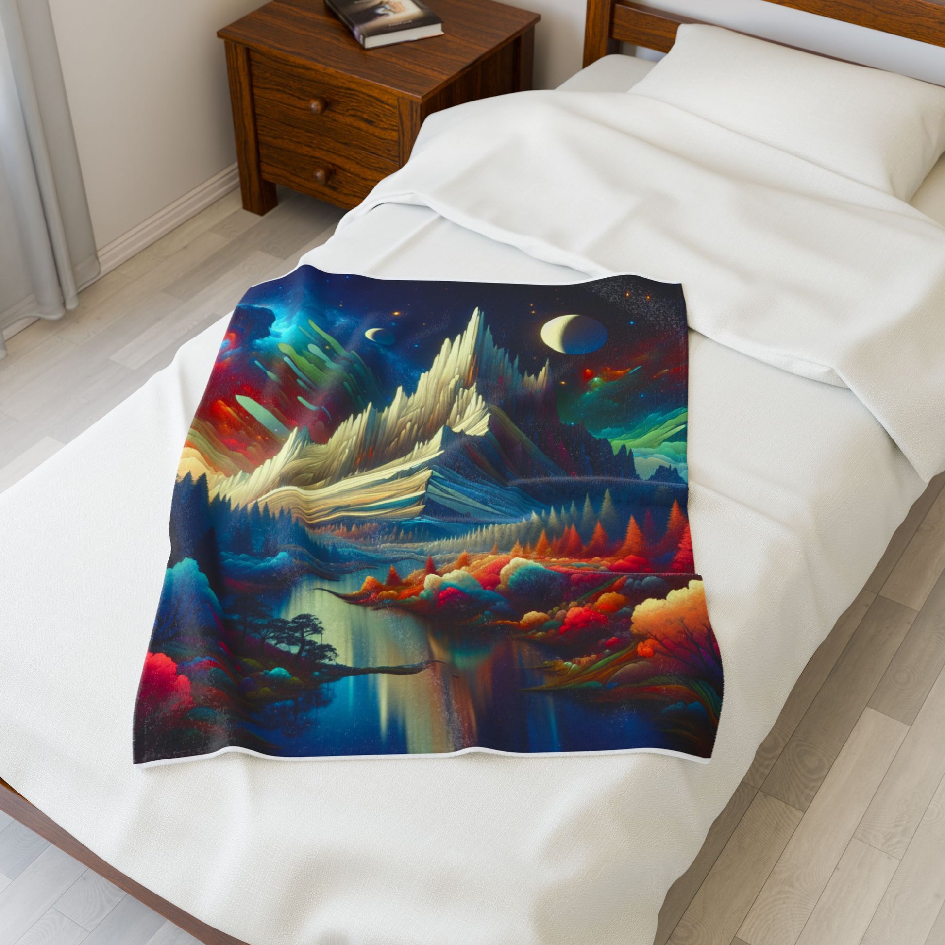 Majestic, multicolored peaks rise under a starlit sky, adorned with swirling nebulas and distant planets. Below, a vibrant forest and reflective river create a whimsical, otherworldly landscape. Rich gradients blend seamlessly, crafting an awe-inspiring blend of reality and fantasy. Create a cozy and warm atmosphere at home with this plush velveteen blanket. It is soft to touch and perfect for any home. Customize with a one-sided print to add your personal touch or create a gift for your friends and family. Available in three sizes: 30x40", 50x60", 60x80".