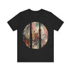 A circular abstract composition with splattered textures and layered geometric patterns. It merges earthy and pastel tones, creating dynamic movement through swirls, orbs, and linear elements, evoking a sense of cosmic harmony and artistic spontaneity.. This classic unisex jersey short sleeve tee fits like a well-loved favorite. Soft cotton and quality print make users fall in love with it over and over again. These t-shirts have-ribbed knit collars to bolster shaping. The shoulders are tapered for a better fit over time. Dual side seams hold the garment's shape for longer.