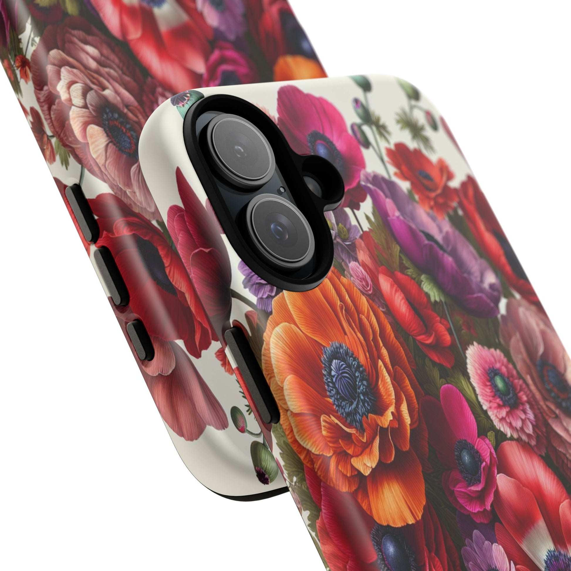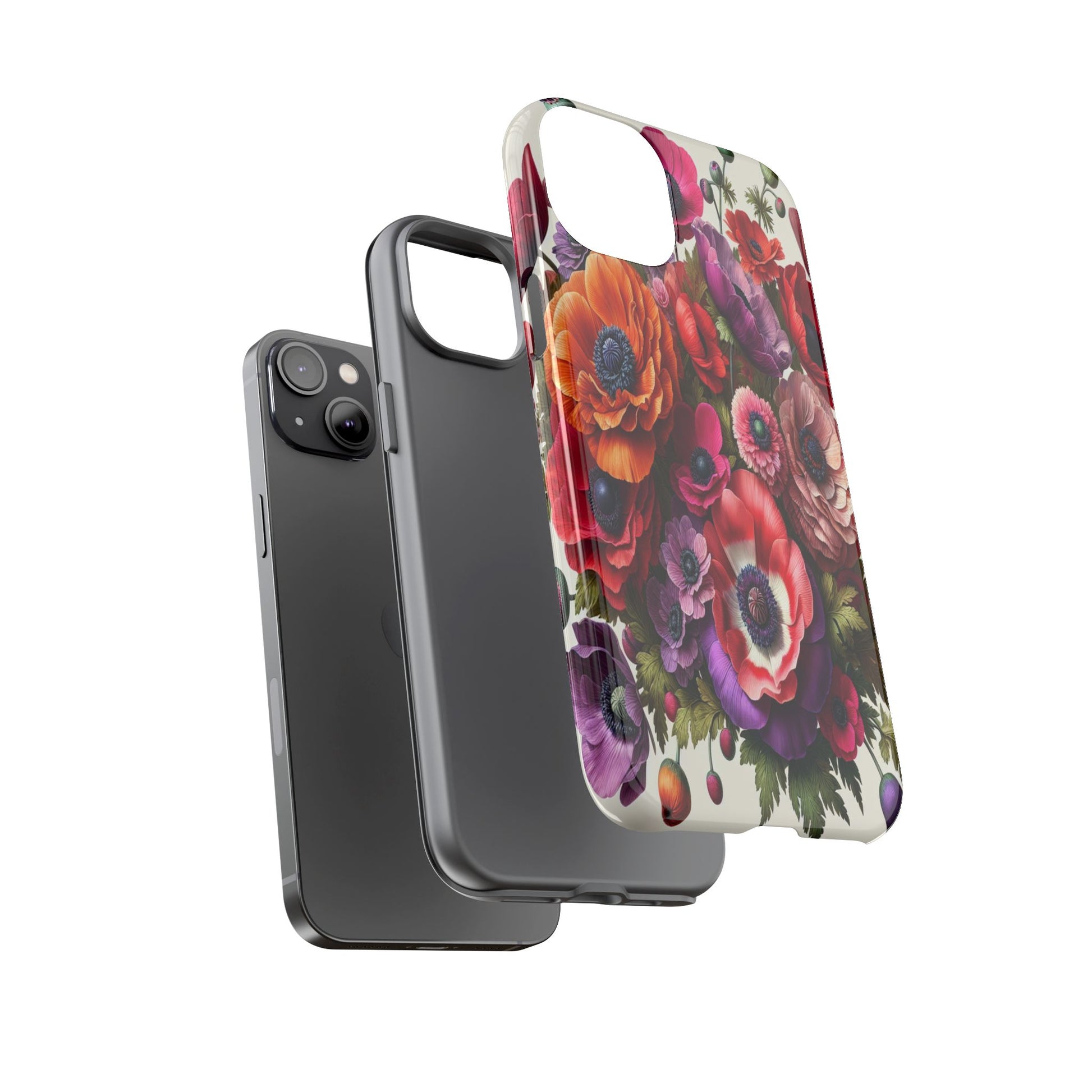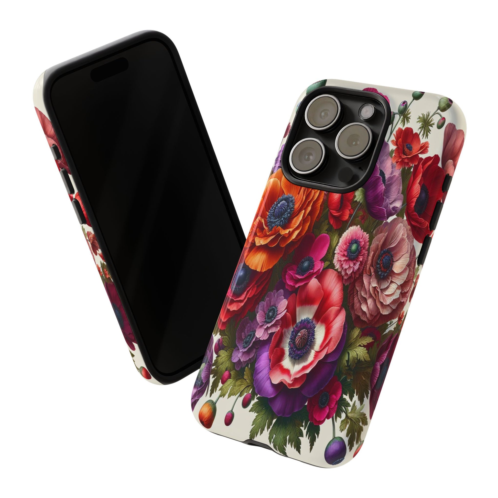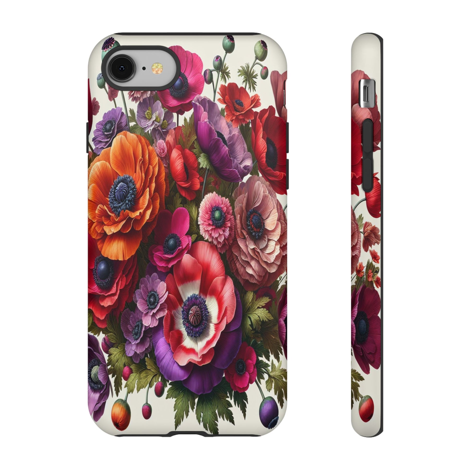 A stunning floral arrangement bursts with vibrant colors and intricate textures, showcasing a harmonious blend of vivid reds, purples, and oranges. Each petal is meticulously detailed, creating a mesmerizing tapestry of natural beauty and artistic elegance. iPhone, Samsung Galaxy, and Google Pixel devices with premium-quality custom protective phone cases. Every case has double layers for extra durability and protection while the clear, open ports stay out of your way when it comes to charging. The outer polycarbonate shell will resist daily impacts. Choose between matte or glossy finish and enjoy adding a unique touch to your phone with our custom protective phone cases sourced from Korea.