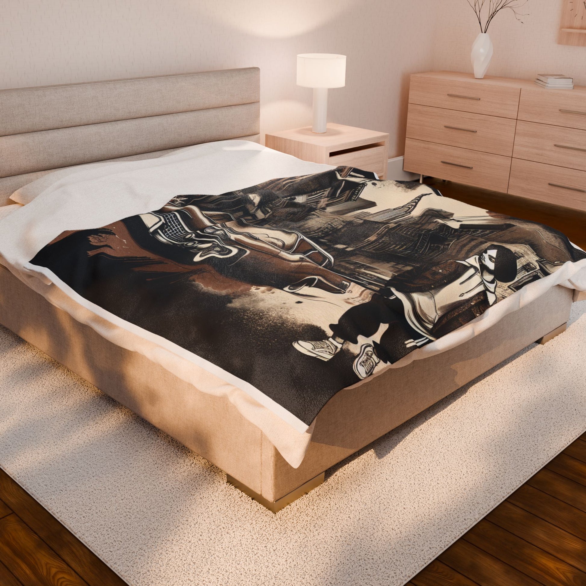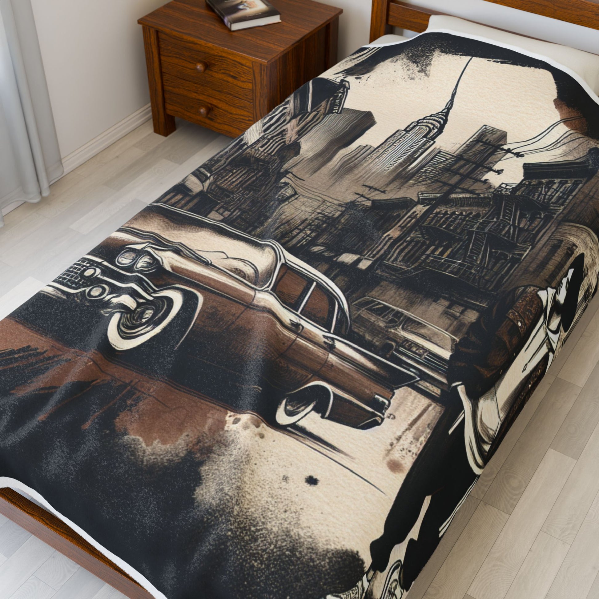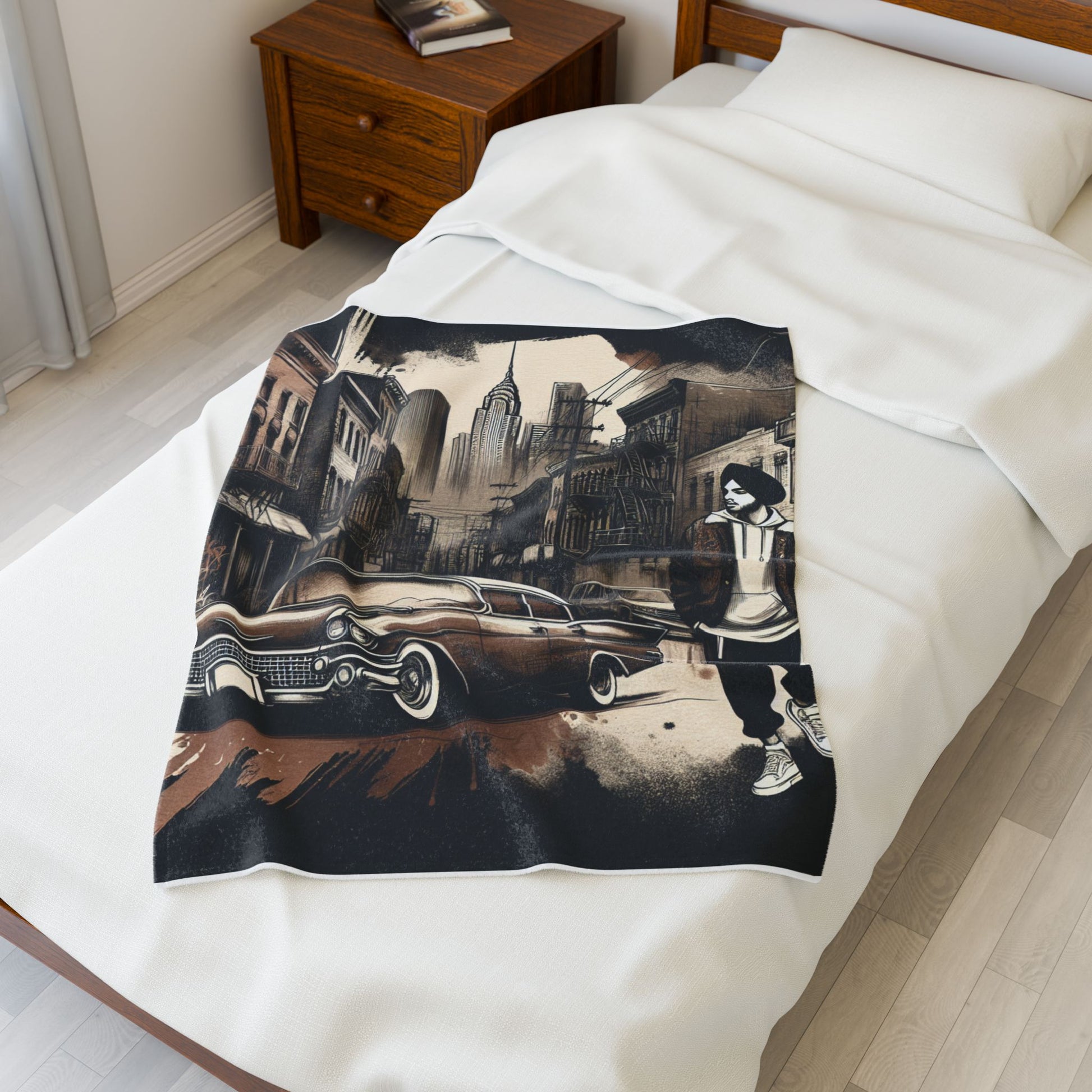 Urban nostalgia meets modern style in this artwork, blending a vintage car and classic architecture with contemporary street fashion. The monochrome palette, accented by dynamic brush strokes, creates a vivid contrast between past and present. Create a cozy and warm atmosphere at home with this plush velveteen blanket. It is soft to touch and perfect for any home. Customize with a one-sided print to add your personal touch or create a gift for your friends and family. Available in three sizes: 30x40", 50x60", 60x80".
