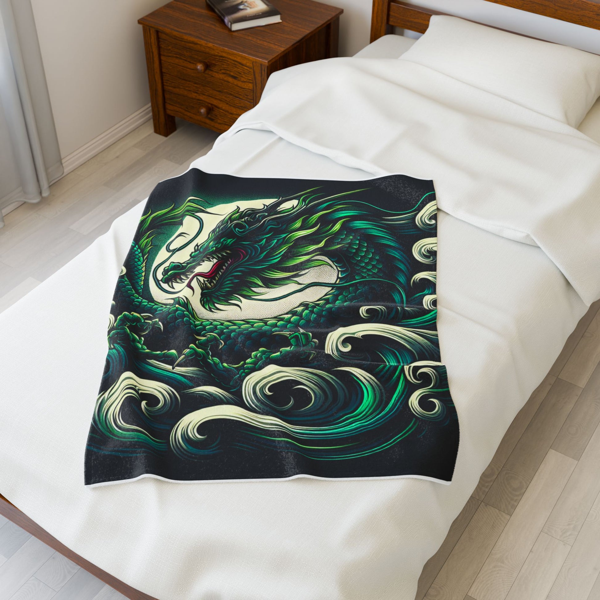 A majestic dragon swirls dynamically through turbulent waves, its scales shimmering in vivid blues and greens. The intricate details highlight its fierce expression, set against a luminous moon backdrop, blending fantasy and nature in a captivating, mythical scene. Create a cozy and warm atmosphere at home with this plush velveteen blanket. It is soft to touch and perfect for any home. Customize with a one-sided print to add your personal touch or create a gift for your friends and family. Available in three sizes: 30x40", 50x60", 60x80".