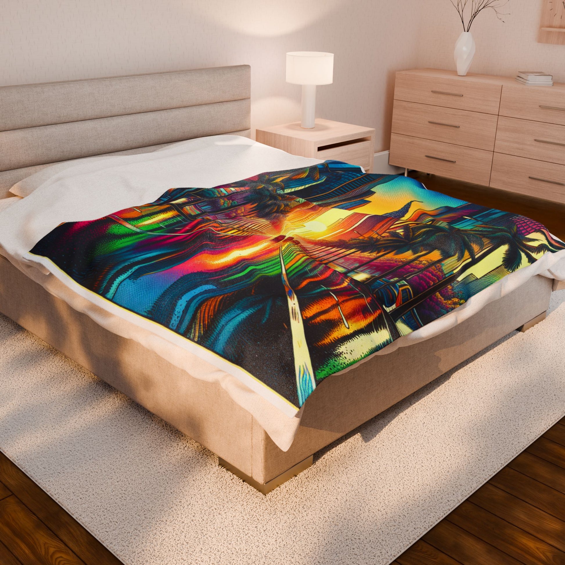 A vibrant, futuristic cityscape at sunset, the image features colorful reflections on a rain-soaked street, flanked by lush palm trees and towering skyscrapers. The vivid, neon hues create a captivating, dreamlike atmosphere, blending urban sophistication with tropical allure. Create a cozy and warm atmosphere at home with this plush velveteen blanket. It is soft to touch and perfect for any home. Customize with a one-sided print to add your personal touch or create a gift for your friends and family. Available in three sizes: 30x40", 50x60", 60x80".
