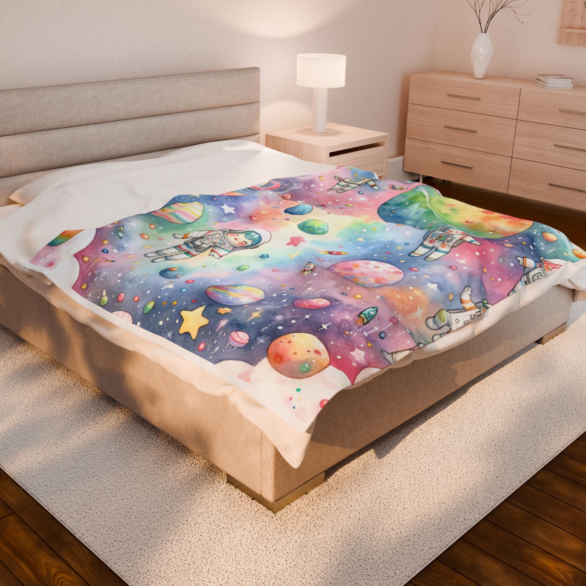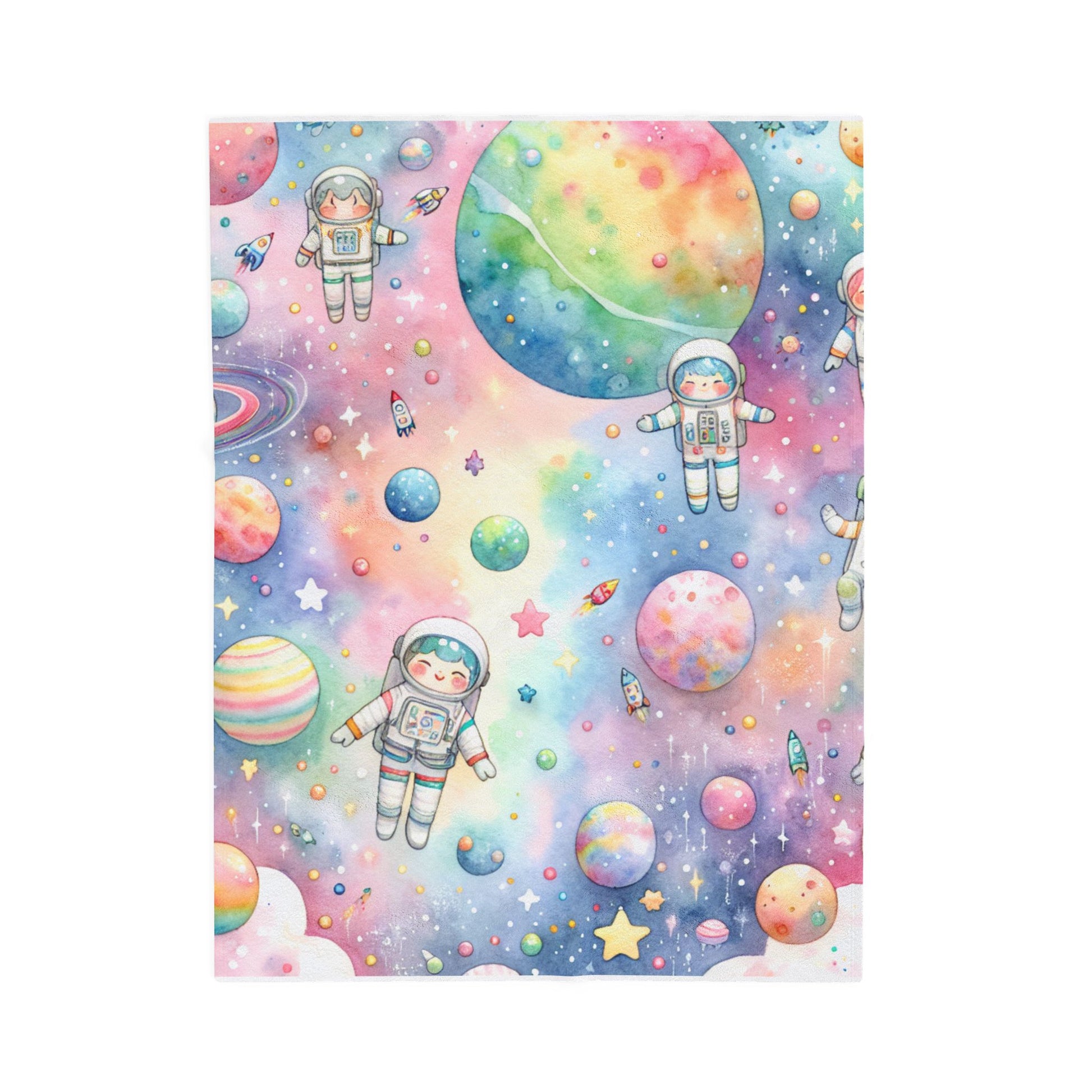 This whimsical illustration features playful astronauts floating amidst a dreamy, pastel cosmos filled with colorful planets and stars. The watercolor palette and charming details evoke a sense of childlike wonder and adventure in space. Create a cozy and warm atmosphere at home with this plush velveteen blanket. It is soft to touch and perfect for any home. Customize with a one-sided print to add your personal touch or create a gift for your friends and family. Available in three sizes: 30x40", 50x60", 60x80".