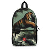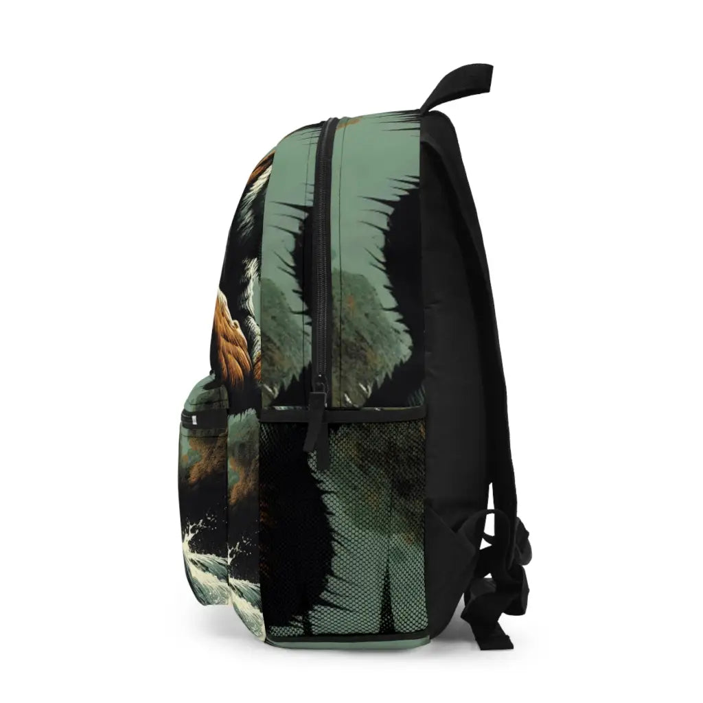 A dynamic illustration of a tiger leaps forward, its fierce eyes and roaring mouth conveying intensity. The artist captures movement and power through bold lines and rich colors, with water splashing beneath as it lunges onto rocky terrain, embodying wild elegance. Introducing the ultimate backpack for fashion-forward adventurers! Our backpack boasts a striking textile design that will make a statement wherever you go. With its durable construction and spacious compartments, it is perfect for carrying all your essentials. Get ready to turn heads and stay organized with our backpack. #textiledesign #backpack #fashionforward #adventure #durable #spacious #statementpiece #organized #essentials #travel #explore