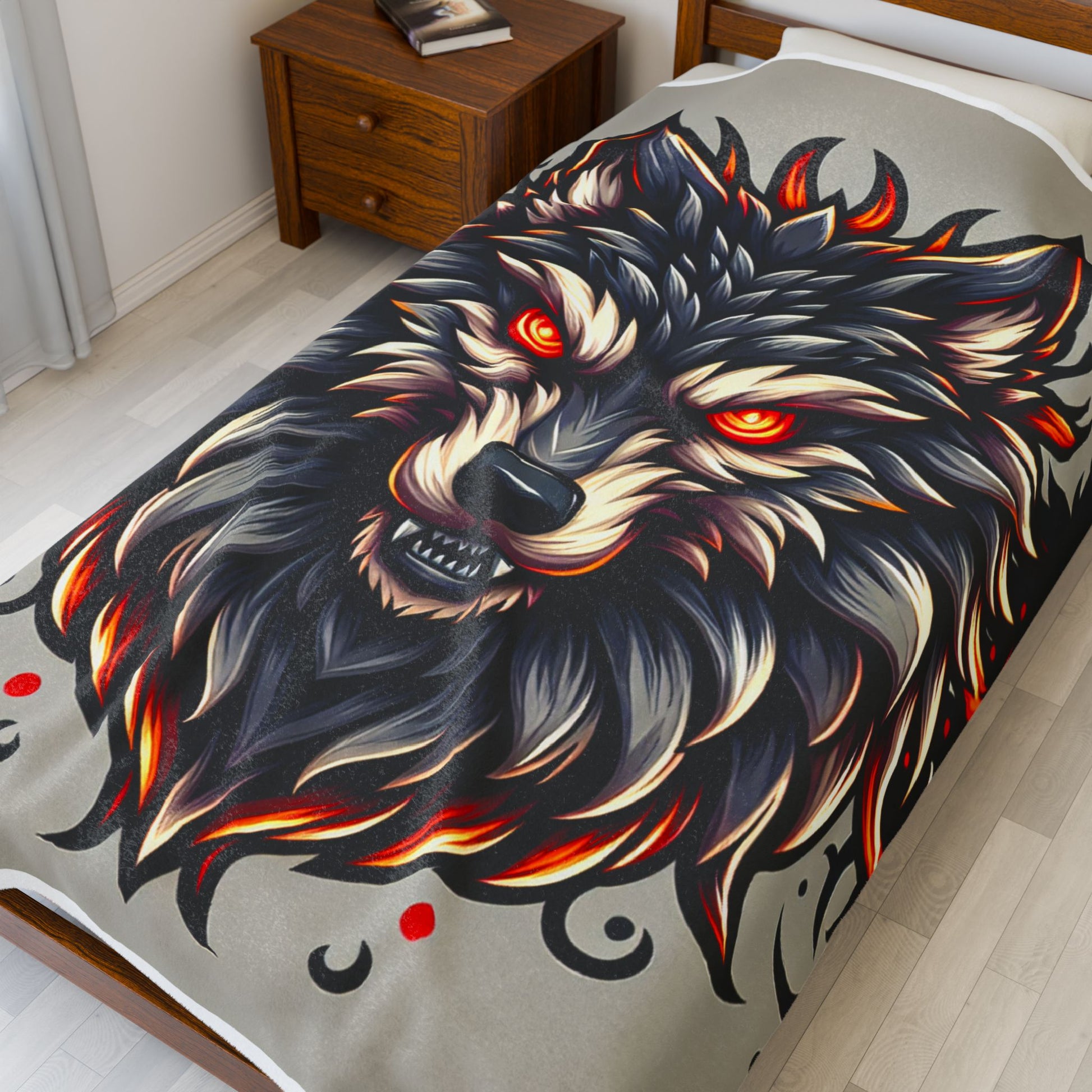 A fierce, stylized wolf head with fiery orange-red eyes and intricate fur detailing, flanked by two dark silhouettes featuring glowing eyes. The artwork blends bold color contrasts and sharp angular lines, creating a dynamic, intense visual impact. Create a cozy and warm atmosphere at home with this plush velveteen blanket. It is soft to touch and perfect for any home. Customize with a one-sided print to add your personal touch or create a gift for your friends and family. Available in three sizes: 30x40", 50x60", 60x80".