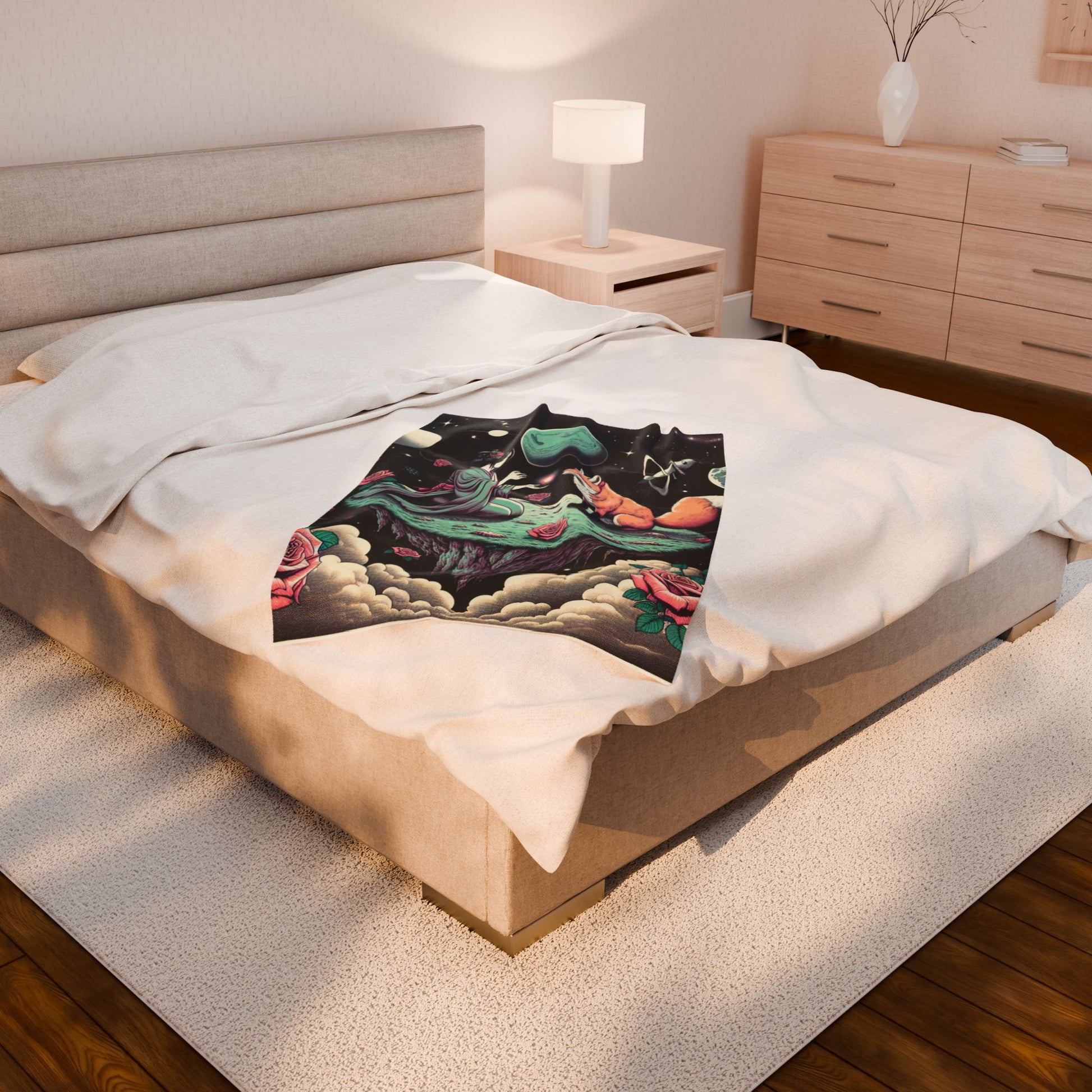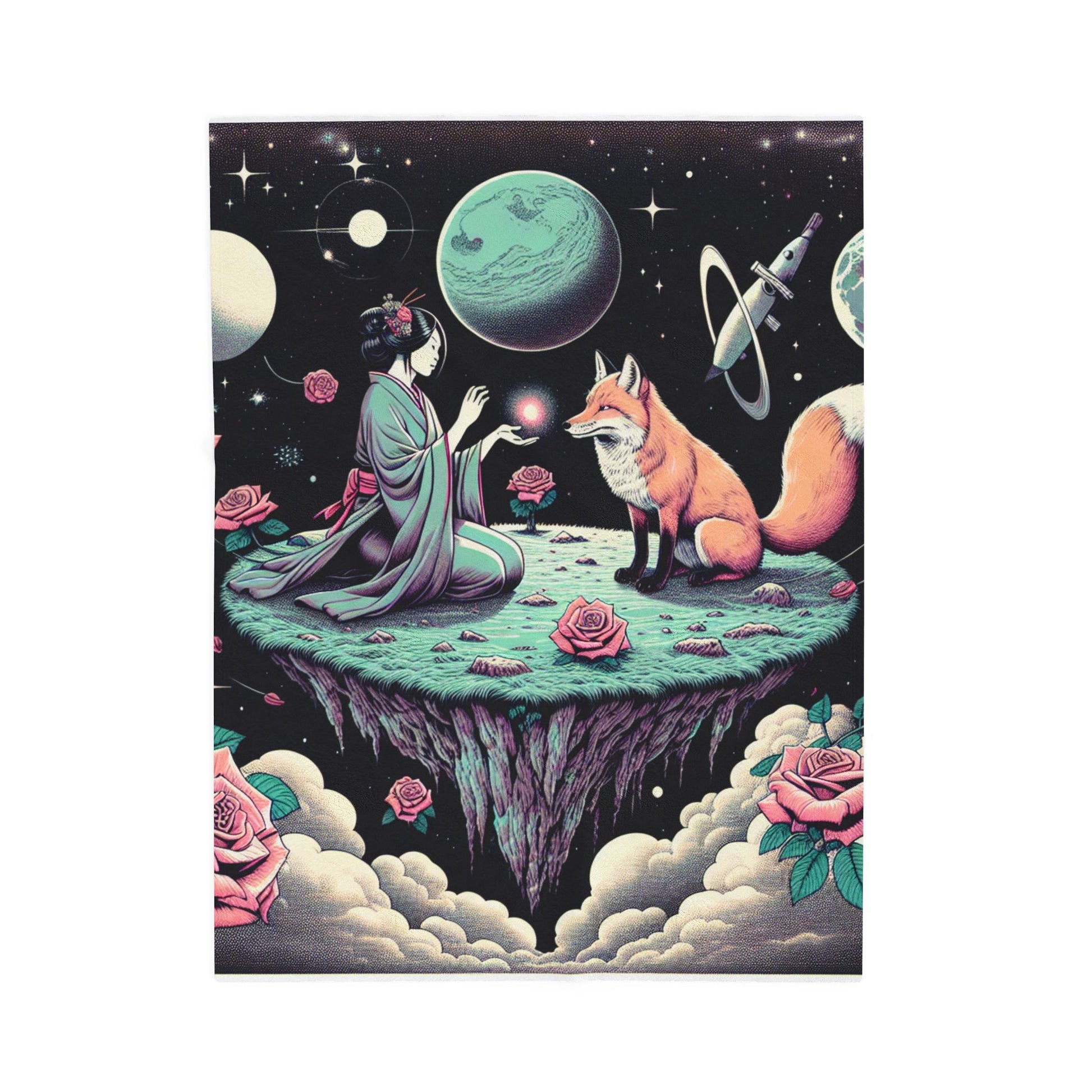In a cosmic dreamscape, a geisha and a fox share a mystical moment on a floating island. Surrounded by celestial bodies, roses cascade amidst the stars, merging culture with fantasy in a surreal, vibrant universe. Create a cozy and warm atmosphere at home with this plush velveteen blanket. It is soft to touch and perfect for any home. Customize with a one-sided print to add your personal touch or create a gift for your friends and family. Available in three sizes: 30x40", 50x60", 60x80".