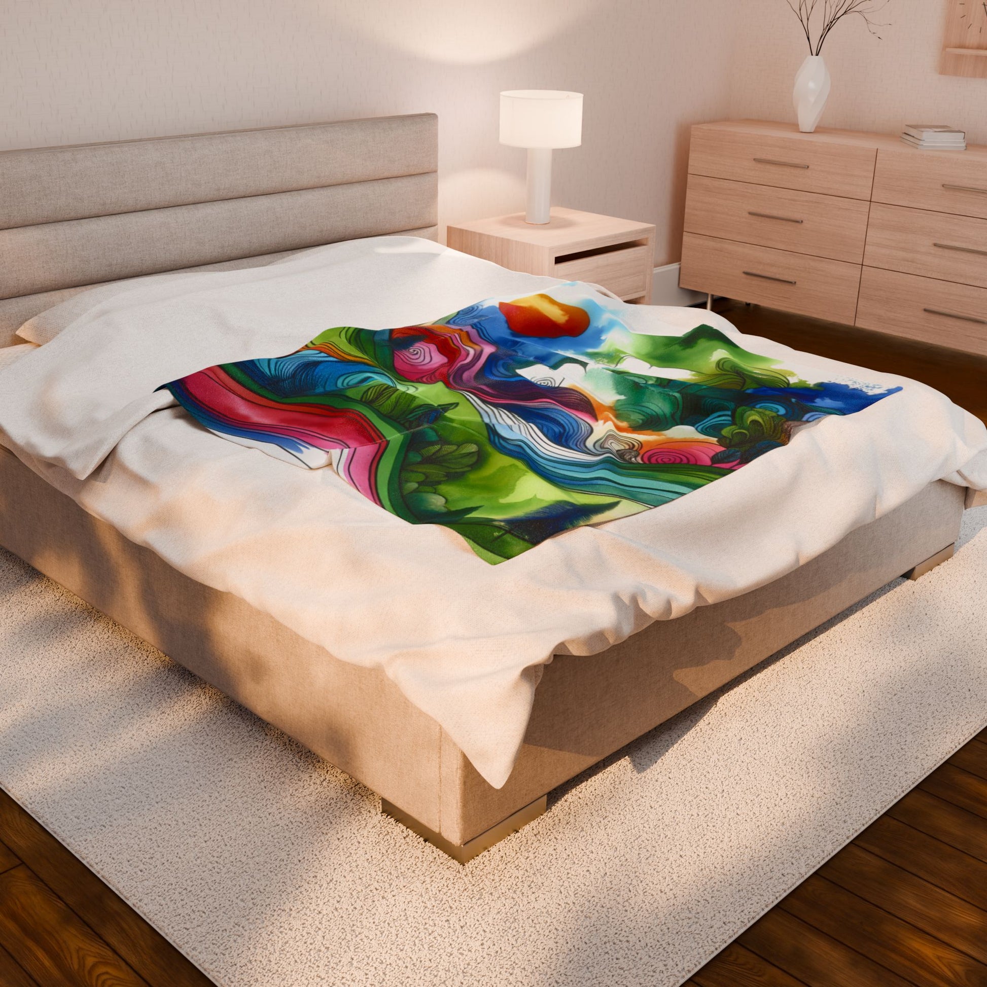 A vibrant landscape flows with swirling waves of color, seamlessly blending reds, greens, and blues. Whimsical trees and a bold sun add dynamic intricacy, evoking a sense of movement and harmony in this imaginative, dreamlike scene. Create a cozy and warm atmosphere at home with this plush velveteen blanket. It is soft to touch and perfect for any home. Customize with a one-sided print to add your personal touch or create a gift for your friends and family. Available in three sizes: 30x40", 50x60", 60x80".