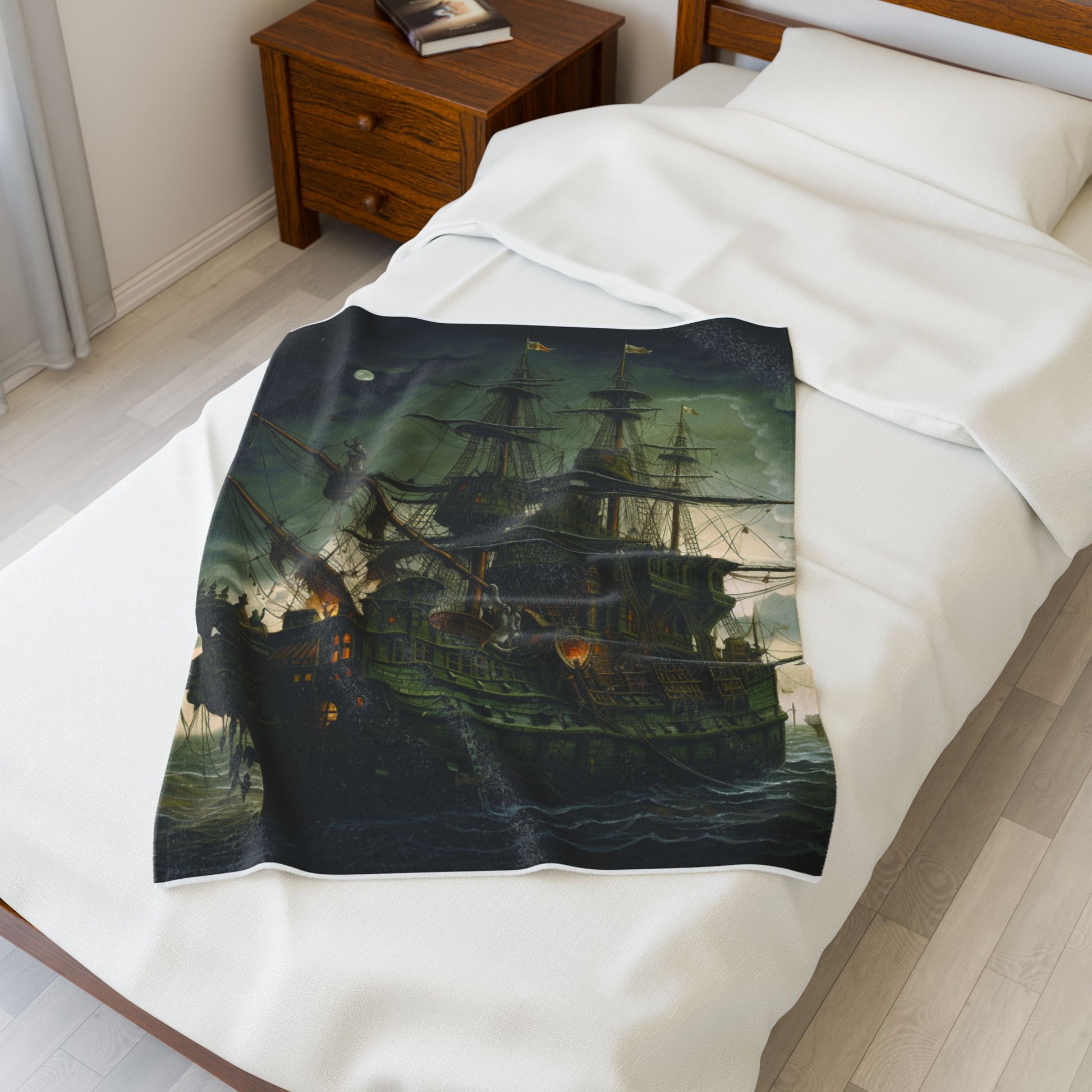 A majestic galleon braves tempestuous seas, her elaborate architecture boasting intricate wooden carvings and opulent embellishments, embodying the grandeur of seafaring adventures under a brooding celestial ballet of moon and clouds. Create a cozy and warm atmosphere at home with this plush velveteen blanket. It is soft to touch and perfect for any home. Customize with a one-sided print to add your personal touch or create a gift for your friends and family. Available in three sizes: 30x40", 50x60", 60x80".