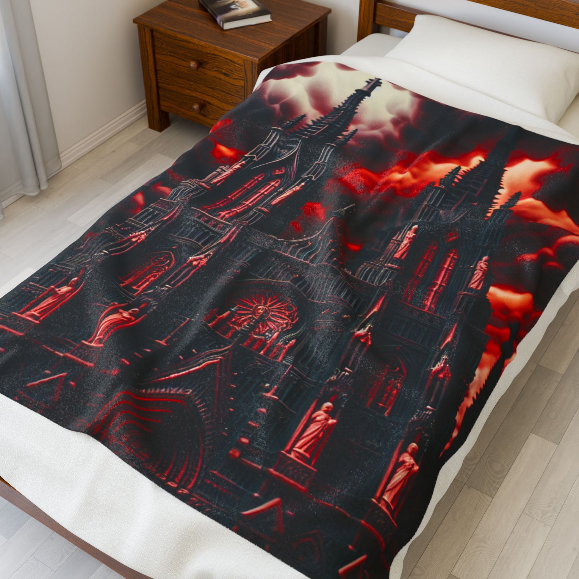 A gothic cathedral rises ominously under a swirling, fiery-red sky. Intricate spires and statues adorn the architecture, evoking a haunting blend of majesty and mystery. The dramatic clouds enhance the cathedral's ethereal and powerful presence, creating an intense, otherworldly atmosphere. Create a cozy and warm atmosphere at home with this plush velveteen blanket. It is soft to touch and perfect for any home. Customize with a one-sided print to add your personal touch or create a gift for your friends and family. Available in three sizes: 30x40", 50x60", 60x80".