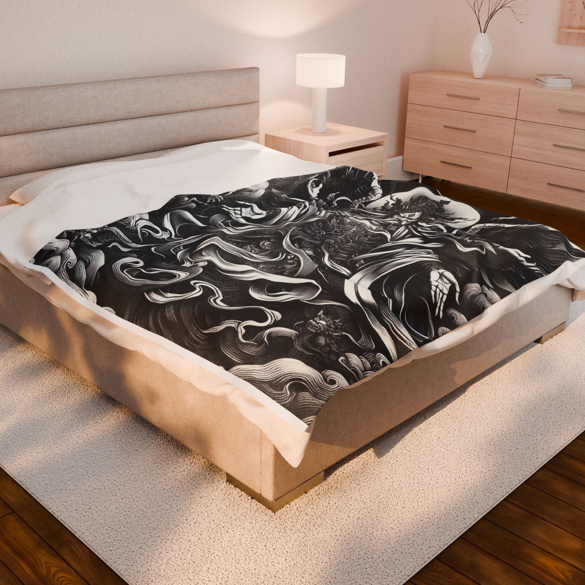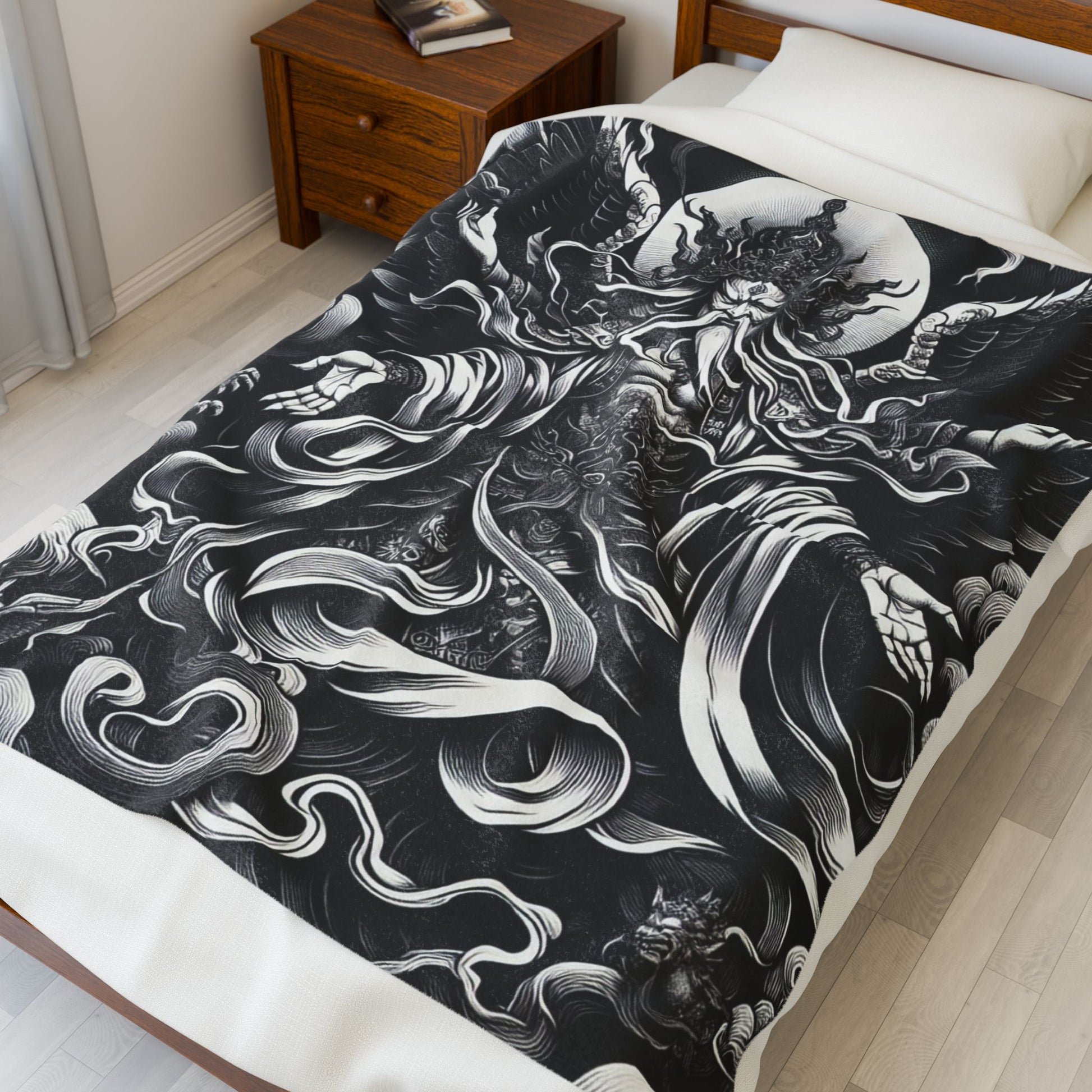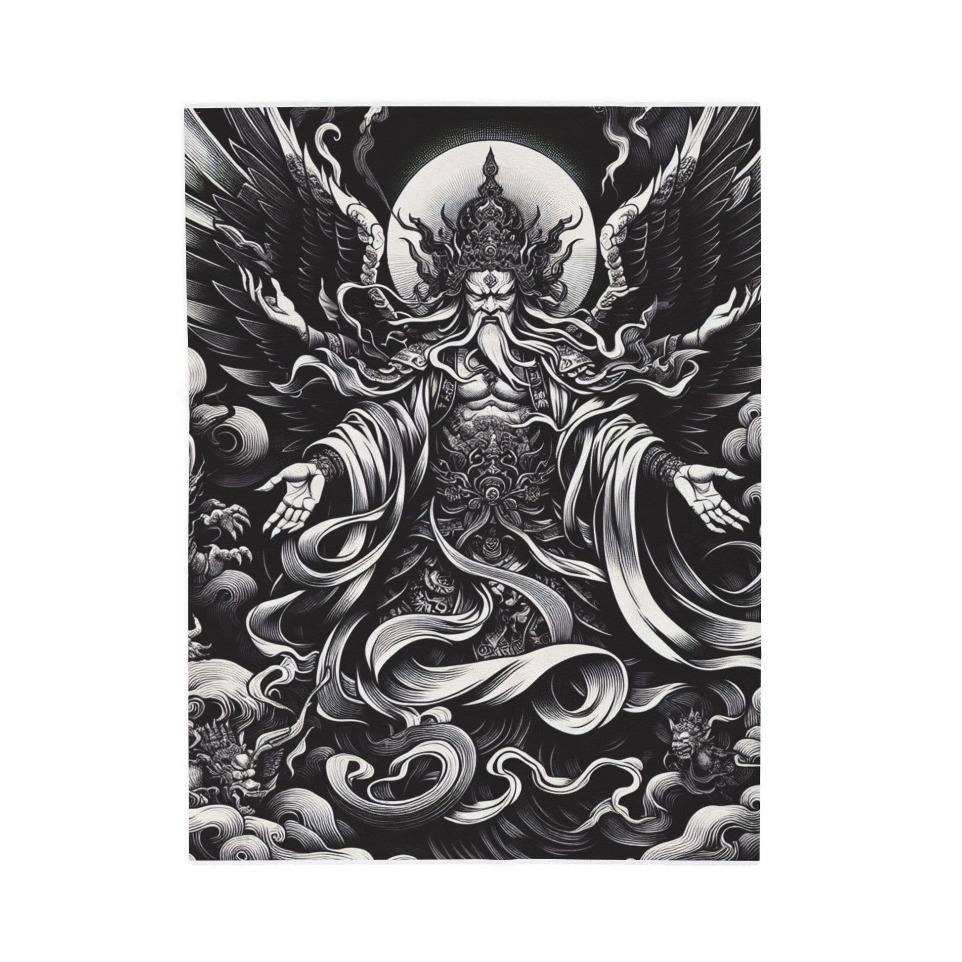 The image showcases a mythical figure with intricate, detailed carvings, dramatic wings, and flowing robes, surrounded by swirling clouds and mystical creatures. The monochrome design emphasizes bold contrasts and fine linework, creating a dynamic and ethereal sense of power and divinity. Create a cozy and warm atmosphere at home with this plush velveteen blanket. It is soft to touch and perfect for any home. Customize with a one-sided print to add your personal touch or create a gift for your friends and family. Available in three sizes: 30x40", 50x60", 60x80".