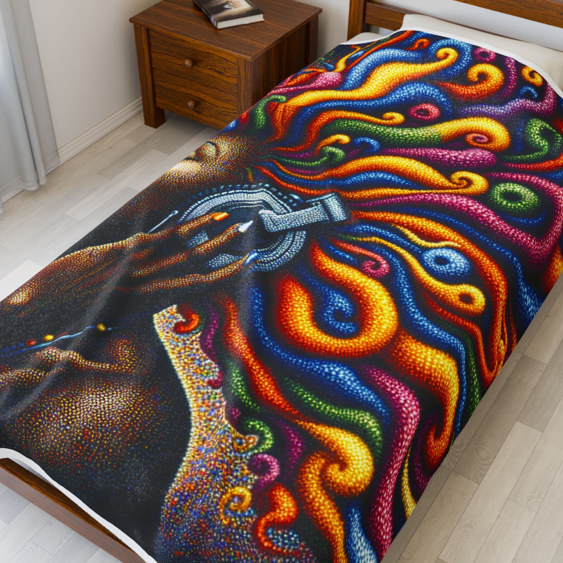 A woman with headphones is immersed in vibrant music, her hair transforming into an explosion of colorful, swirling tendrils. The vivid, pointillist style creates a dynamic, dreamlike energy, celebrating the fusion of sound and imagination. Create a cozy and warm atmosphere at home with this plush velveteen blanket. It is soft to touch and perfect for any home. Customize with a one-sided print to add your personal touch or create a gift for your friends and family. Available in three sizes: 30x40", 50x60", 60x80".