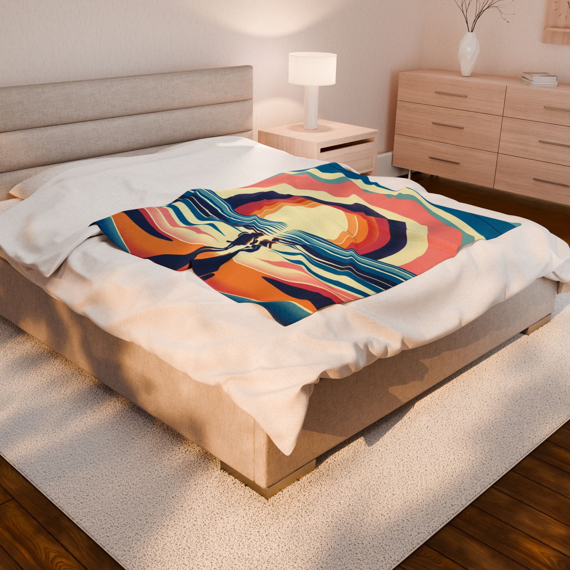 A visually striking art piece featuring a couple silhouetted against a stylized sunset with concentric, multicolored arches. The reflection on water creates perfect symmetry, evoking a serene yet vibrant atmosphere with a retro-futuristic aesthetic. Create a cozy and warm atmosphere at home with this plush velveteen blanket. It is soft to touch and perfect for any home. Customize with a one-sided print to add your personal touch or create a gift for your friends and family. Available in three sizes: 30x40", 50x60", 60x80".