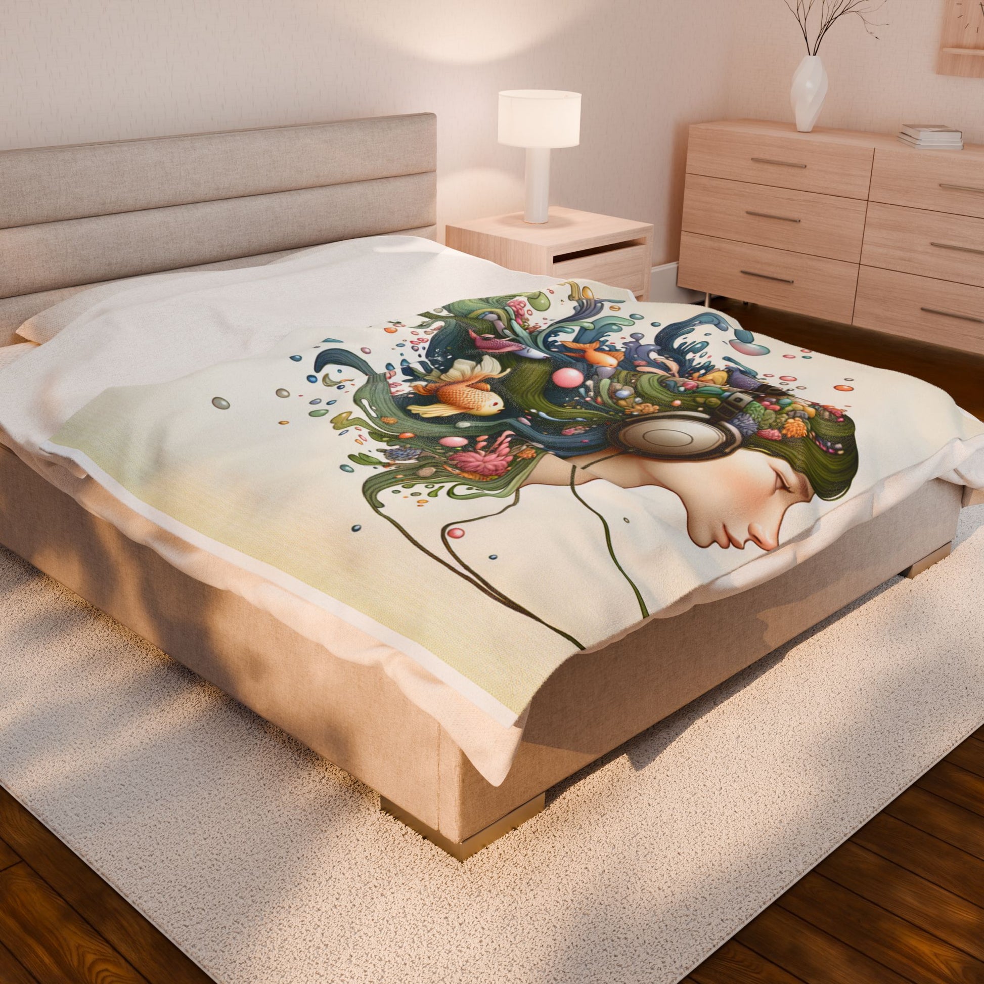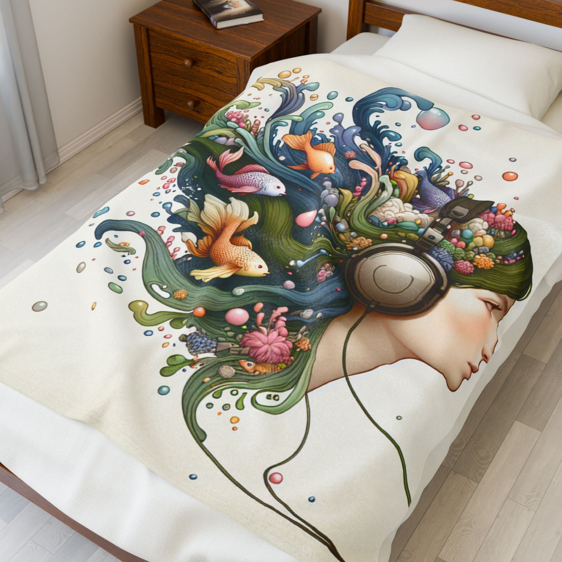 A surreal fusion of imagination and sound, featuring vibrant ocean waves and colorful fish flowing from headphones, blending nature and music seamlessly. The exquisite details and fluidity evoke a whimsical underwater symphony, transforming hair into an enchanting, aquatic world. Create a cozy and warm atmosphere at home with this plush velveteen blanket. It is soft to touch and perfect for any home. Customize with a one-sided print to add your personal touch or create a gift for your friends and family. Available in three sizes: 30x40", 50x60", 60x80".