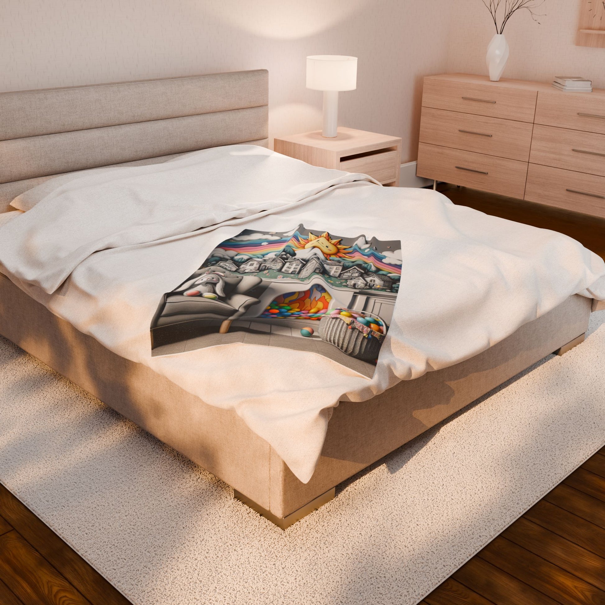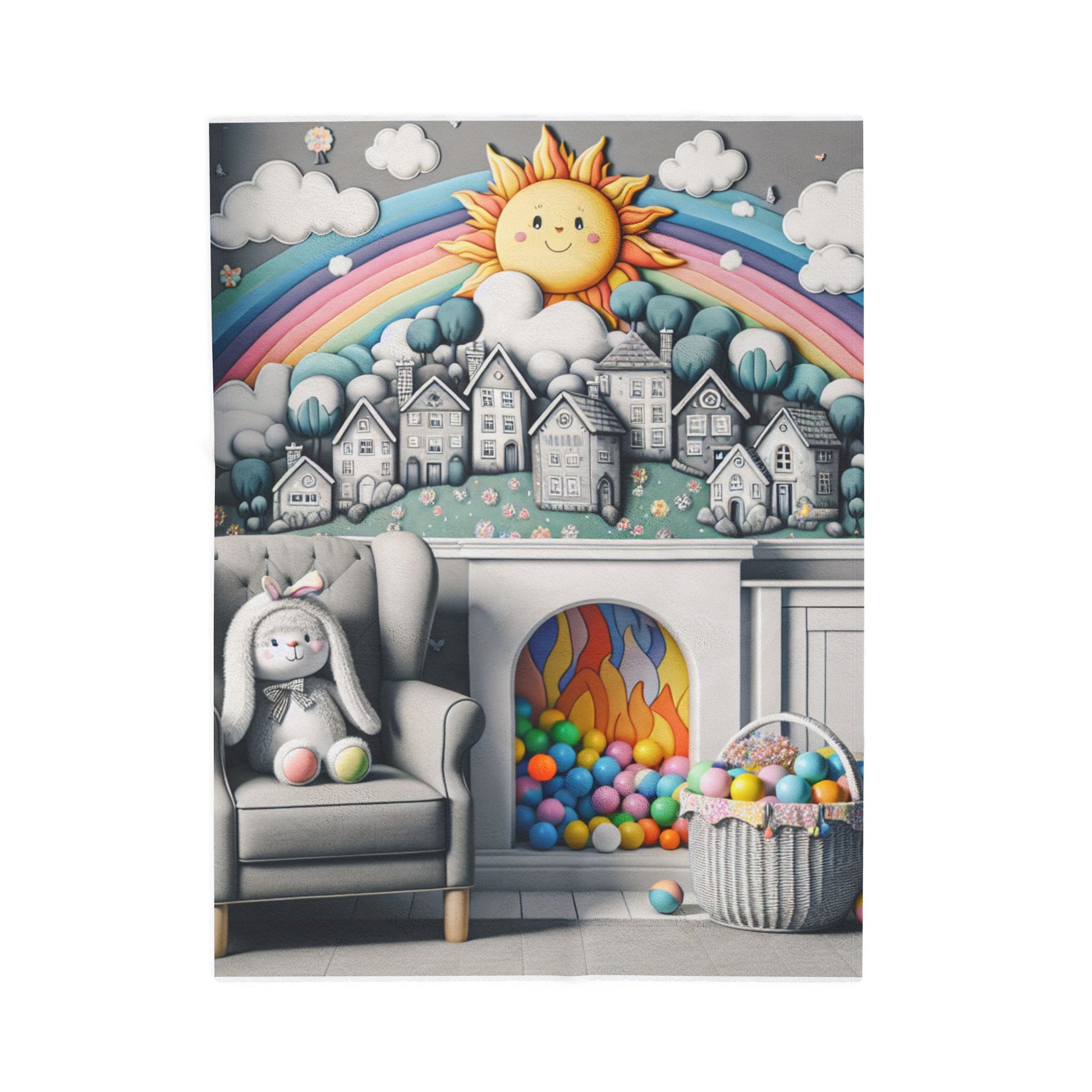A whimsical nursery scene with a cheerful sun and rainbow mural, charming gray-tone village, and playful clouds. A cozy chair holds a plush bunny, while colorful balls spill from a fireplace and basket, creating a lively, dreamlike atmosphere. Create a cozy and warm atmosphere at home with this plush velveteen blanket. It is soft to touch and perfect for any home. Customize with a one-sided print to add your personal touch or create a gift for your friends and family. Available in three sizes: 30x40", 50x60", 60x80".
