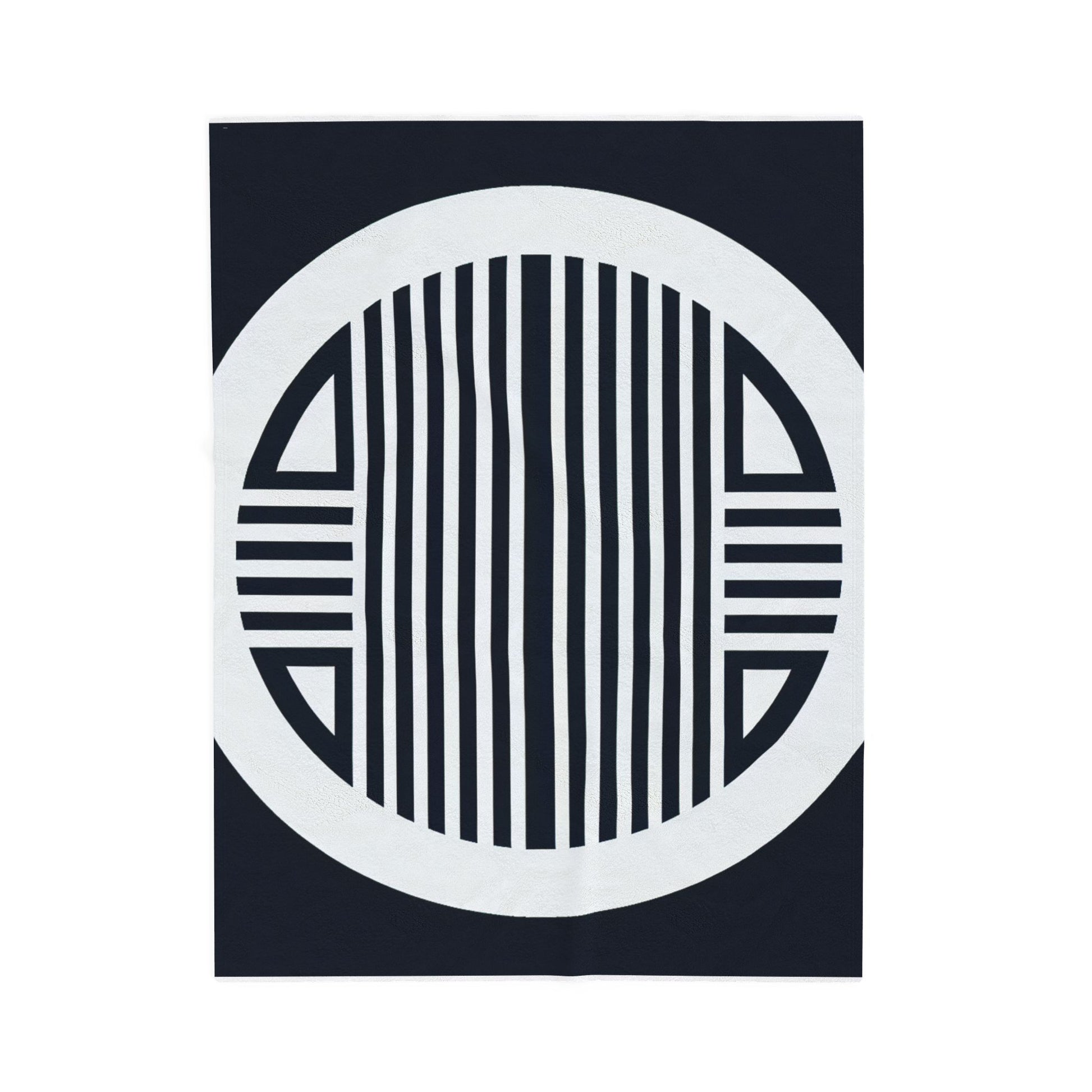 A modern, geometric design featuring a white circular frame with intricate black striped and triangular patterns inside, creating a balanced yet dynamic symmetry. The bold contrast and repetitive lines evoke a sense of rhythm and innovation. Create a cozy and warm atmosphere at home with this plush velveteen blanket. It is soft to touch and perfect for any home. Customize with a one-sided print to add your personal touch or create a gift for your friends and family. Available in three sizes: 30x40", 50x60", 60x80".