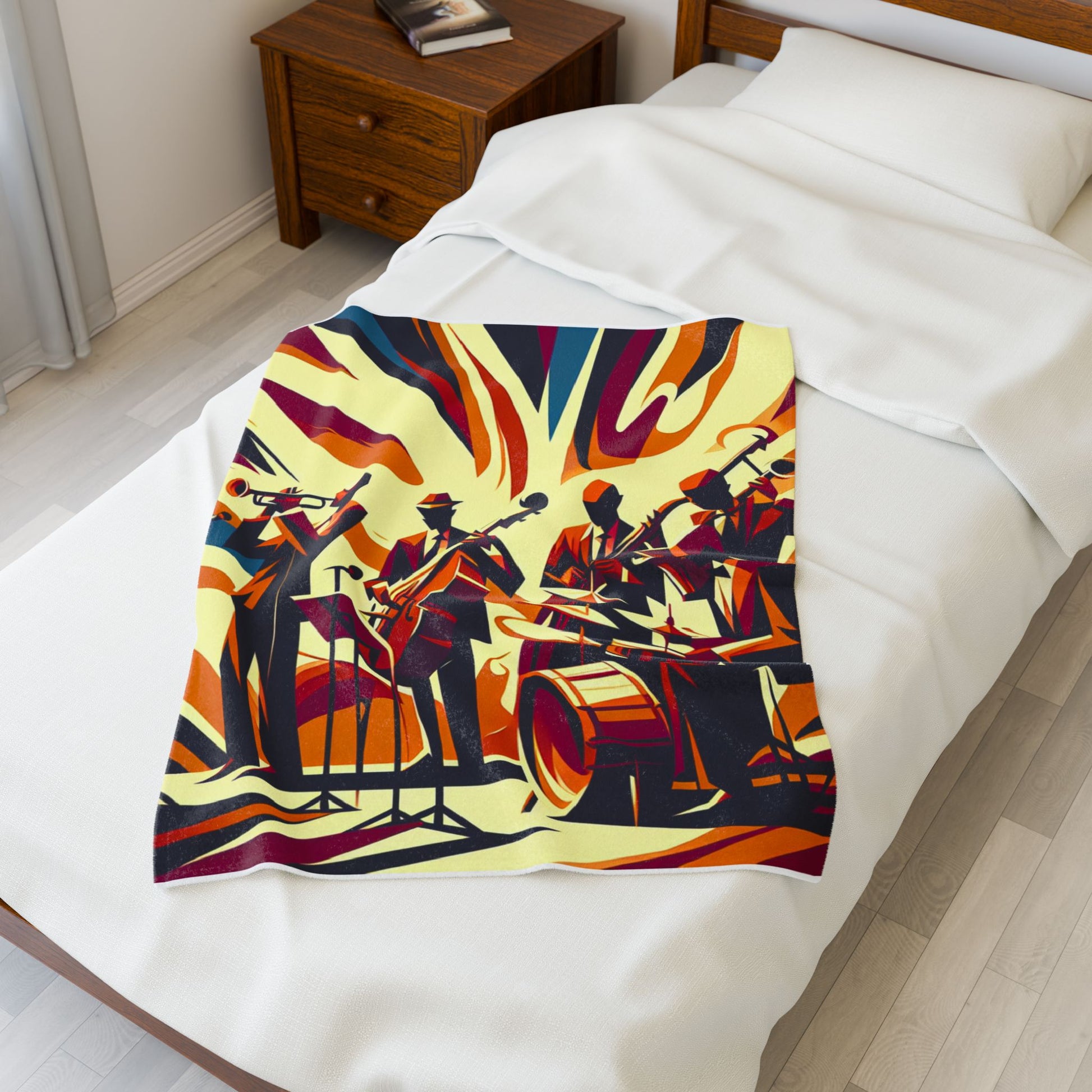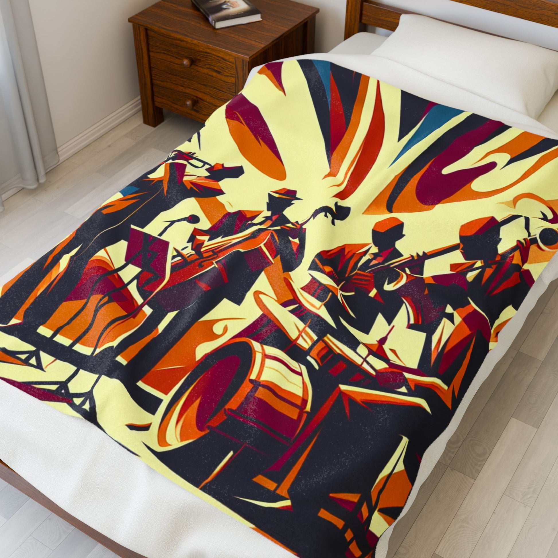 A vibrant, abstract jazz band illustration features musicians in dynamic poses, playing instruments amidst swirling bursts of color. The energetic composition, with bold shapes and vivid hues, evokes the lively rhythm and spirit of jazz music, creating a visually captivating and harmonious scene. Create a cozy and warm atmosphere at home with this plush velveteen blanket. It is soft to touch and perfect for any home. Customize with a one-sided print to add your personal touch or create a gift for your friends and family. Available in three sizes: 30x40", 50x60", 60x80".