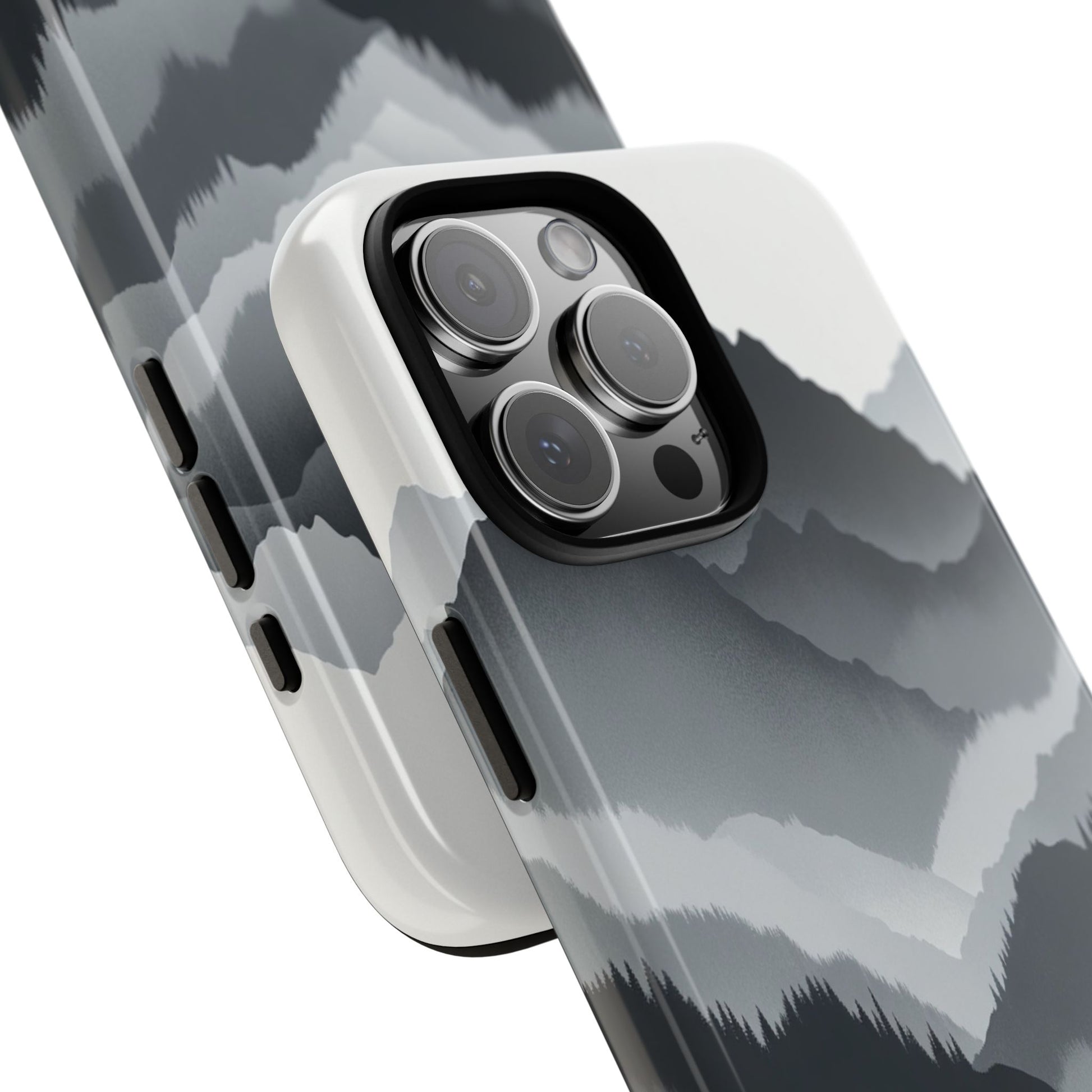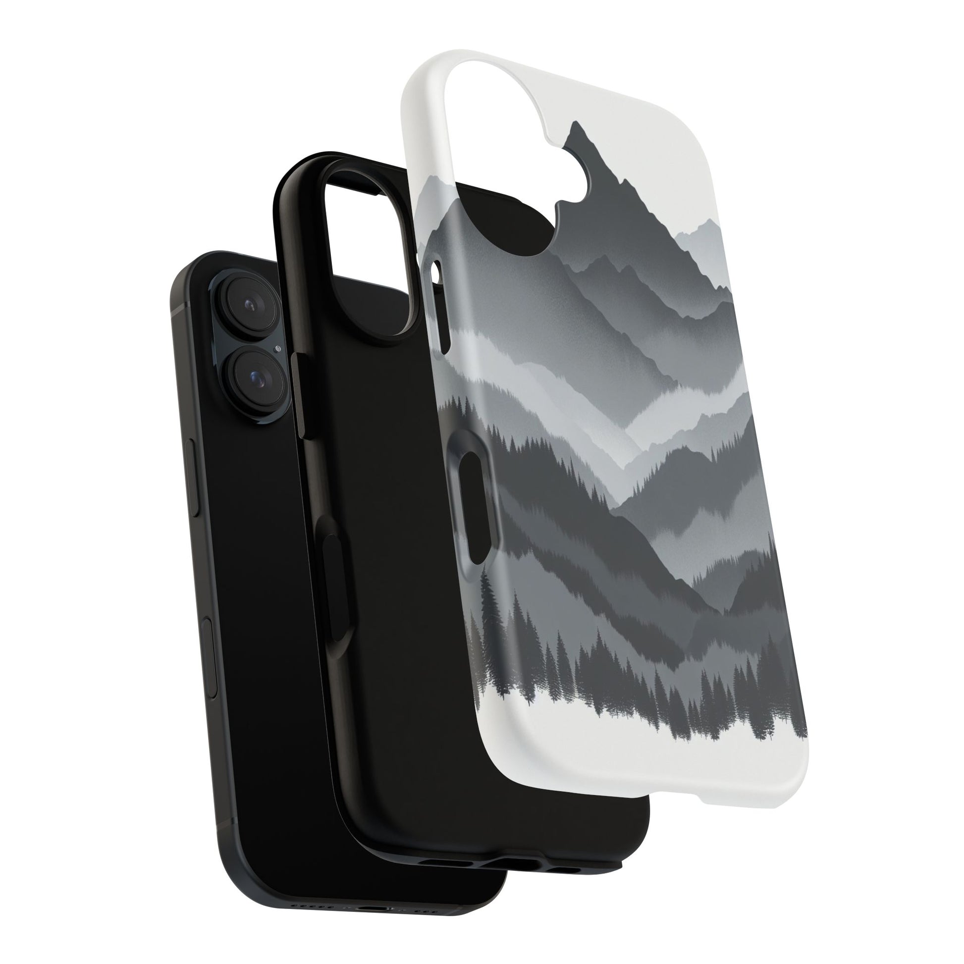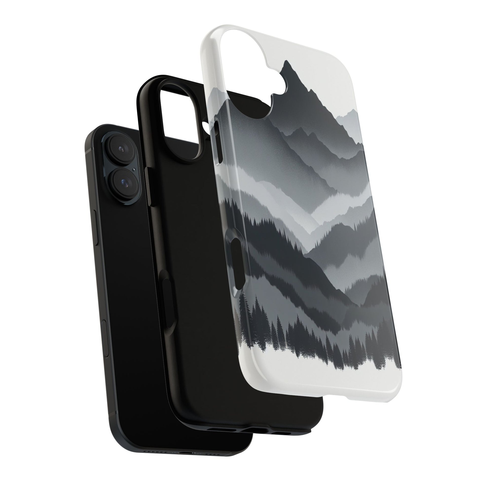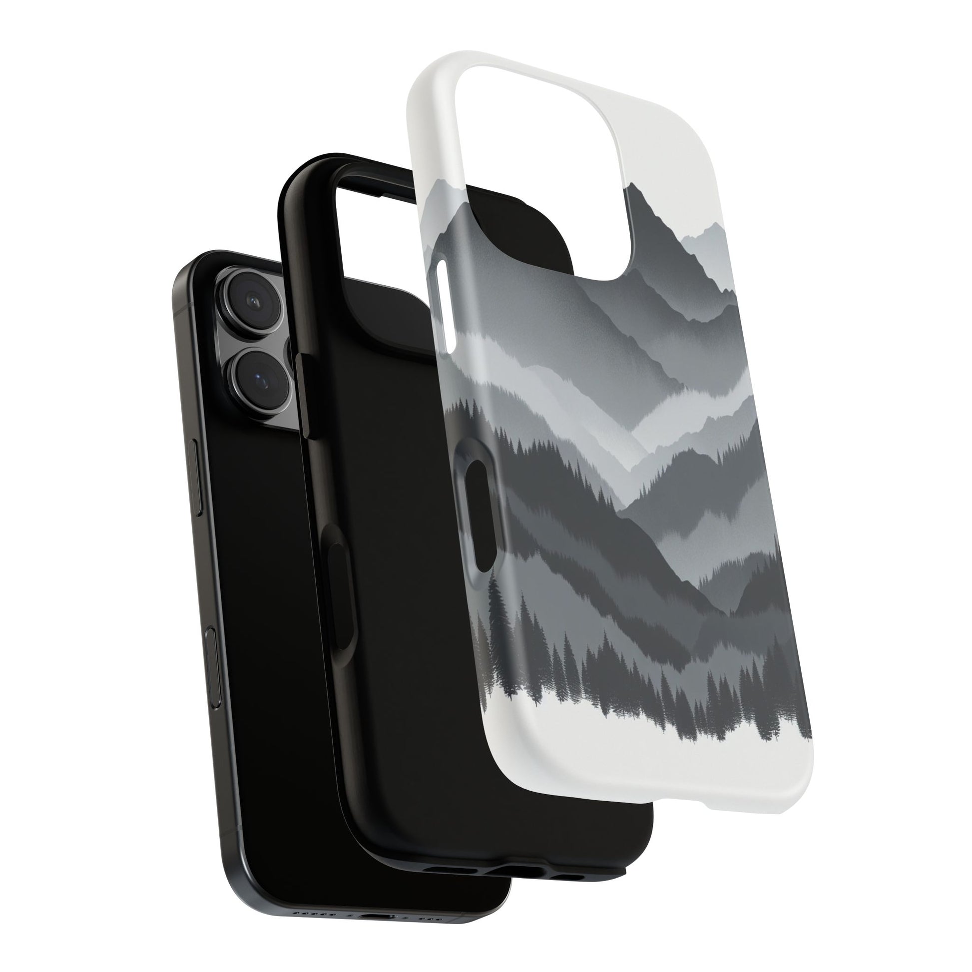 Monochromatic mountain layers seamlessly blend into one another, creating a serene, misty landscape. The minimalist grayscale palette accentuates the depth and tranquility of the scene, while the repetitive, flowing forms evoke a peaceful rhythm and timeless beauty. iPhone, Samsung Galaxy, and Google Pixel devices with premium-quality custom protective phone cases. Every case has double layers for extra durability and protection while the clear, open ports stay out of your way when it comes to charging. The outer polycarbonate shell will resist daily impacts. Choose between matte or glossy finish and enjoy adding a unique touch to your phone with our custom protective phone cases sourced from Korea.