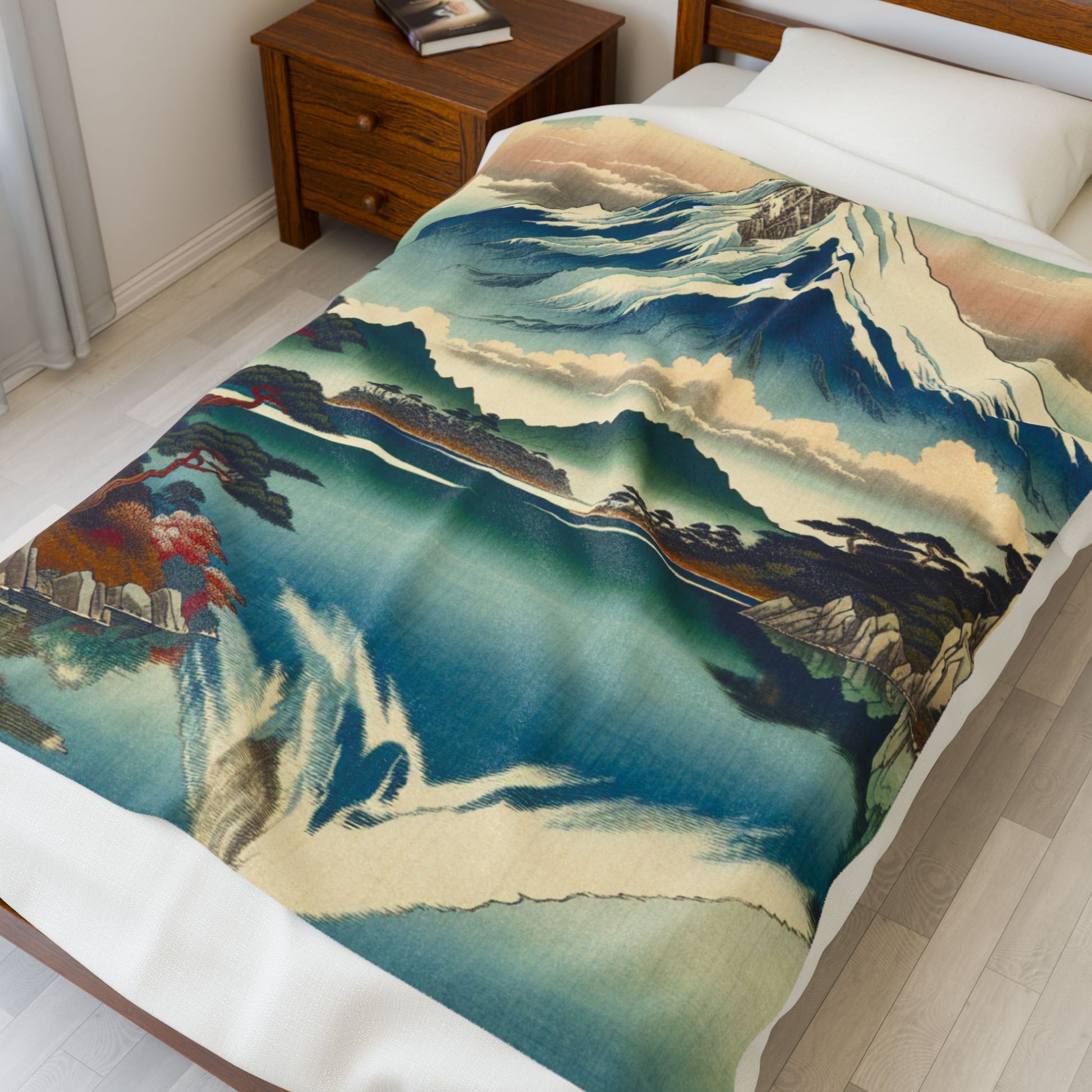 This image captures a serene landscape, blending traditional Japanese art styles with vibrant colors. A majestic snow-capped mountain reflects in a tranquil lake, surrounded by stylized trees and rocky cliffs, creating a harmonious and timeless visual symphony. Create a cozy and warm atmosphere at home with this plush velveteen blanket. It is soft to touch and perfect for any home. Customize with a one-sided print to add your personal touch or create a gift for your friends and family. Available in three sizes: 30x40", 50x60", 60x80".