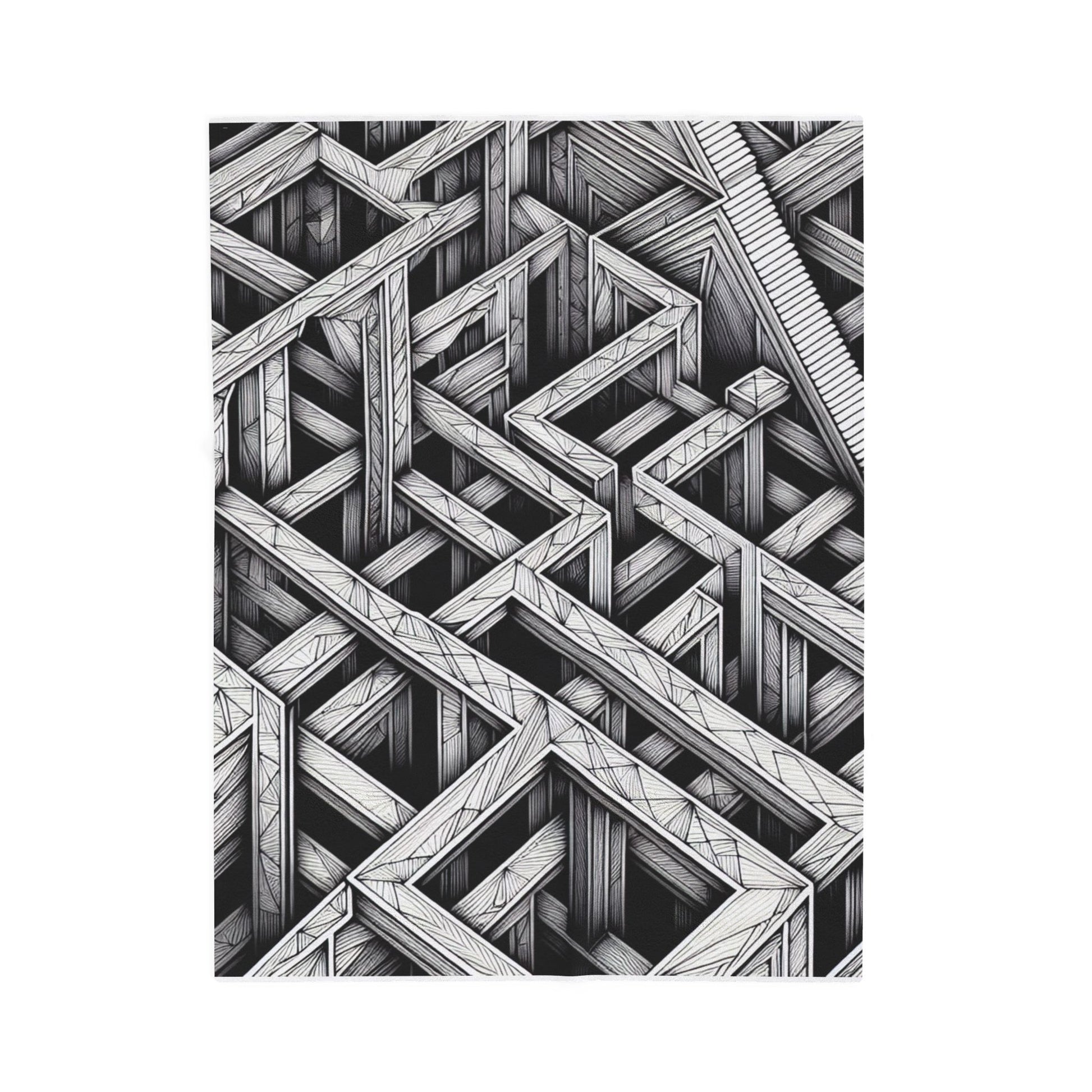 An intricate labyrinth of interlocking wooden pathways creates a mesmerizing visual puzzle. The monochrome tones and detailed linework evoke depth and complexity, while the geometric design invites the viewer to explore endless possibilities within its structured chaos. Create a cozy and warm atmosphere at home with this plush velveteen blanket. It is soft to touch and perfect for any home. Customize with a one-sided print to add your personal touch or create a gift for your friends and family. Available in three sizes: 30x40", 50x60", 60x80".