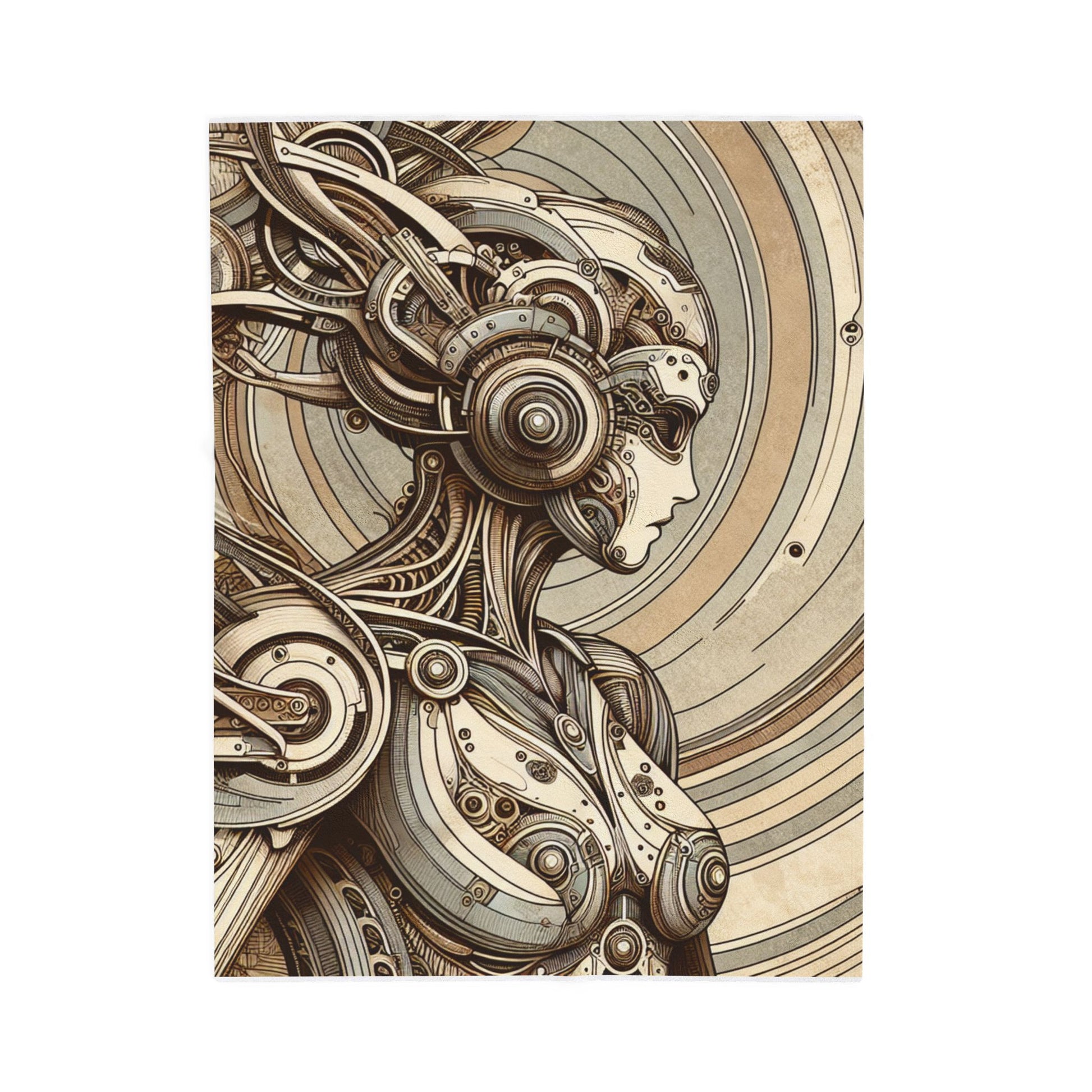 A stunning fusion of Art Nouveau and steampunk, this image features a robotic figure intricately detailed with gears and swirling patterns. The muted sepia tones evoke an elegant, futuristic aesthetic that captivates with its elaborate, mechanical elegance. Create a cozy and warm atmosphere at home with this plush velveteen blanket. It is soft to touch and perfect for any home. Customize with a one-sided print to add your personal touch or create a gift for your friends and family. Available in three sizes: 30x40", 50x60", 60x80".