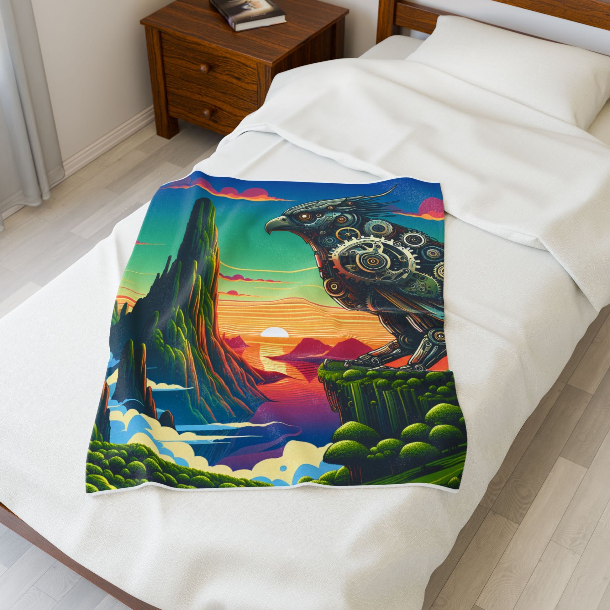 A vibrant fusion of fantasy and machinery, showcasing a majestic mechanical bird perched atop lush surreal landscapes. The intricate gears and cogs contrast with the colorful, dreamlike sky, merging nature with technology in a fantastical sunrise setting. Create a cozy and warm atmosphere at home with this plush velveteen blanket. It is soft to touch and perfect for any home. Customize with a one-sided print to add your personal touch or create a gift for your friends and family. Available in three sizes: 30x40", 50x60", 60x80".