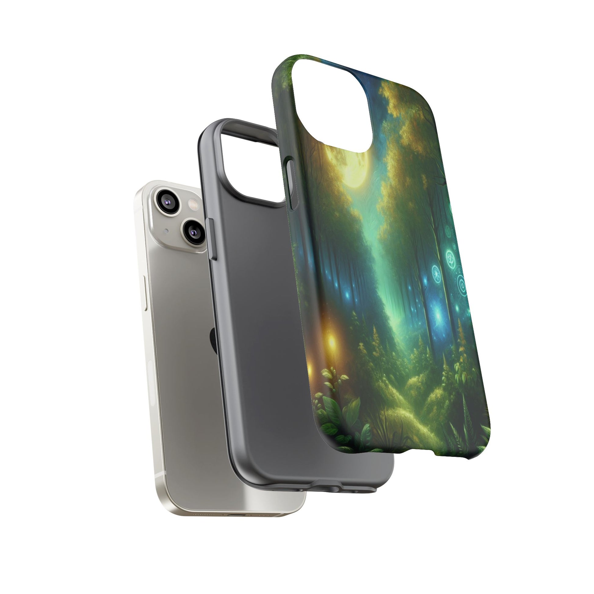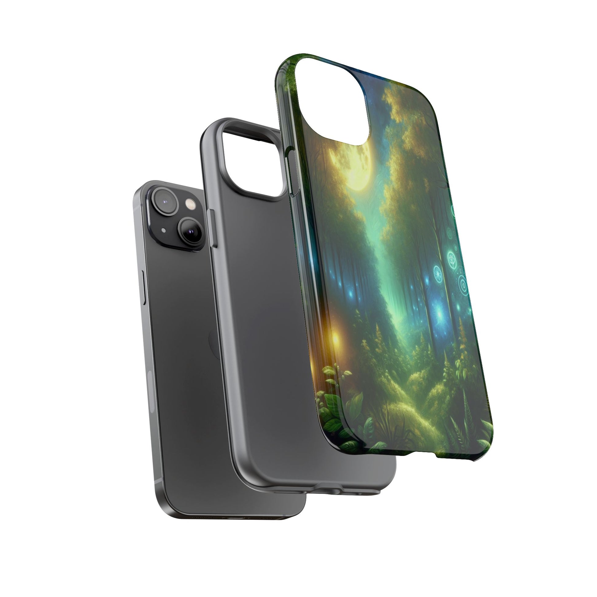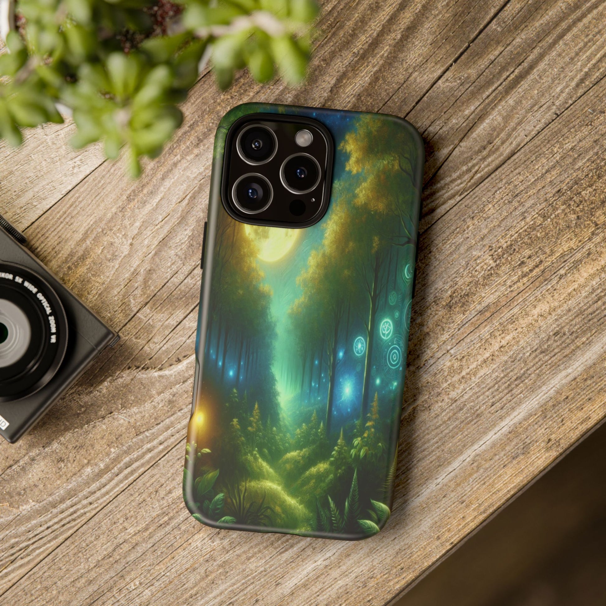 A mystical forest under a glowing full moon, with luminescent symbols on trees and vibrant foliage. Ethereal orbs float amidst the enchanting greenery, creating a dreamlike atmosphere of nature meeting magic. iPhone, Samsung Galaxy, and Google Pixel devices with premium-quality custom protective phone cases. Every case has double layers for extra durability and protection while the clear, open ports stay out of your way when it comes to charging. The outer polycarbonate shell will resist daily impacts. Choose between matte or glossy finish and enjoy adding a unique touch to your phone with our custom protective phone cases sourced from Korea.
