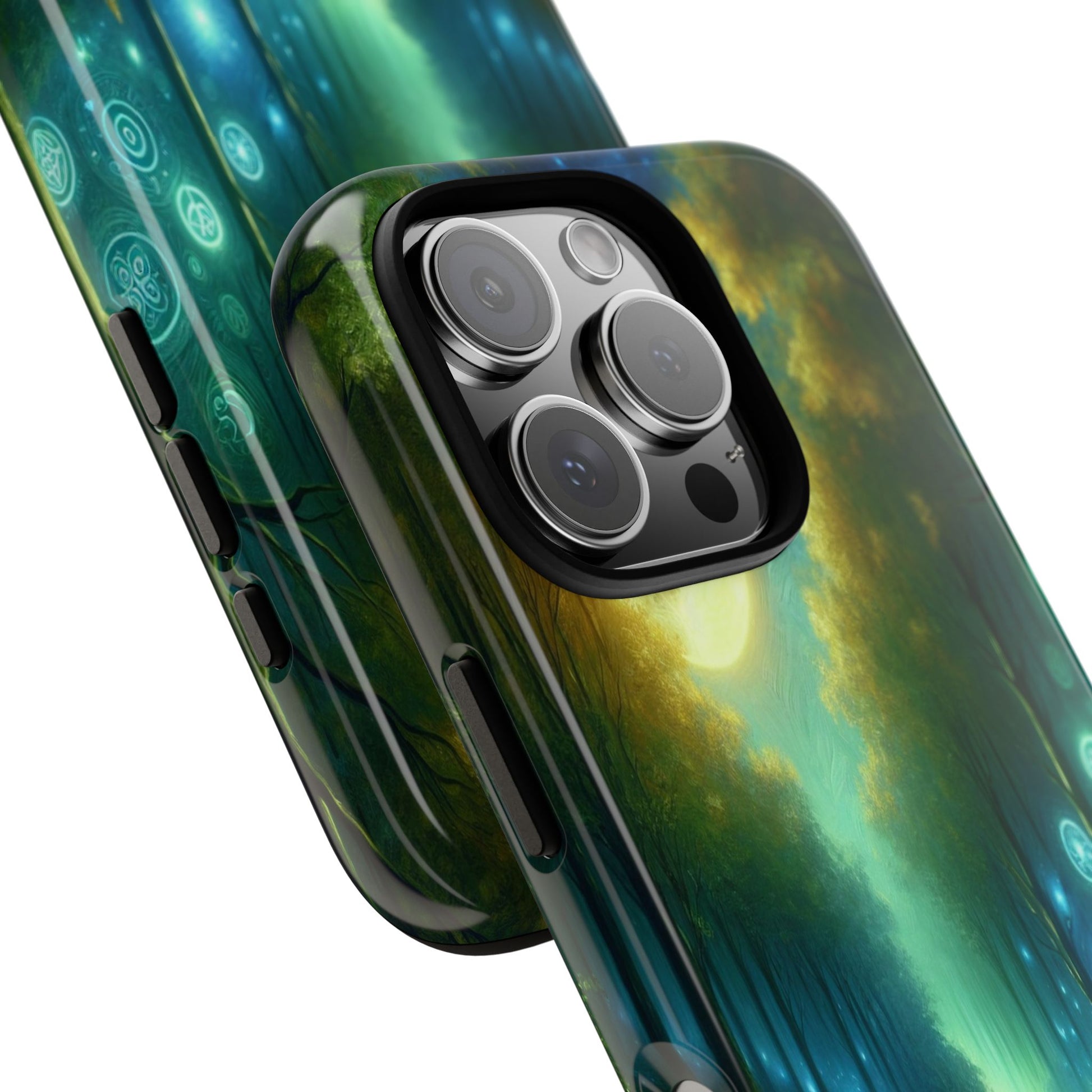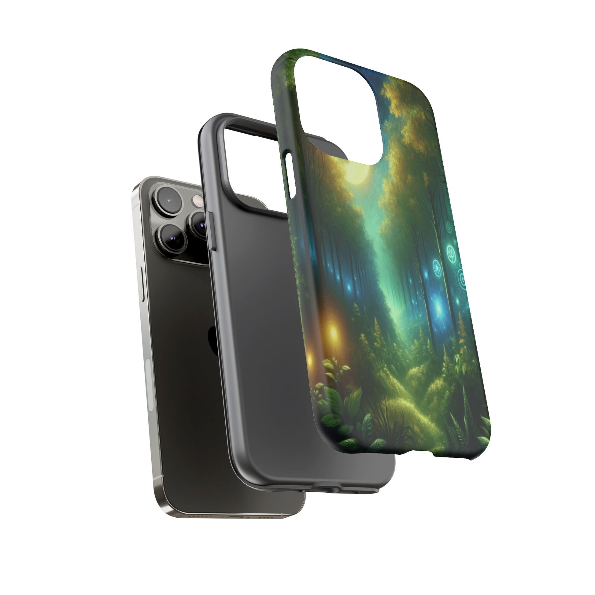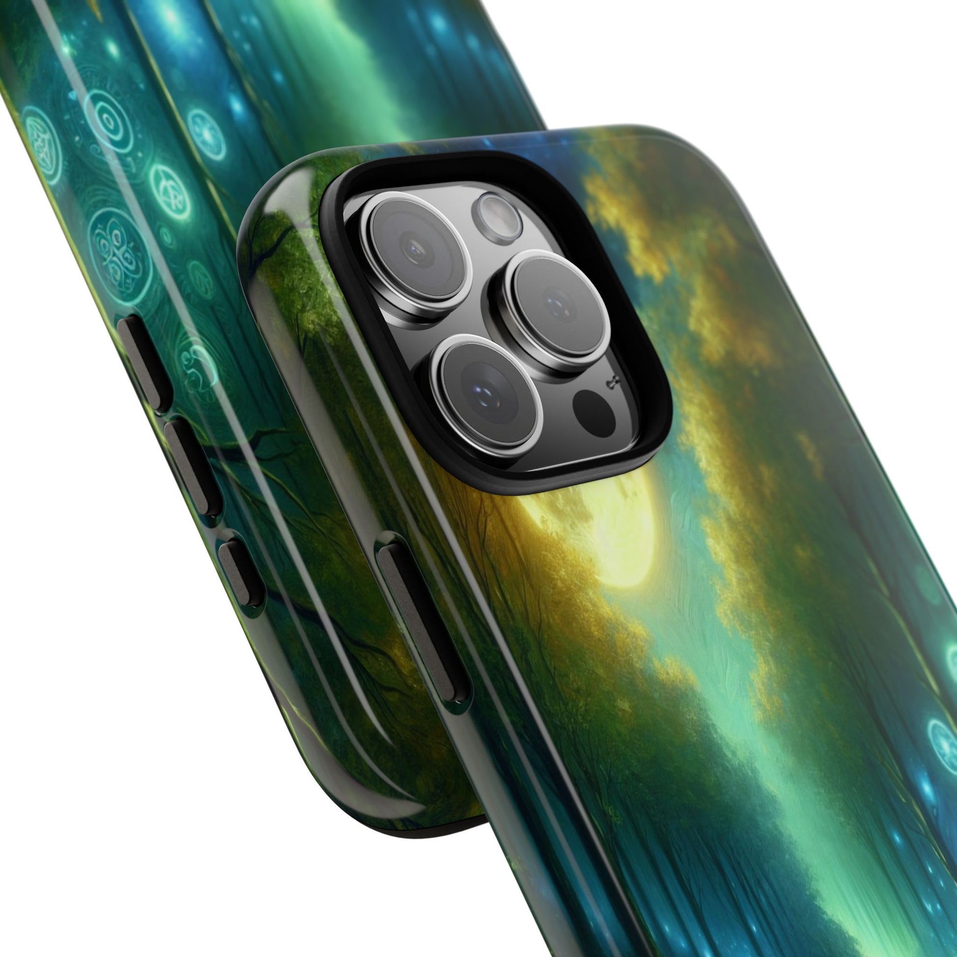 A mystical forest under a glowing full moon, with luminescent symbols on trees and vibrant foliage. Ethereal orbs float amidst the enchanting greenery, creating a dreamlike atmosphere of nature meeting magic. iPhone, Samsung Galaxy, and Google Pixel devices with premium-quality custom protective phone cases. Every case has double layers for extra durability and protection while the clear, open ports stay out of your way when it comes to charging. The outer polycarbonate shell will resist daily impacts. Choose between matte or glossy finish and enjoy adding a unique touch to your phone with our custom protective phone cases sourced from Korea.