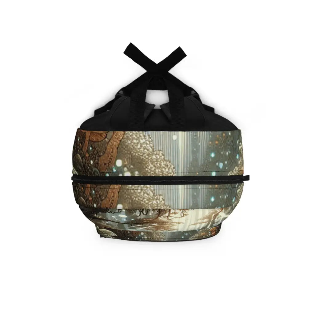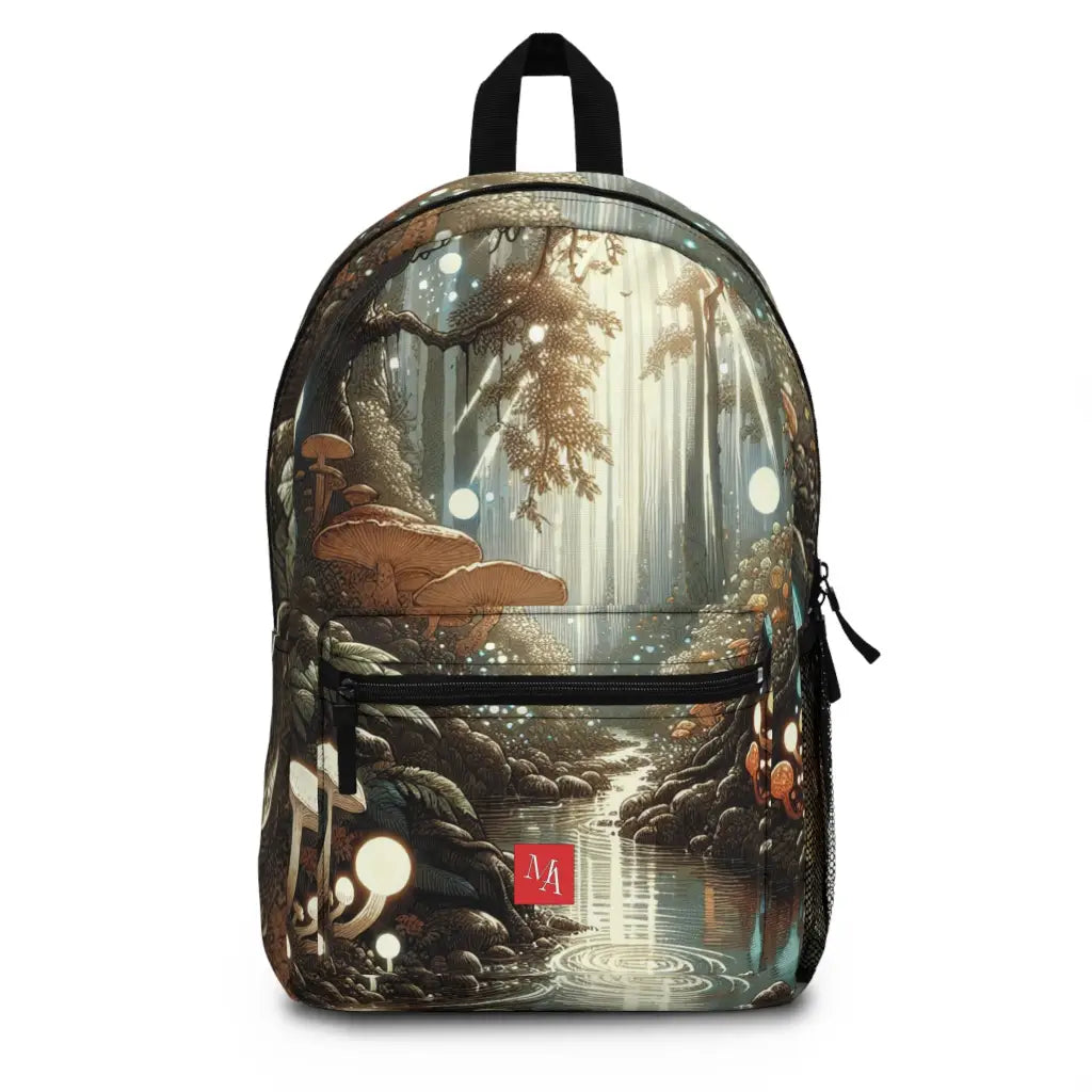 A magical forest scene with glowing mushrooms and luminescent water, bathed in ethereal blue light. Sunbeams pierce the canopy, creating a mystical, otherworldly atmosphere, evoking a sense of wonder and enchantment. Introducing the ultimate backpack for fashion-forward adventurers! Our backpack boasts a striking textile design that will make a statement wherever you go. With its durable construction and spacious compartments, it is perfect for carrying all your essentials. Get ready to turn heads and stay organized with our backpack. #textiledesign #backpack #fashionforward #adventure #durable #spacious #statementpiece #organized #essentials #travel #explore