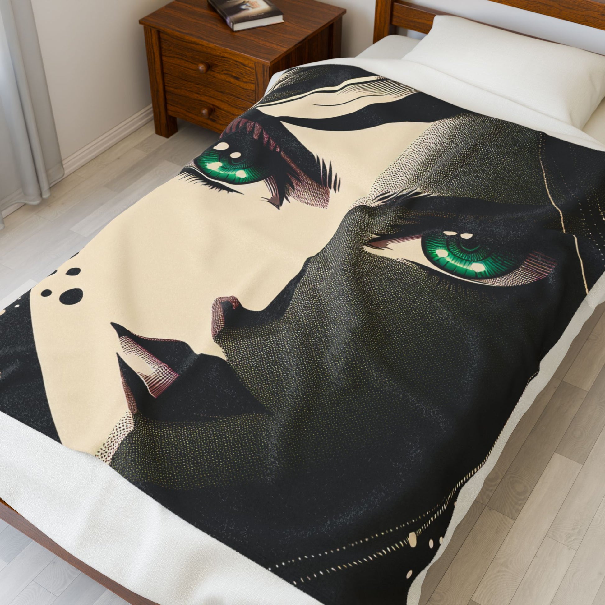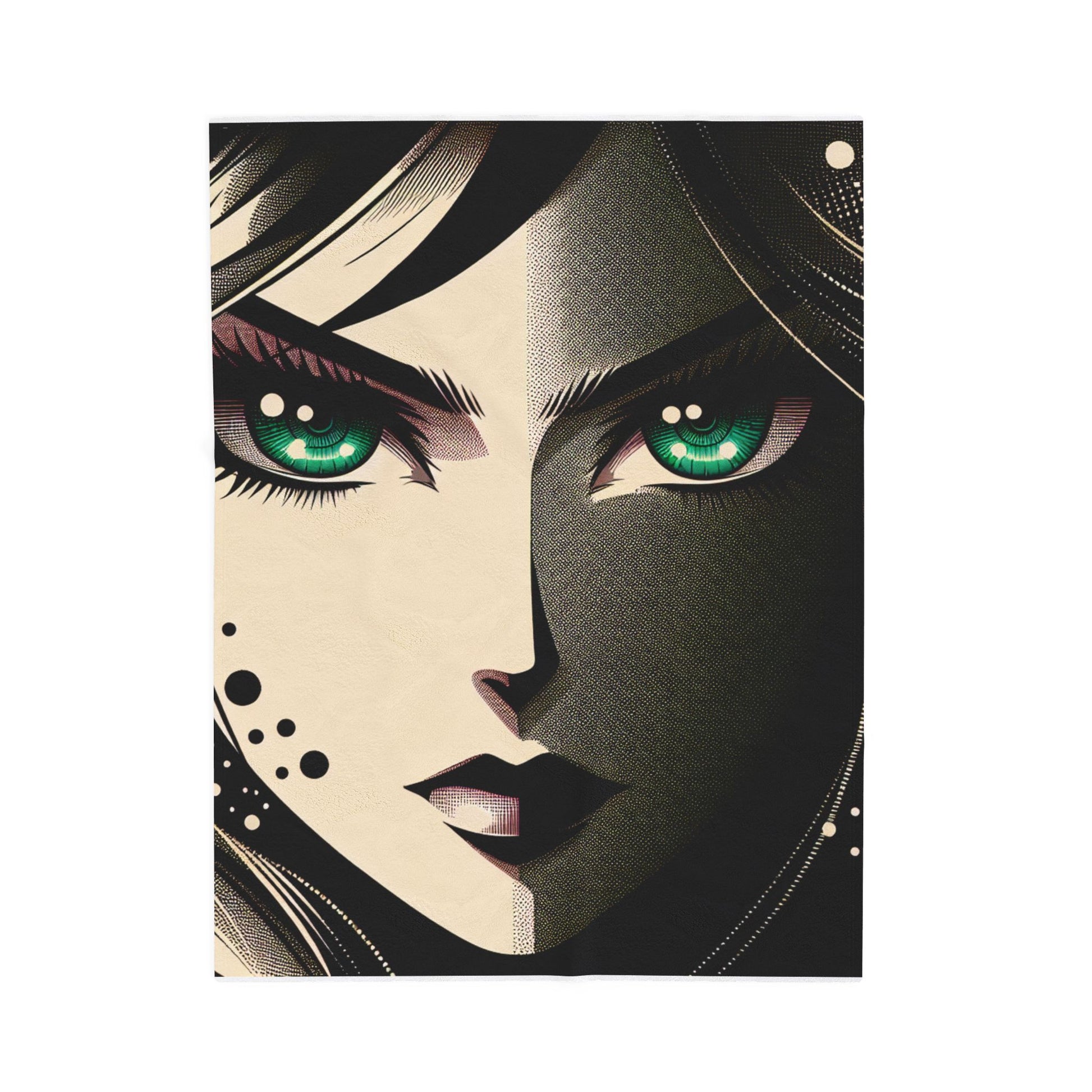 A striking anime-inspired illustration, featuring a woman's face divided into light and shadow. Vibrant teal eyes and intricate dot patterns create a captivating contrast, blending retro and modern styles with dynamic line work for a mesmerizing effect. Create a cozy and warm atmosphere at home with this plush velveteen blanket. It is soft to touch and perfect for any home. Customize with a one-sided print to add your personal touch or create a gift for your friends and family. Available in three sizes: 30x40", 50x60", 60x80".