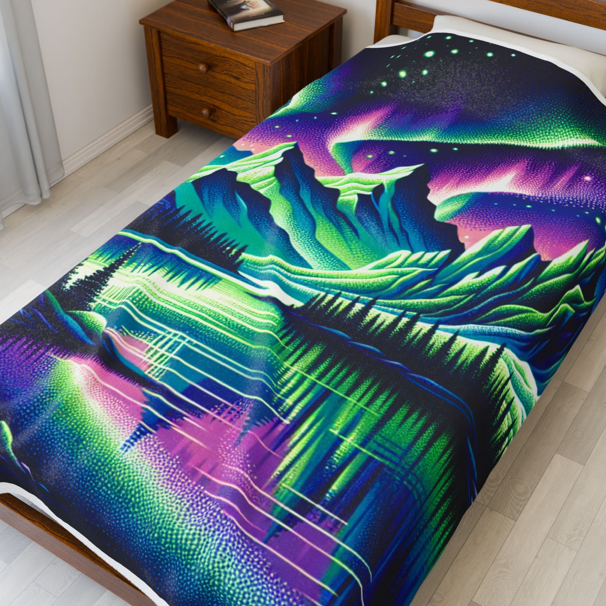 A mesmerizing blend of vivid colors illuminates a surreal mountain landscape under shimmering auroras. The reflection on the tranquil lake enhances the ethereal beauty, with detailed, luminous textures creating a captivating, otherworldly atmosphere. Create a cozy and warm atmosphere at home with this plush velveteen blanket. It is soft to touch and perfect for any home. Customize with a one-sided print to add your personal touch or create a gift for your friends and family. Available in three sizes: 30x40", 50x60", 60x80".