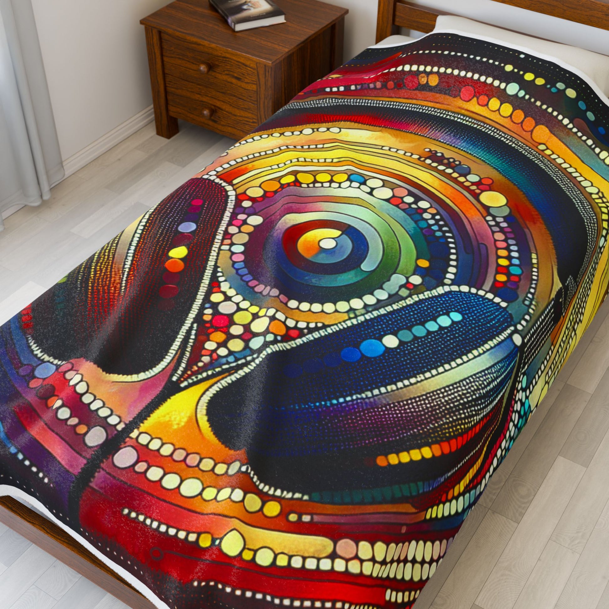 A vibrant explosion of colors forms a captivating abstract headphone silhouette, with intricate circular patterns and dotted textures, evoking a sense of rhythmic energy and musical immersion. Create a cozy and warm atmosphere at home with this plush velveteen blanket. It is soft to touch and perfect for any home. Customize with a one-sided print to add your personal touch or create a gift for your friends and family. Available in three sizes: 30x40", 50x60", 60x80".