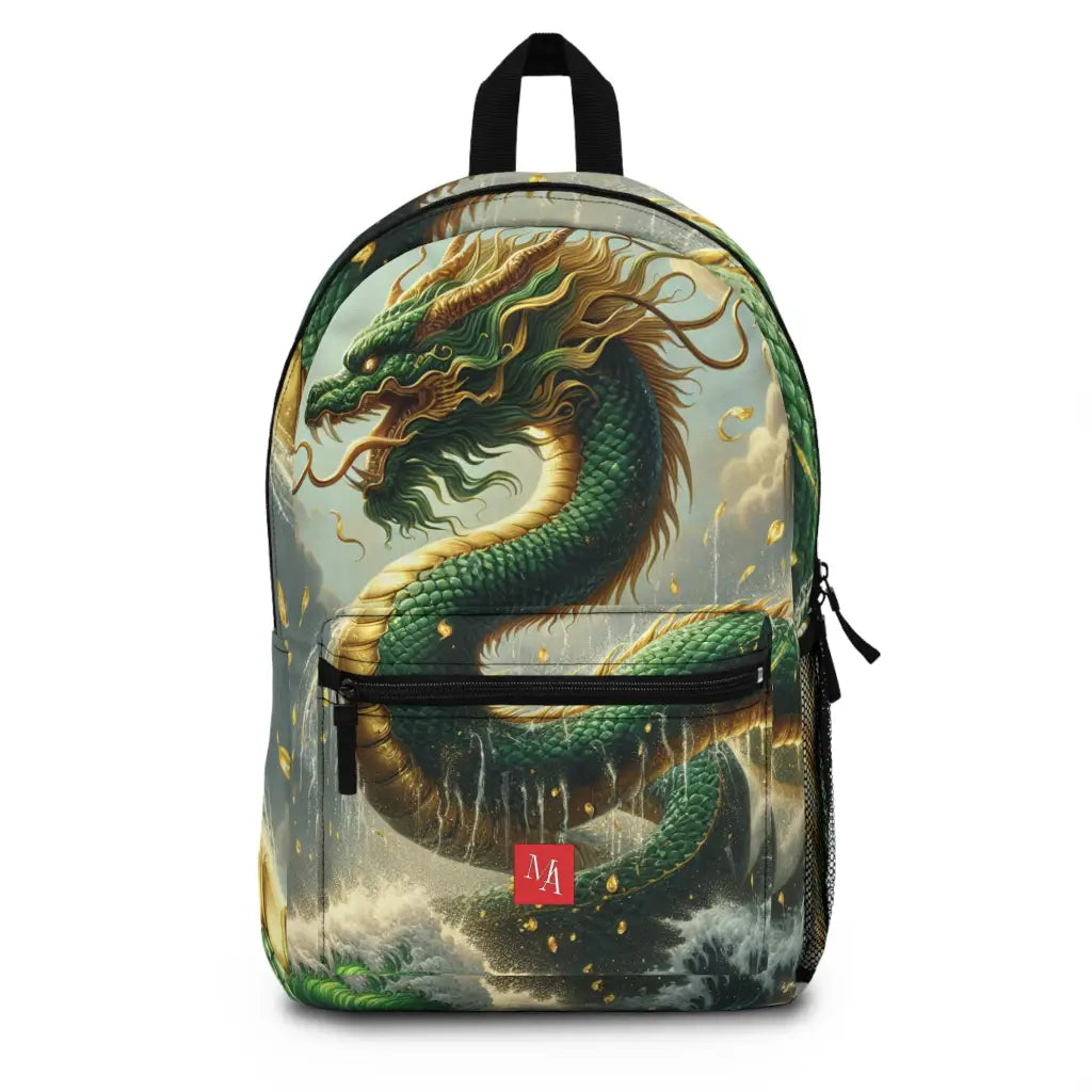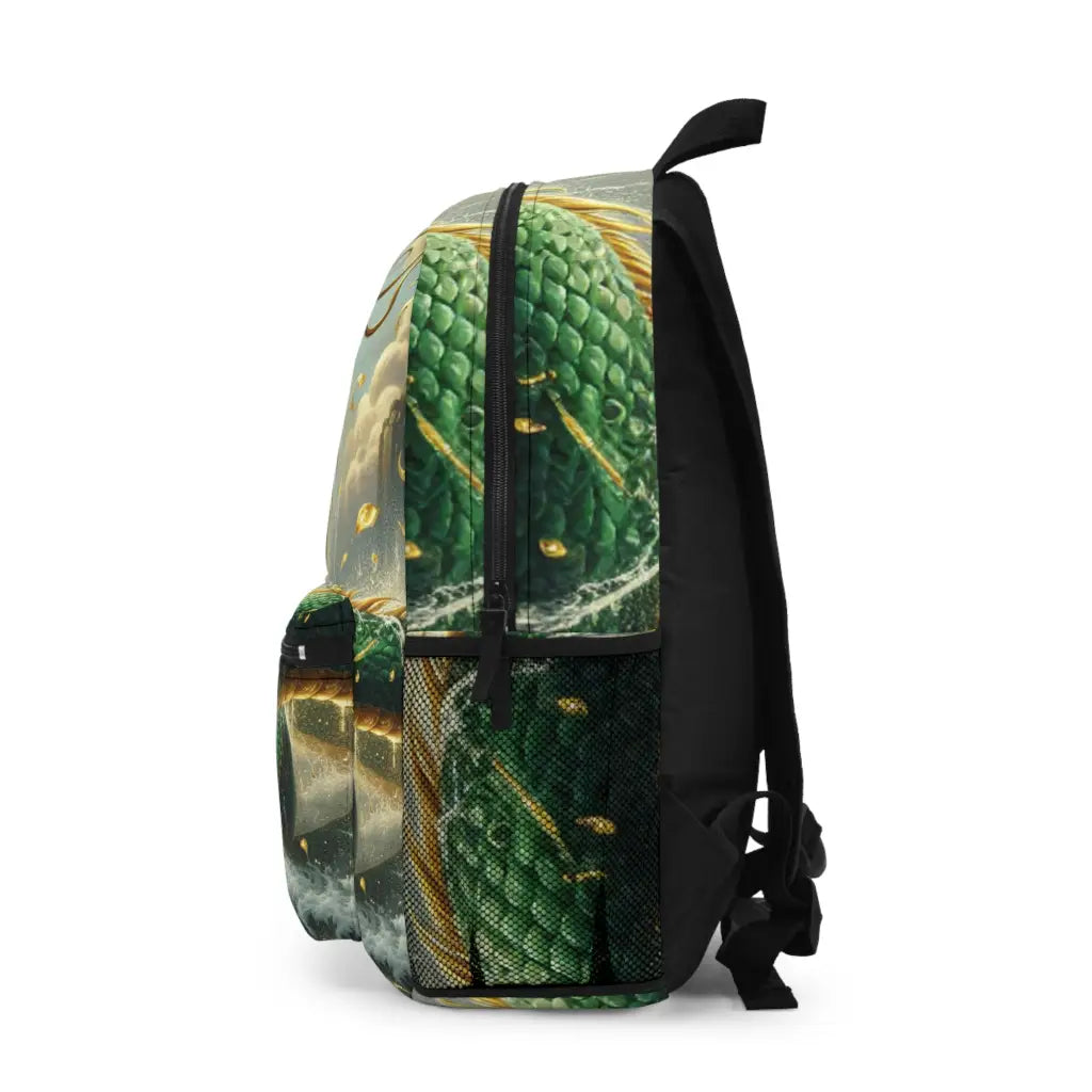This striking image portrays a majestic, serpentine dragon emerging from turbulent waves. Its iridescent scales shimmer with golden highlights, while ethereal clouds and cascading waterfalls accentuate its otherworldly presence, creating a dynamic fusion of water and sky elements. Introducing the ultimate backpack for fashion-forward adventurers! Our backpack boasts a striking textile design that will make a statement wherever you go. With its durable construction and spacious compartments, it is perfect for carrying all your essentials. Get ready to turn heads and stay organized with our backpack. #textiledesign #backpack #fashionforward #adventure #durable #spacious #statementpiece #organized #essentials #travel #explore