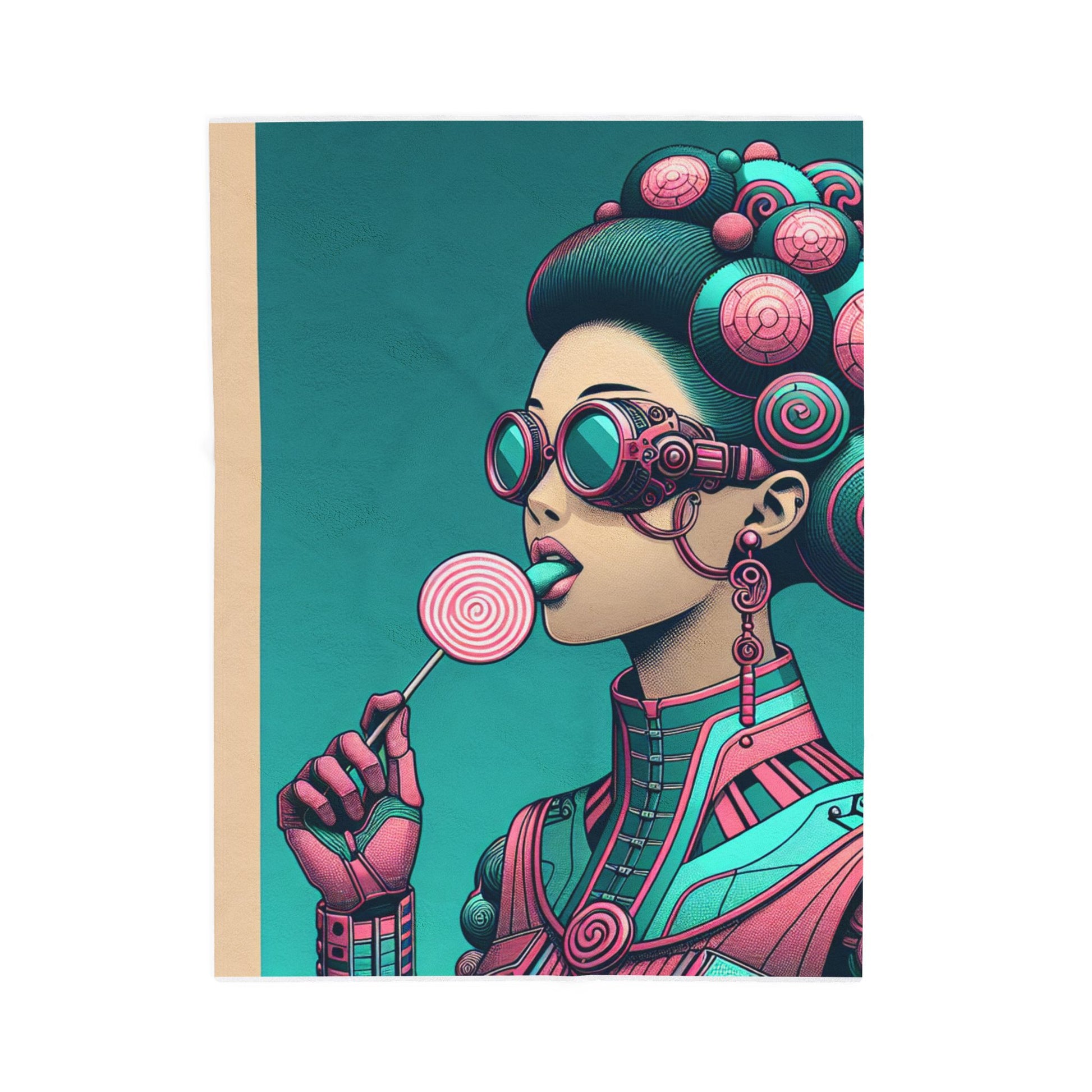A fusion of retro-futuristic and candy-themed elements, this artwork features a figure in vibrant pink and teal gear. Intricate headgear, goggles, and a lollipop add whimsical sci-fi flair, set against a striking color palette. Create a cozy and warm atmosphere at home with this plush velveteen blanket. It is soft to touch and perfect for any home. Customize with a one-sided print to add your personal touch or create a gift for your friends and family. Available in three sizes: 30x40", 50x60", 60x80".