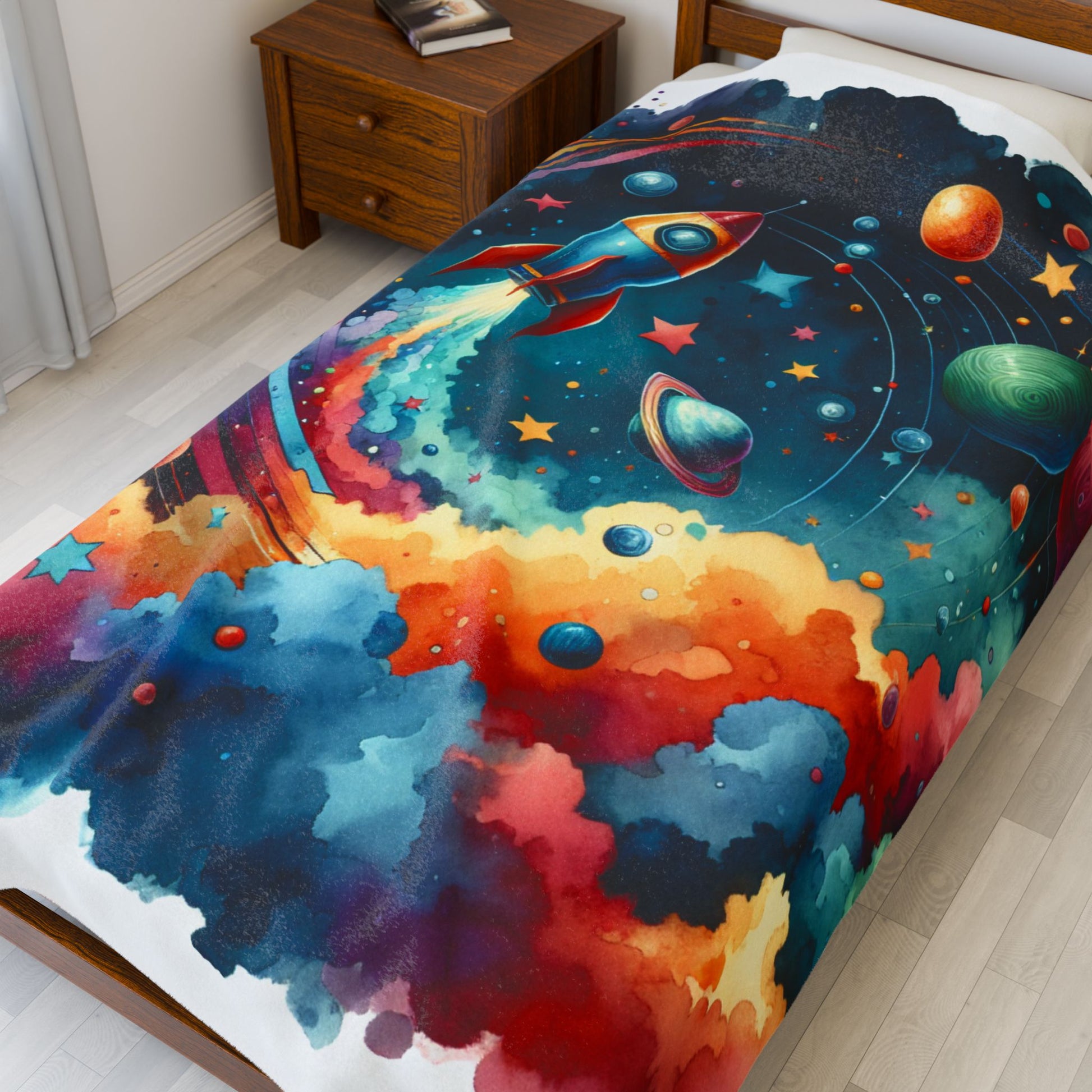 A vibrant, whimsical illustration of a rocket soaring through a colorful cosmic landscape, surrounded by swirling planets and stars. The dreamy watercolor textures and bold, lively palette evoke a sense of wonder and adventure, blending fantasy with a playful exploration of space. Create a cozy and warm atmosphere at home with this plush velveteen blanket. It is soft to touch and perfect for any home. Customize with a one-sided print to add your personal touch or create a gift for your friends and family. Available in three sizes: 30x40", 50x60", 60x80".