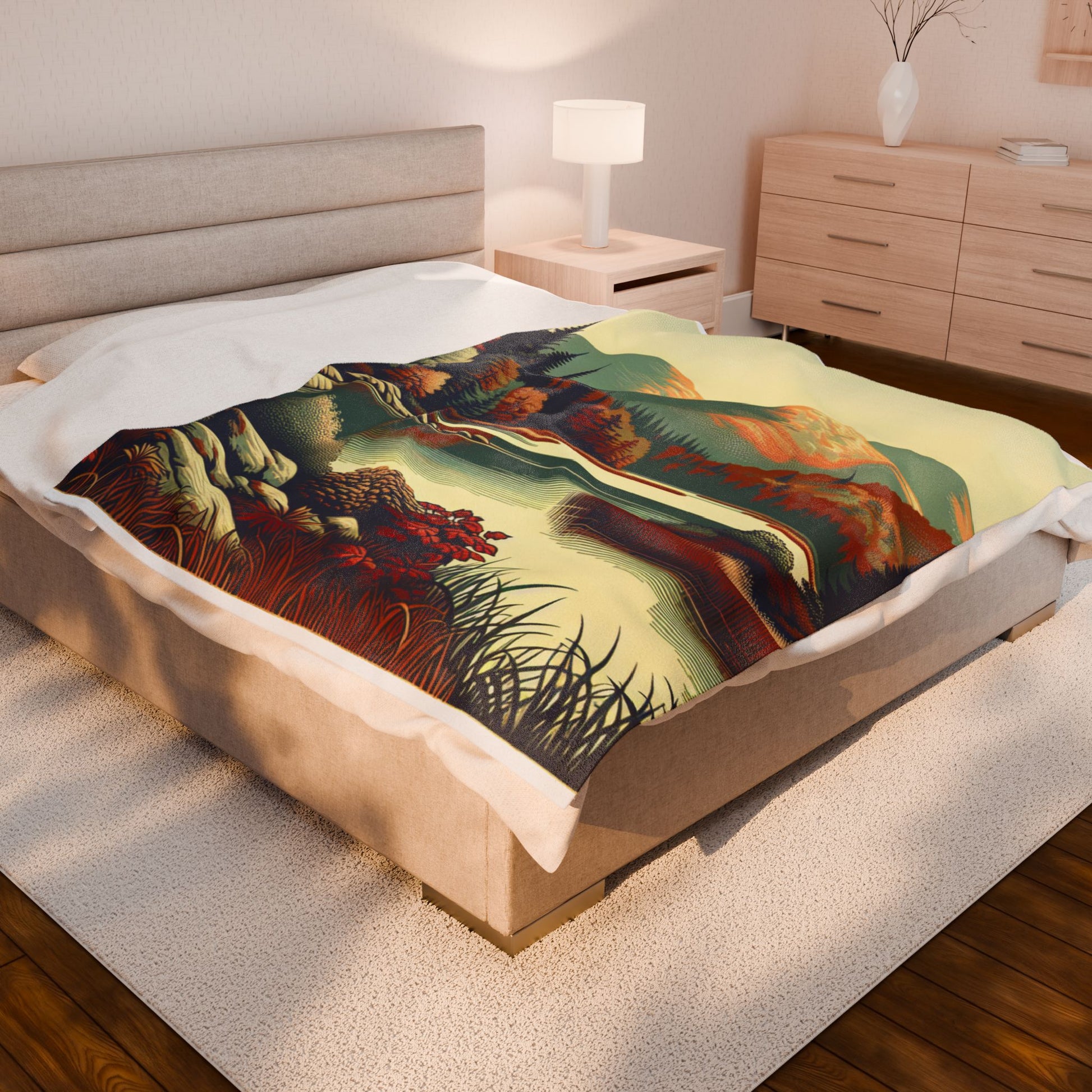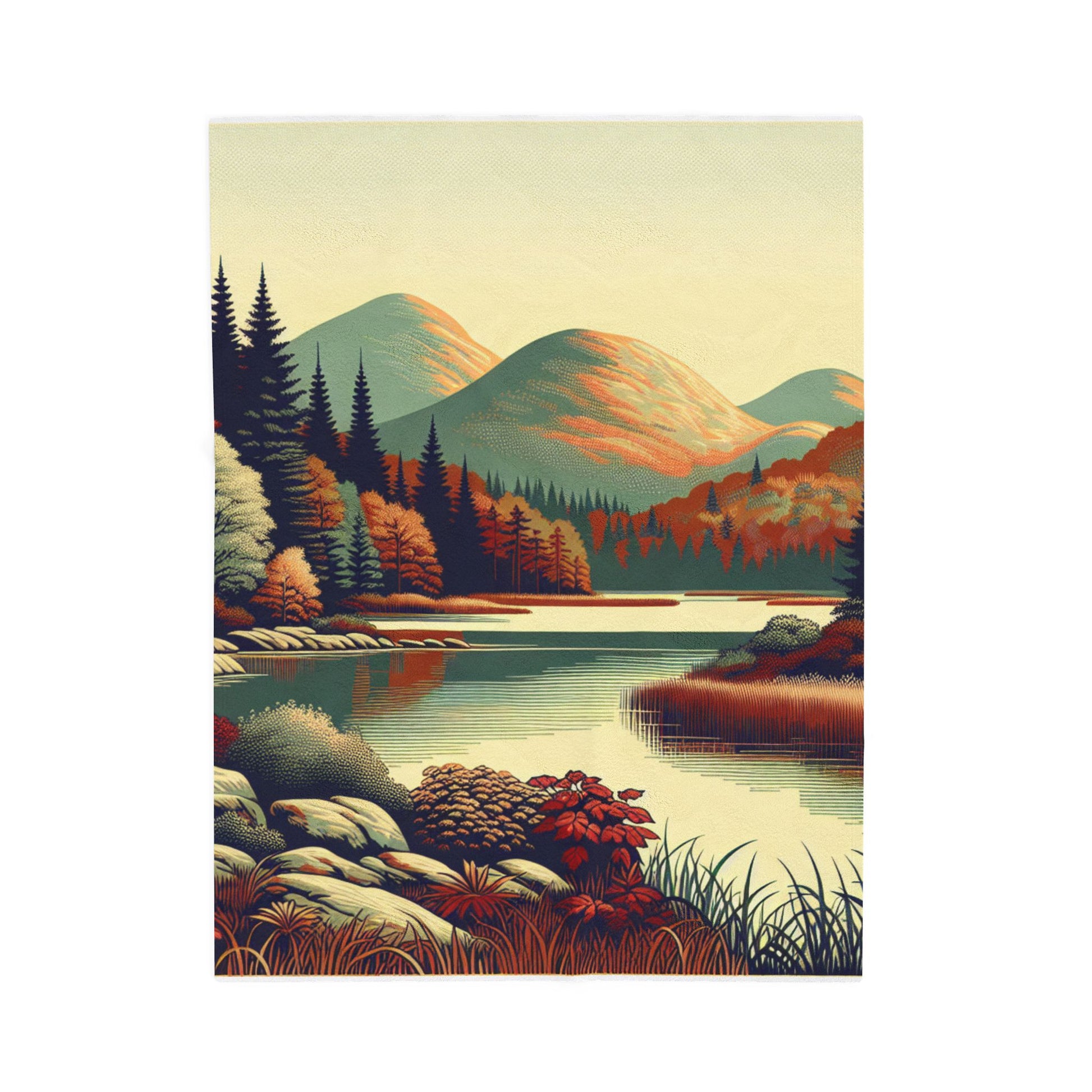 This image portrays a stylized, serene landscape with a retro color palette, featuring a calm lake, layered hills, and diverse foliage that evokes a nostalgic, autumnal vibe. Distinct textures and patterns impart a vintage, screen-printed appearance, crafting a tapestry of nature's tranquility. Create a cozy and warm atmosphere at home with this plush velveteen blanket. It is soft to touch and perfect for any home. Customize with a one-sided print to add your personal touch or create a gift for your friends and family. Available in three sizes: 30x40", 50x60", 60x80".