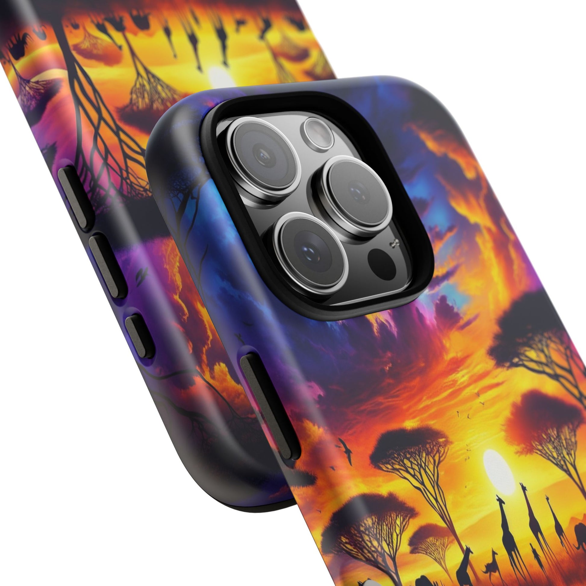 A vibrant sunset silhouettes wildlife against a fiery sky with purples and oranges, reflected in a mirrored water surface. The acacia trees and diverse animal silhouettes evoke a serene, magical African landscape. iPhone, Samsung Galaxy, and Google Pixel devices with premium-quality custom protective phone cases. Every case has double layers for extra durability and protection while the clear, open ports stay out of your way when it comes to charging. The outer polycarbonate shell will resist daily impacts. Choose between matte or glossy finish and enjoy adding a unique touch to your phone with our custom protective phone cases sourced from Korea.