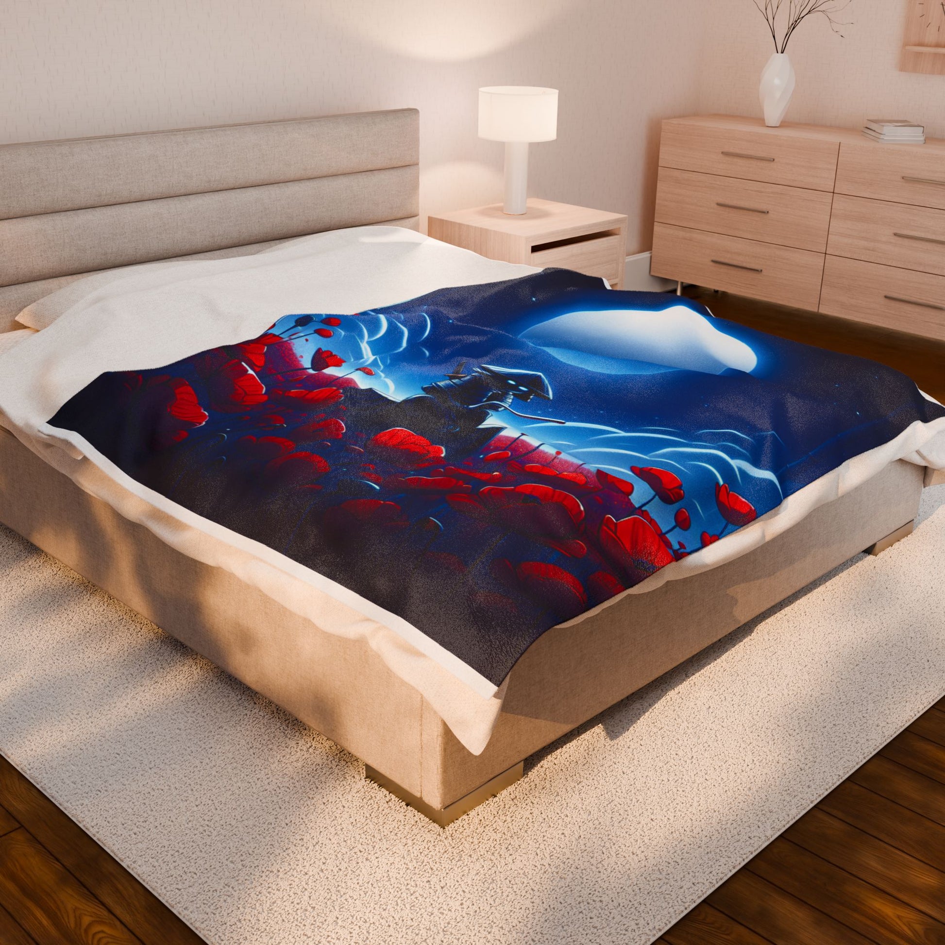 Amidst vibrant red poppies, a serene samurai meditates under a luminous, full moon, flanked by graceful bamboo. The ethereal blend of deep blues and bright reds creates a striking contrast, evoking mysticism and tranquility in this enchanting, dreamlike scene. Create a cozy and warm atmosphere at home with this plush velveteen blanket. It is soft to touch and perfect for any home. Customize with a one-sided print to add your personal touch or create a gift for your friends and family. Available in three sizes: 30x40", 50x60", 60x80".