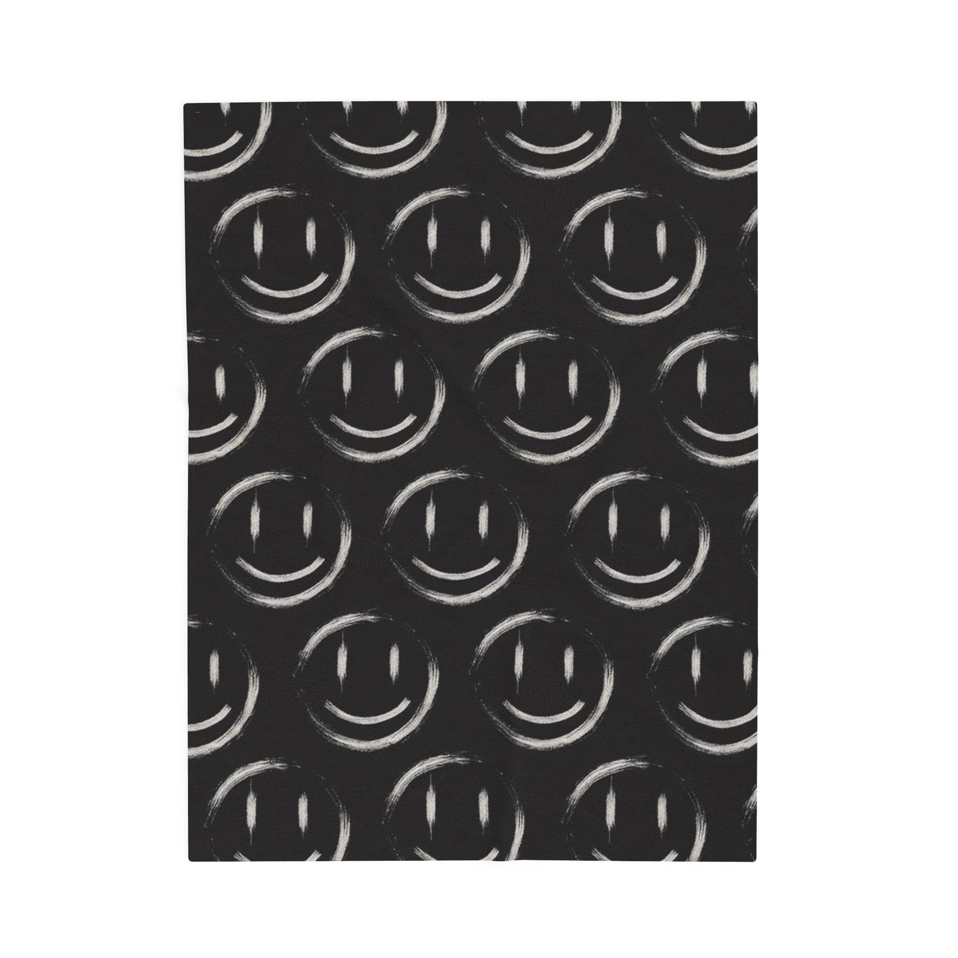 A minimalist depiction of happiness, the image features a simple pattern of white smiley faces set against a vast black background, emphasizing the power of simplicity and evoking a sense of joy in minimalism. Create a cozy and warm atmosphere at home with this plush velveteen blanket. It is soft to touch and perfect for any home. Customize with a one-sided print to add your personal touch or create a gift for your friends and family. Available in three sizes: 30x40", 50x60", 60x80".