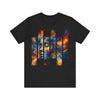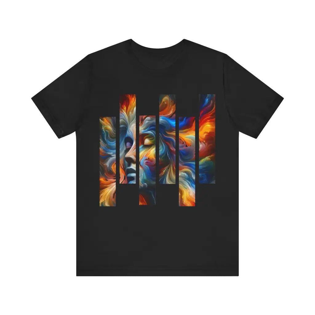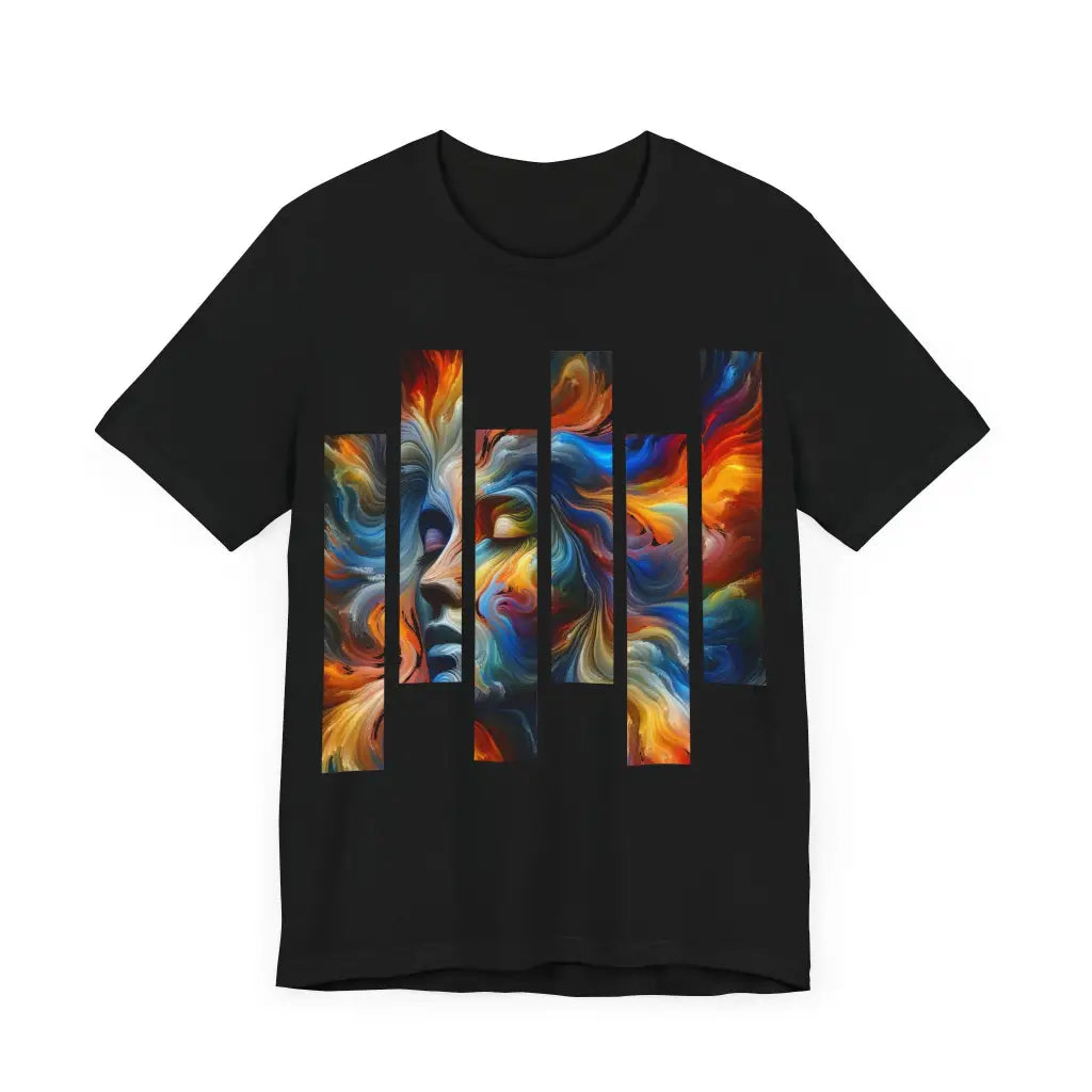 A mesmerizing fusion of colors and textures, this image portrays a serene face through swirling, vibrant strokes. The segmented panels enhance its dynamic flow, creating an evocative, abstract masterpiece that feels both alive and contemplative.. This classic unisex jersey short sleeve tee fits like a well-loved favorite. Soft cotton and quality print make users fall in love with it over and over again. These t-shirts have-ribbed knit collars to bolster shaping. The shoulders are tapered for a better fit over time. Dual side seams hold the garment's shape for longer.