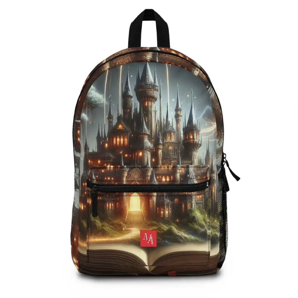 An enchanting castle emerges from the pages of an open book, bathed in ethereal light. Surrounded by mystical, glowing trees, the scene blends imagination and reality, evoking a sense of wonder and storytelling magic. Introducing the ultimate backpack for fashion-forward adventurers! Our backpack boasts a striking textile design that will make a statement wherever you go. With its durable construction and spacious compartments, it is perfect for carrying all your essentials. Get ready to turn heads and stay organized with our backpack. #textiledesign #backpack #fashionforward #adventure #durable #spacious #statementpiece #organized #essentials #travel #explore