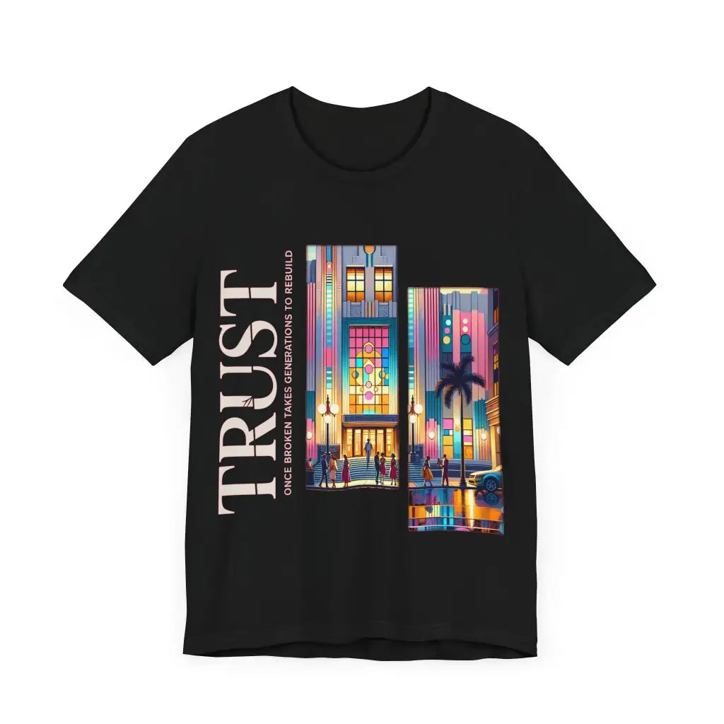 Art Deco architecture beams in vibrant pastels, emphasizing trust's fragility and endurance. Elegant figures meander under luminous glasswork, reflecting an era's opulence. Poignant typography complements the visual narrative, inviting contemplation.. This classic unisex jersey short sleeve tee fits like a well-loved favorite. Soft cotton and quality print make users fall in love with it over and over again. These t-shirts have-ribbed knit collars to bolster shaping. The shoulders are tapered for a better fit over time. Dual side seams hold the garment's shape for longer.