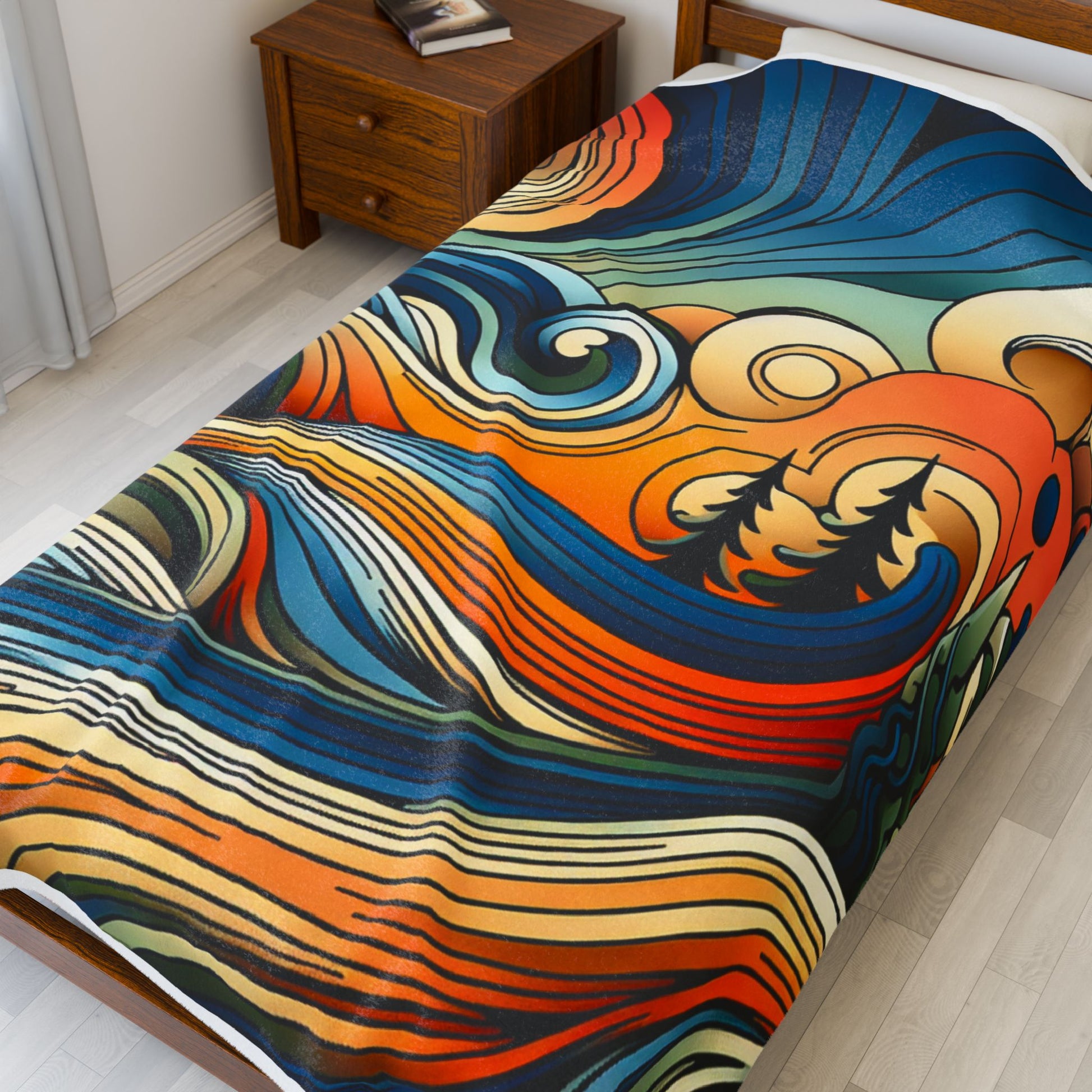 Vibrant swirling colors create a harmonious landscape, blending waves of blue, orange, and green. Stylized trees rise amidst dynamic curves, evoking movement and energy. The abstract composition captures nature's essence in a playful, dreamlike manner, inviting exploration and imaginative interpretation. Create a cozy and warm atmosphere at home with this plush velveteen blanket. It is soft to touch and perfect for any home. Customize with a one-sided print to add your personal touch or create a gift for your friends and family. Available in three sizes: 30x40", 50x60", 60x80".