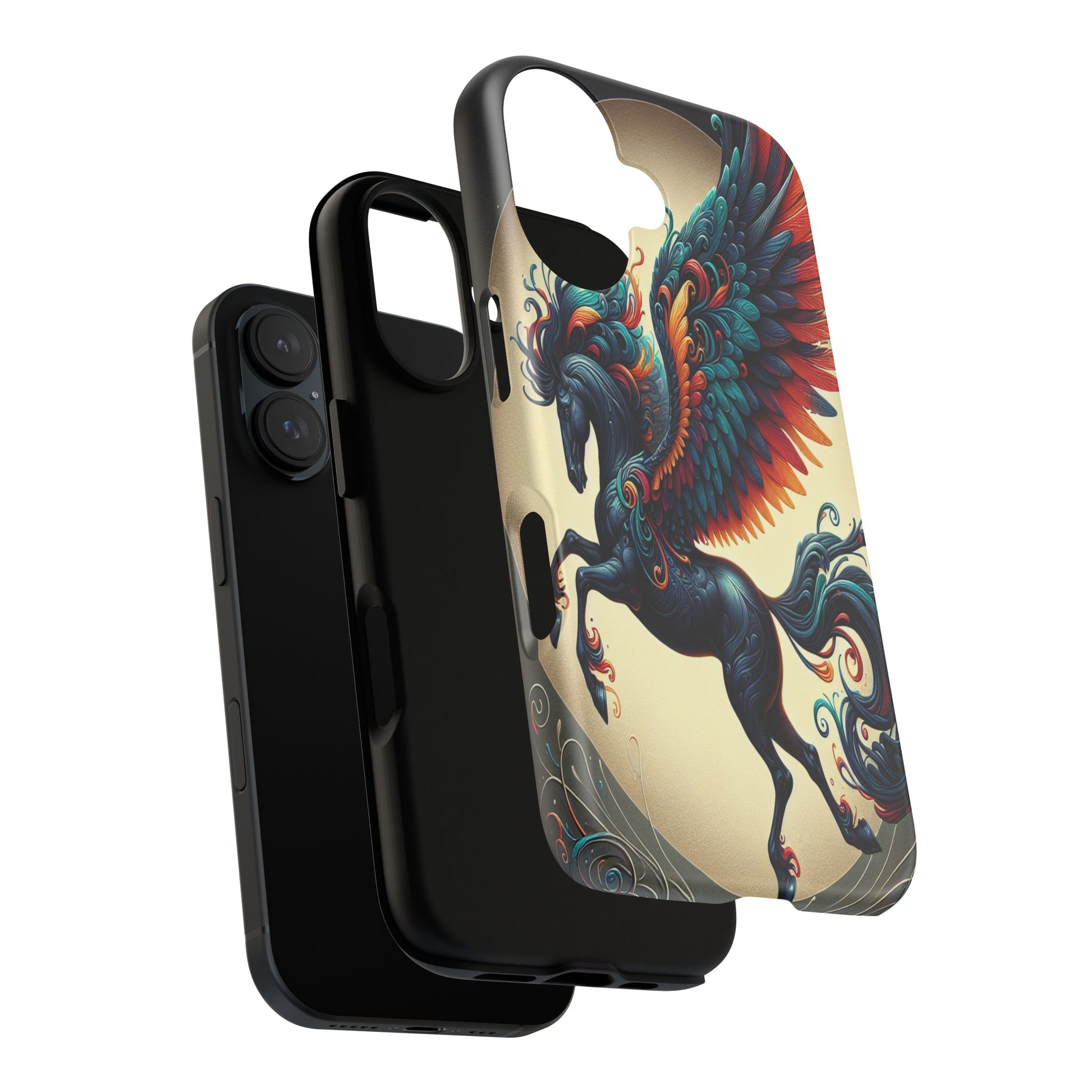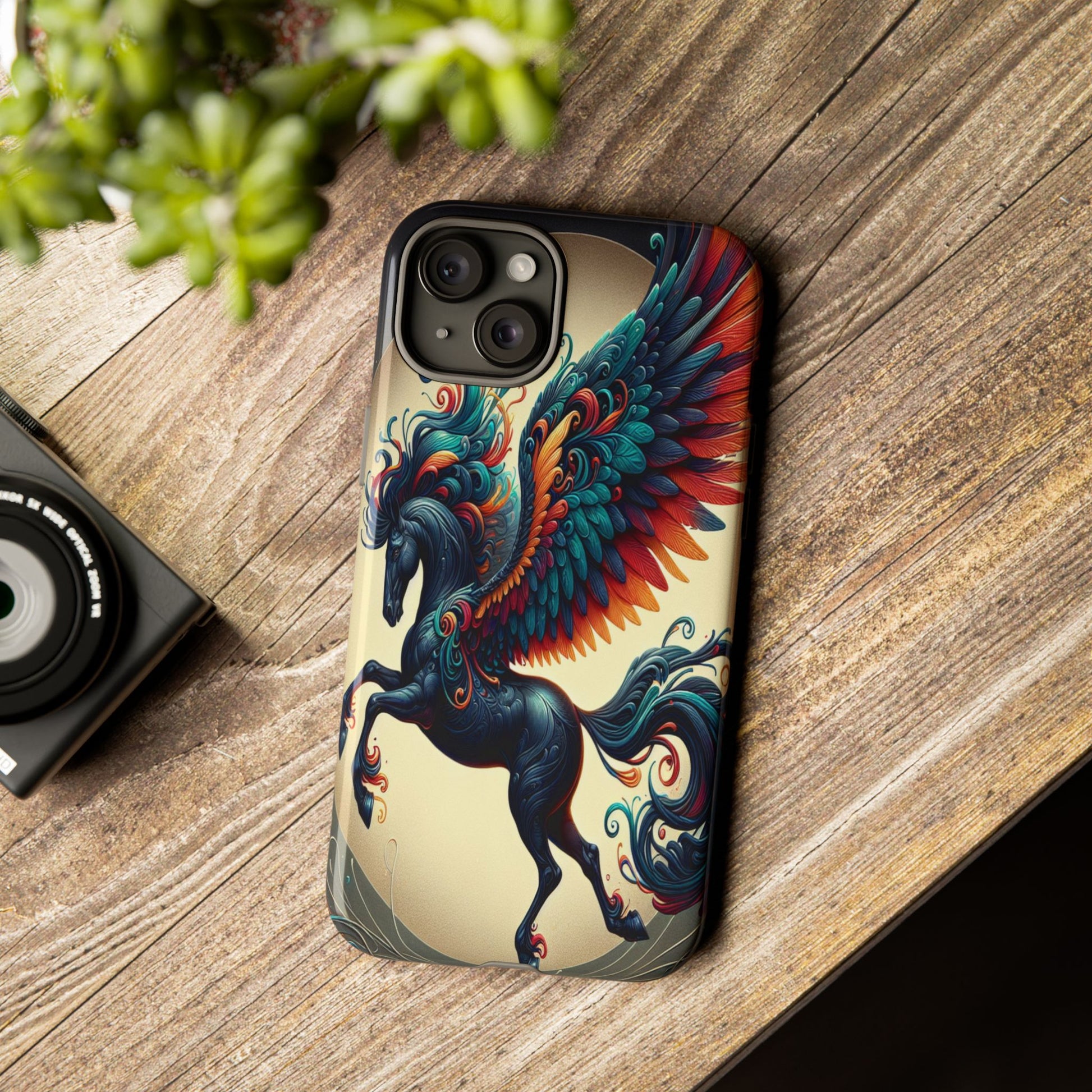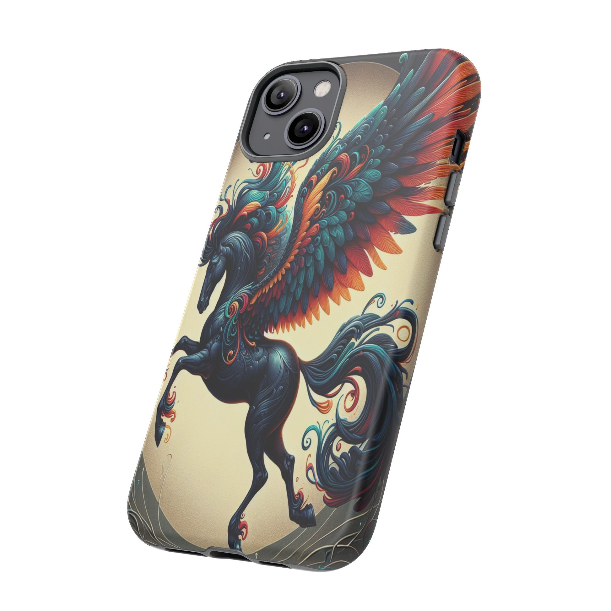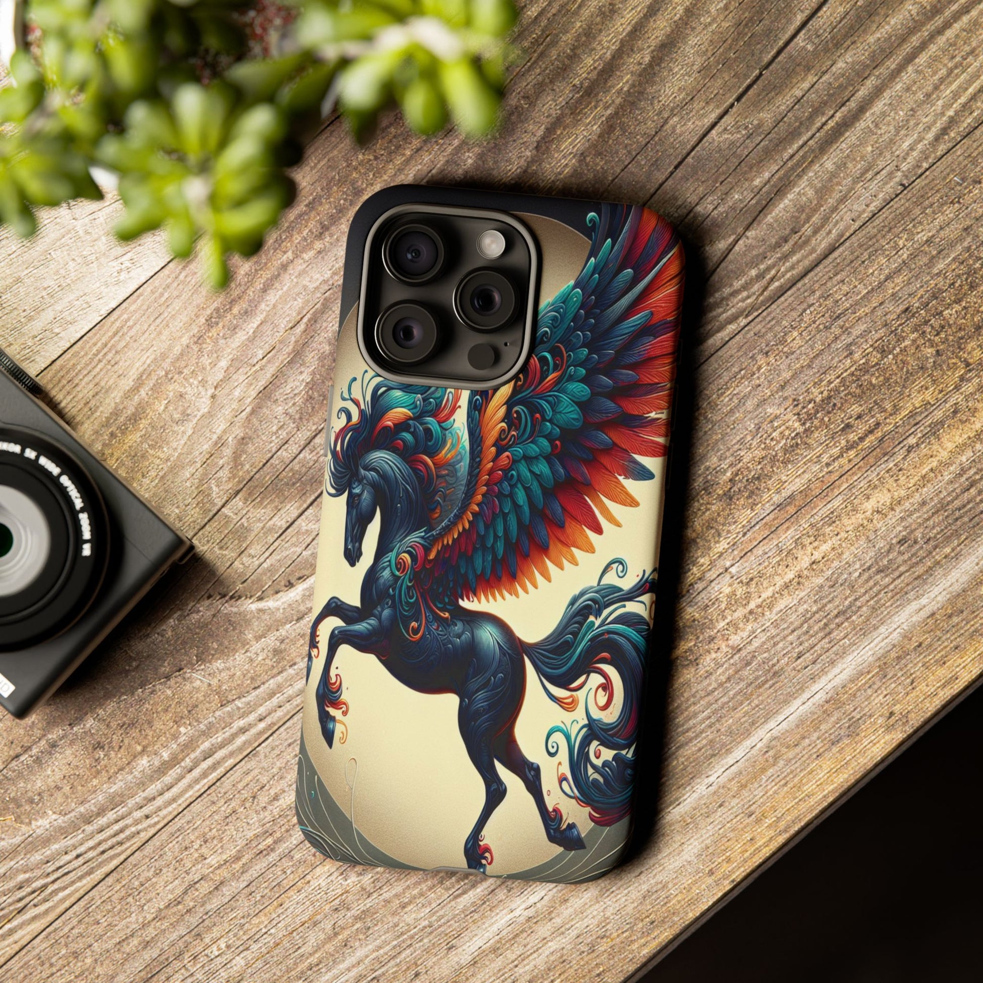 A vibrant Pegasus with intricately detailed feathers and swirling mane soars against a luminous backdrop. Bold, swirling colors in teal and orange create a mesmerizing, dynamic effect, seamlessly blending mythical elegance with modern artistry. iPhone, Samsung Galaxy, and Google Pixel devices with premium-quality custom protective phone cases. Every case has double layers for extra durability and protection while the clear, open ports stay out of your way when it comes to charging. The outer polycarbonate shell will resist daily impacts. Choose between matte or glossy finish and enjoy adding a unique touch to your phone with our custom protective phone cases sourced from Korea.