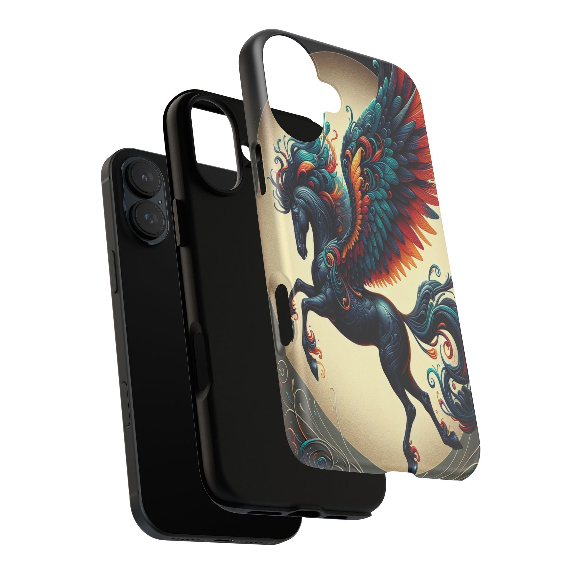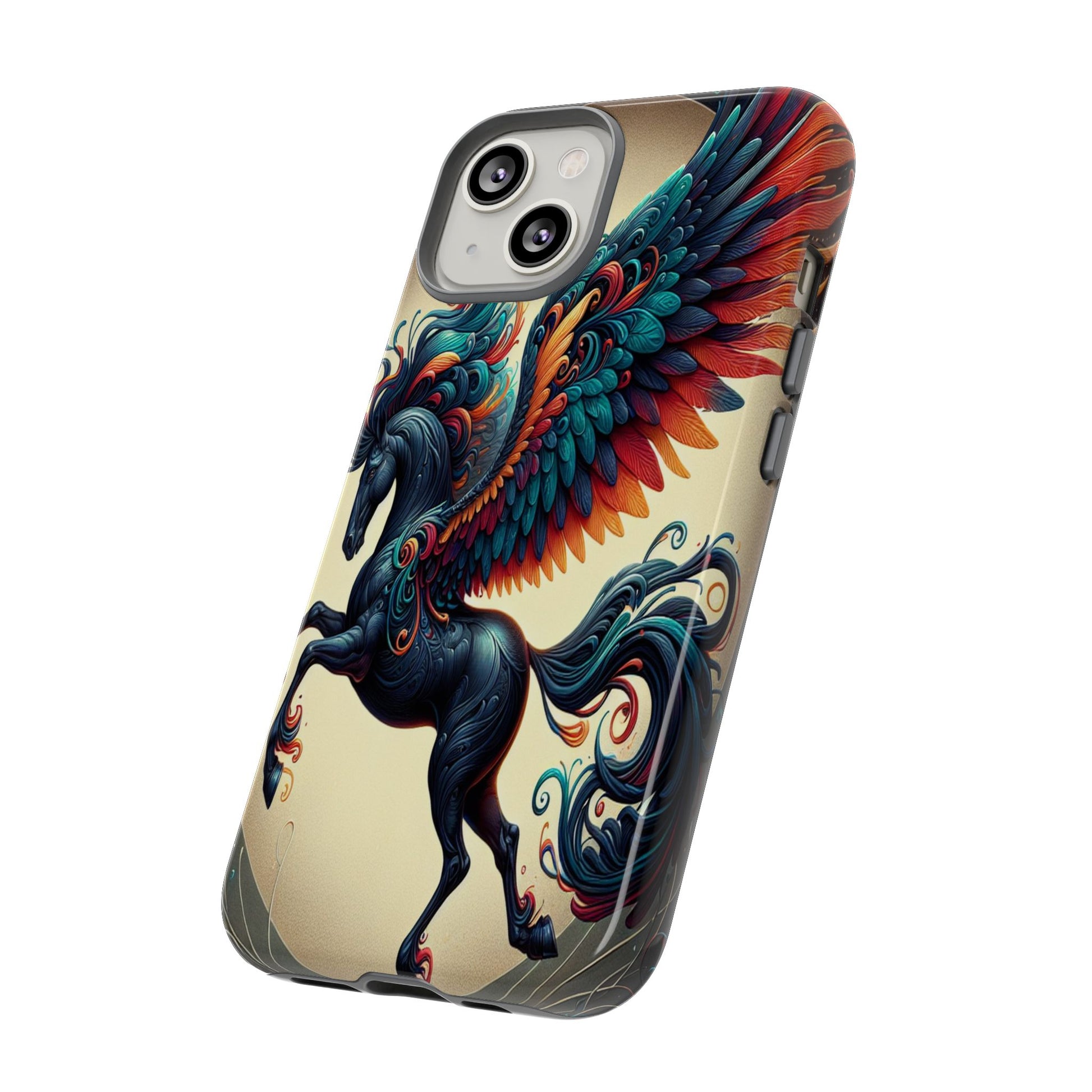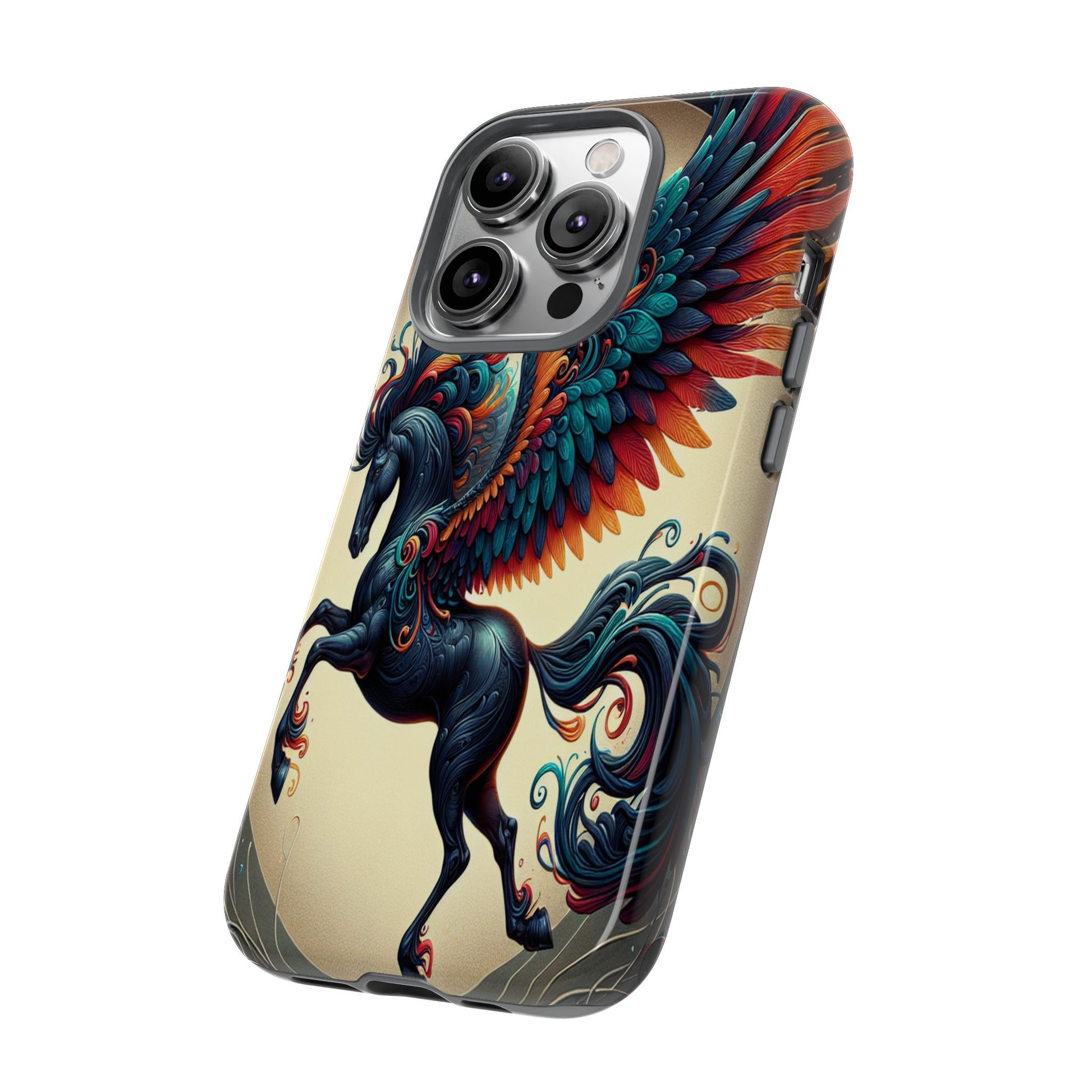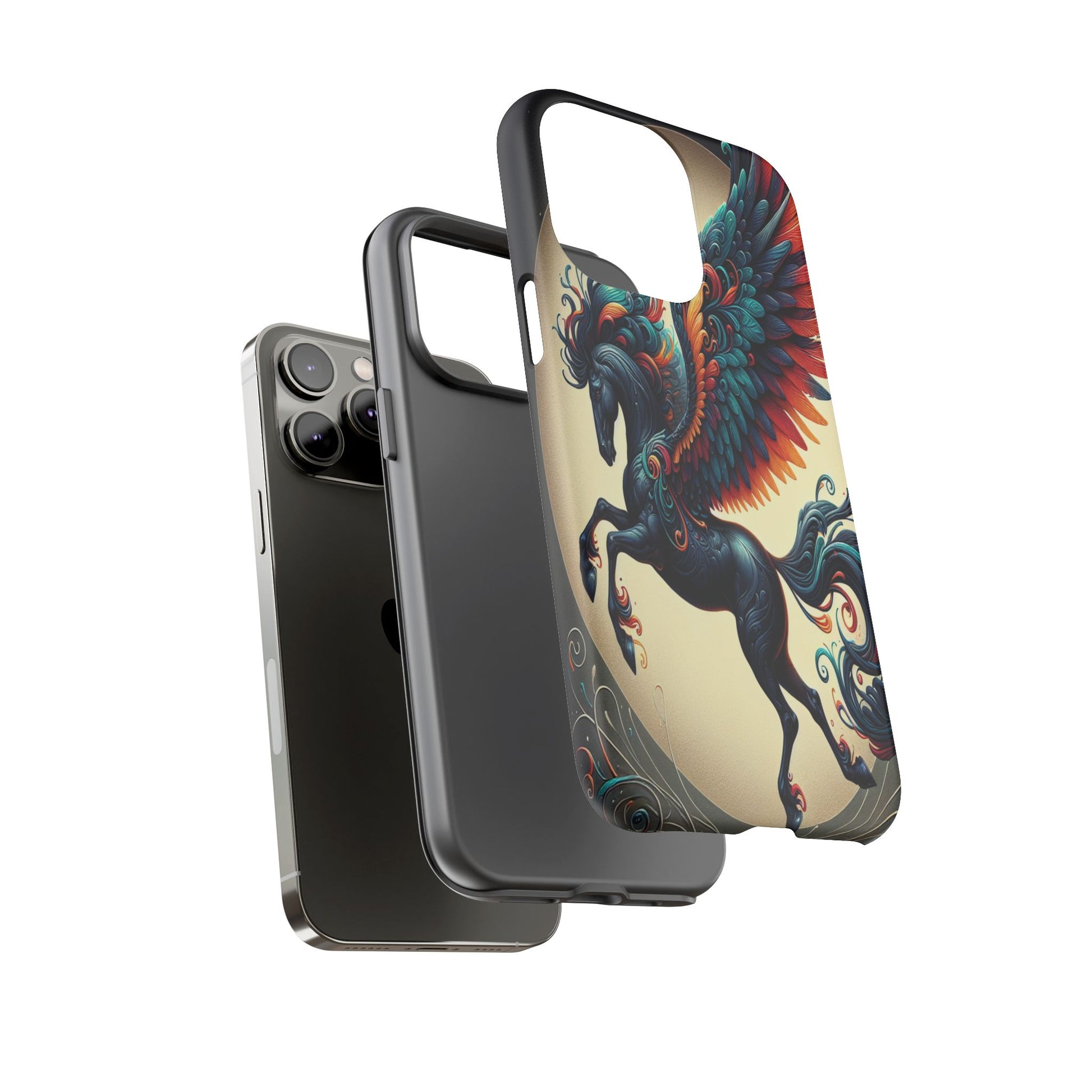 A vibrant Pegasus with intricately detailed feathers and swirling mane soars against a luminous backdrop. Bold, swirling colors in teal and orange create a mesmerizing, dynamic effect, seamlessly blending mythical elegance with modern artistry. iPhone, Samsung Galaxy, and Google Pixel devices with premium-quality custom protective phone cases. Every case has double layers for extra durability and protection while the clear, open ports stay out of your way when it comes to charging. The outer polycarbonate shell will resist daily impacts. Choose between matte or glossy finish and enjoy adding a unique touch to your phone with our custom protective phone cases sourced from Korea.