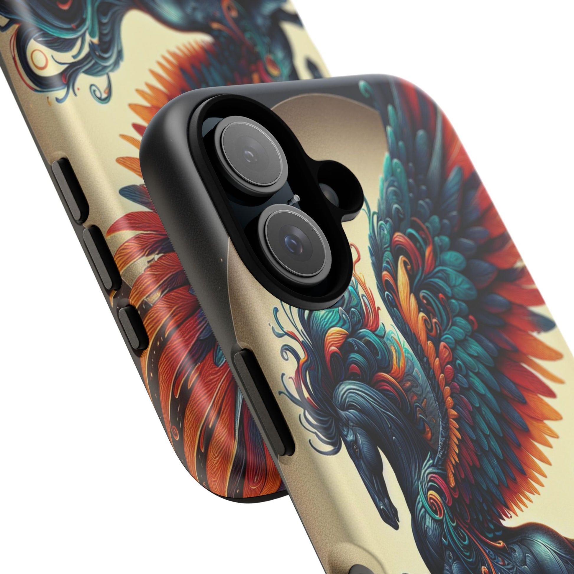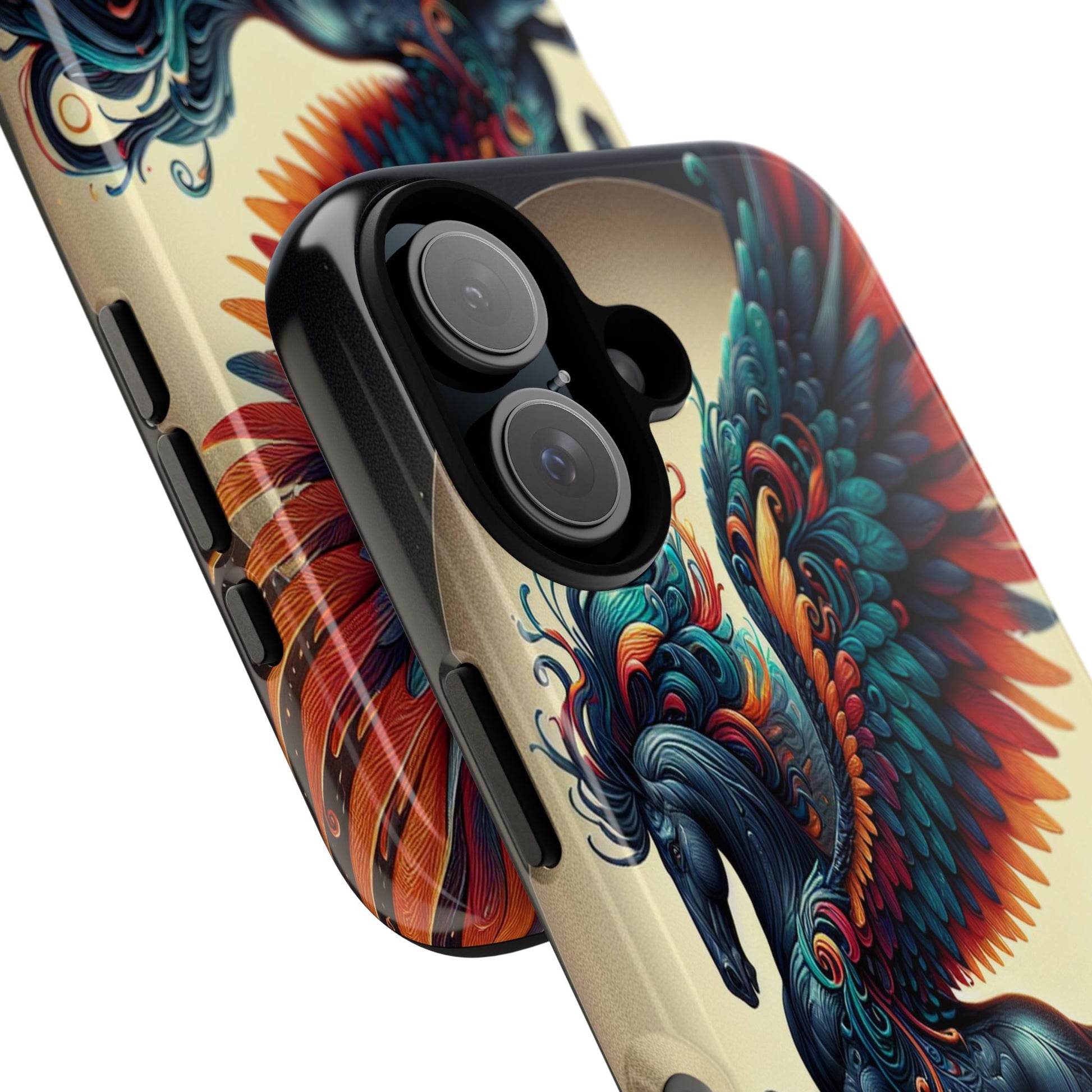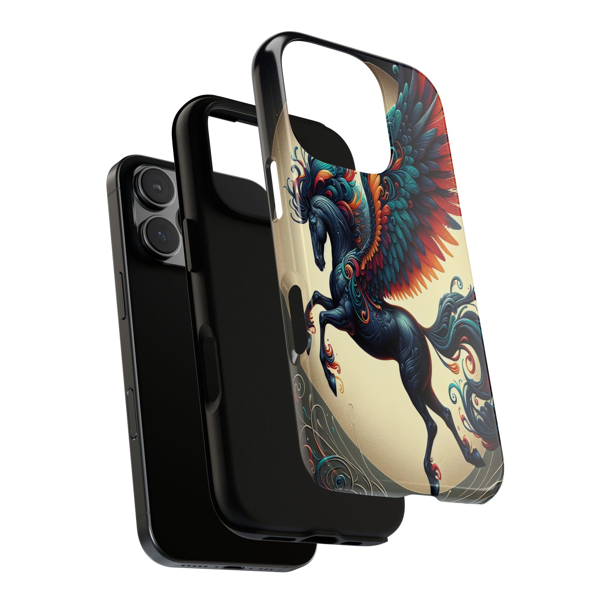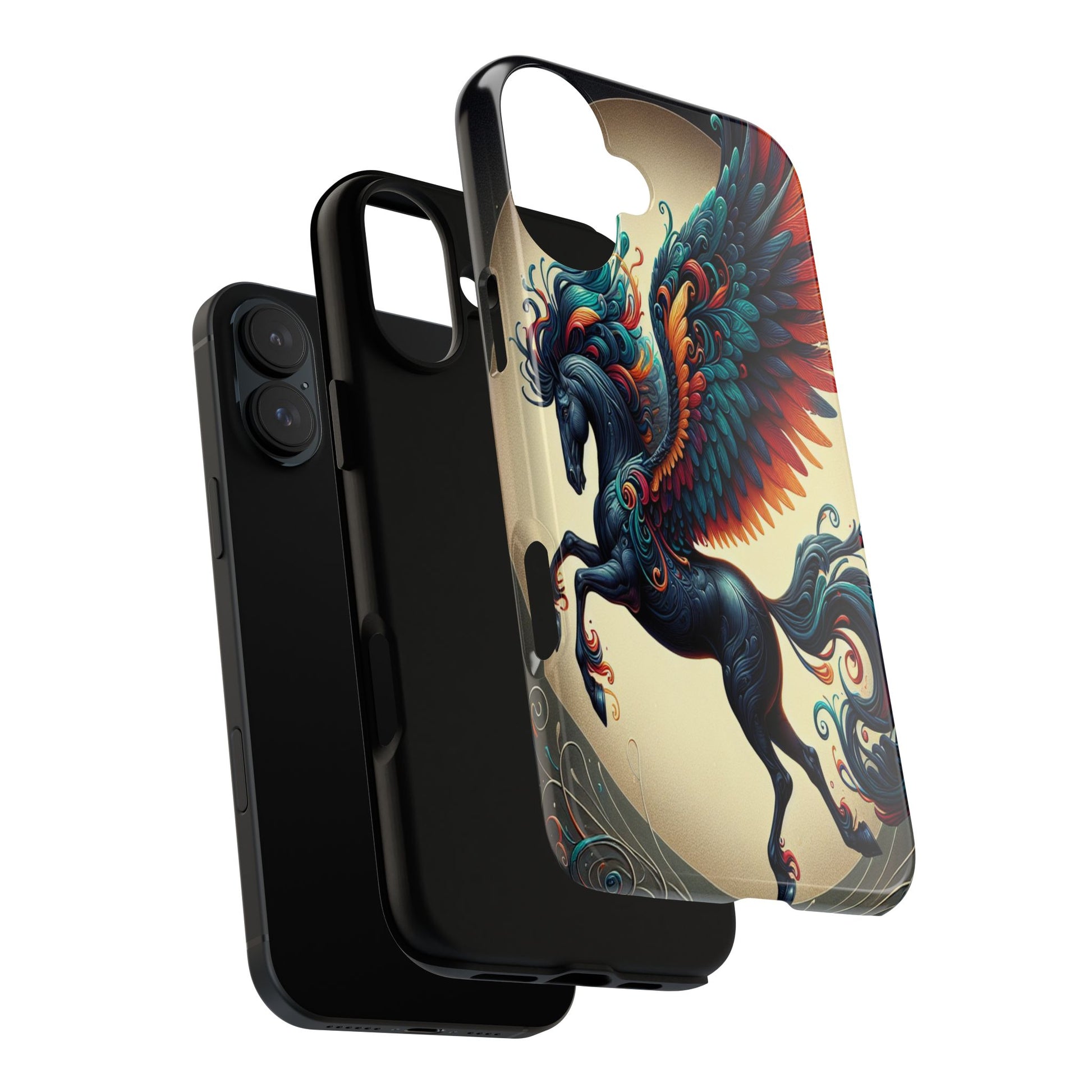 A vibrant Pegasus with intricately detailed feathers and swirling mane soars against a luminous backdrop. Bold, swirling colors in teal and orange create a mesmerizing, dynamic effect, seamlessly blending mythical elegance with modern artistry. iPhone, Samsung Galaxy, and Google Pixel devices with premium-quality custom protective phone cases. Every case has double layers for extra durability and protection while the clear, open ports stay out of your way when it comes to charging. The outer polycarbonate shell will resist daily impacts. Choose between matte or glossy finish and enjoy adding a unique touch to your phone with our custom protective phone cases sourced from Korea.