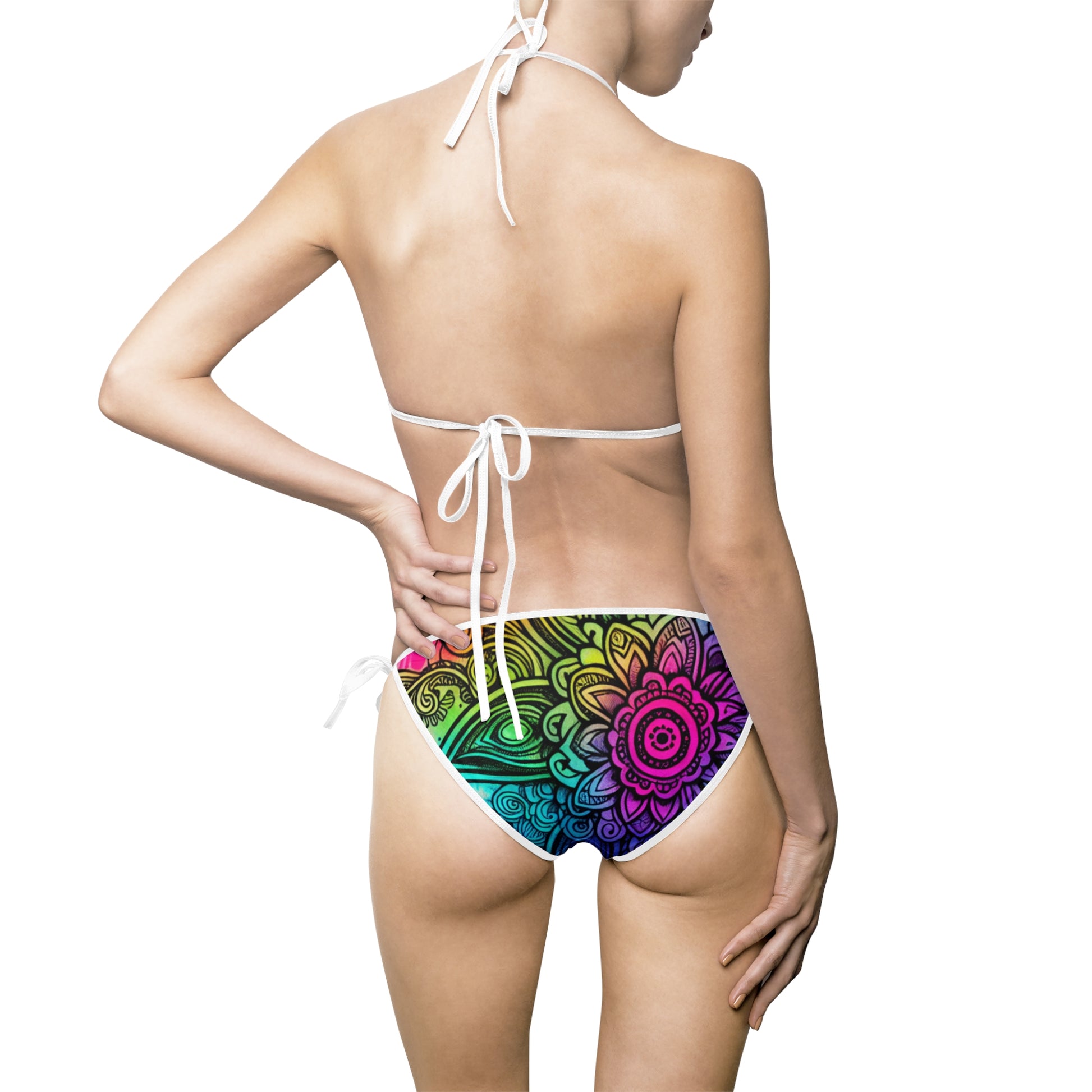 A vibrant mandala bursts with color from neon markers and rich acrylics, showcasing the intricate dance of creativity and the delight of artistic expression on a textured canvas. This bikini swimsuit is designed for fashionable women, it is stylish with a personalized touch. Because of an advanced heat sublimation technique, it will not fade in water.