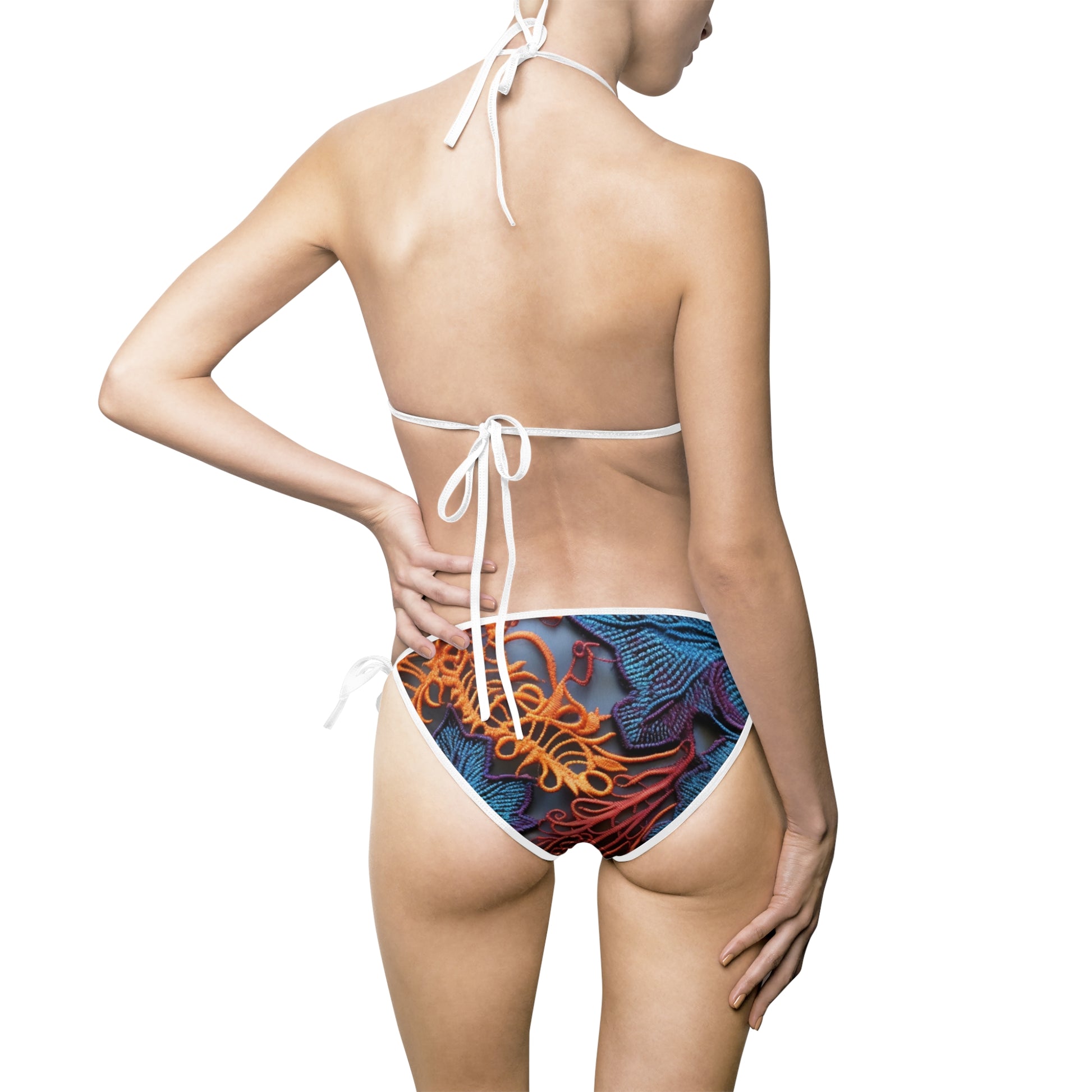This image captures the intricate texture of embroidered lace, showcasing a dynamic color gradient that transitions from a warm orange to a cool blue, highlighting the complexity and craftsmanship of the stitchwork. This bikini swimsuit is designed for fashionable women, it is stylish with a personalized touch. Because of an advanced heat sublimation technique, it will not fade in water.