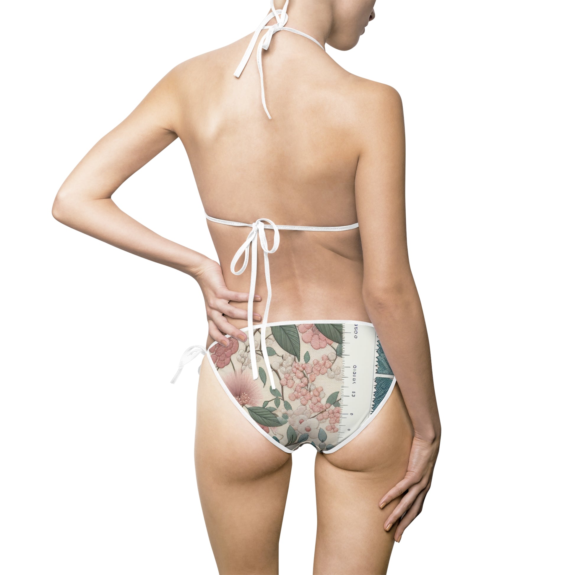 An intricately detailed fabric design merges delicate floral elements with geometric patterns. A soft, pastel color palette enhances the blend of cultural motifs, suggesting a seamless fusion of traditions within a textile narrative. This bikini swimsuit is designed for fashionable women, it is stylish with a personalized touch. Because of an advanced heat sublimation technique, it will not fade in water.